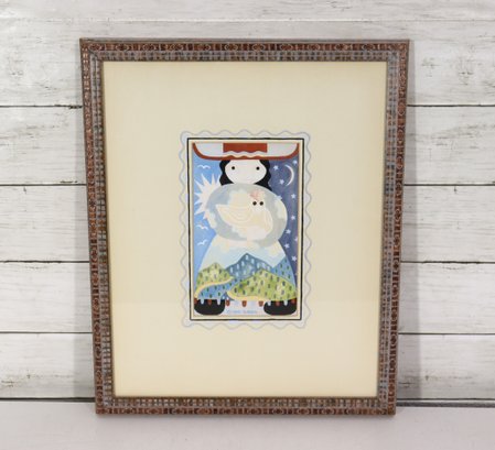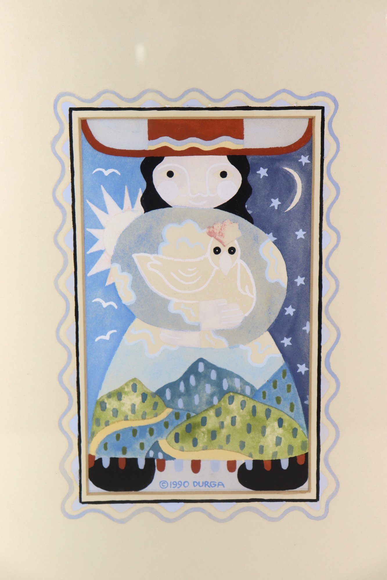 1990 artwork by Durga, beautifully presented in its original frame. This whimsical folk-style composition features a serene, dreamlike figure holding an owl, set against rolling hills and a night sky filled with playful detail and soft color.