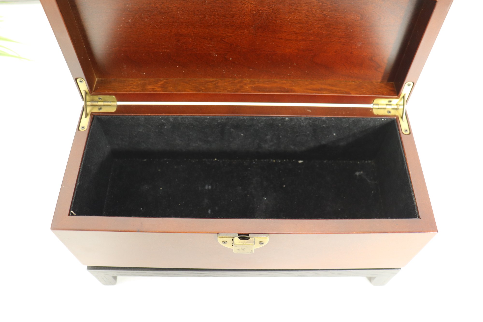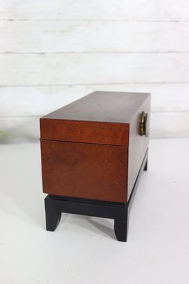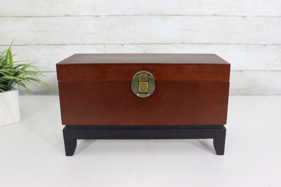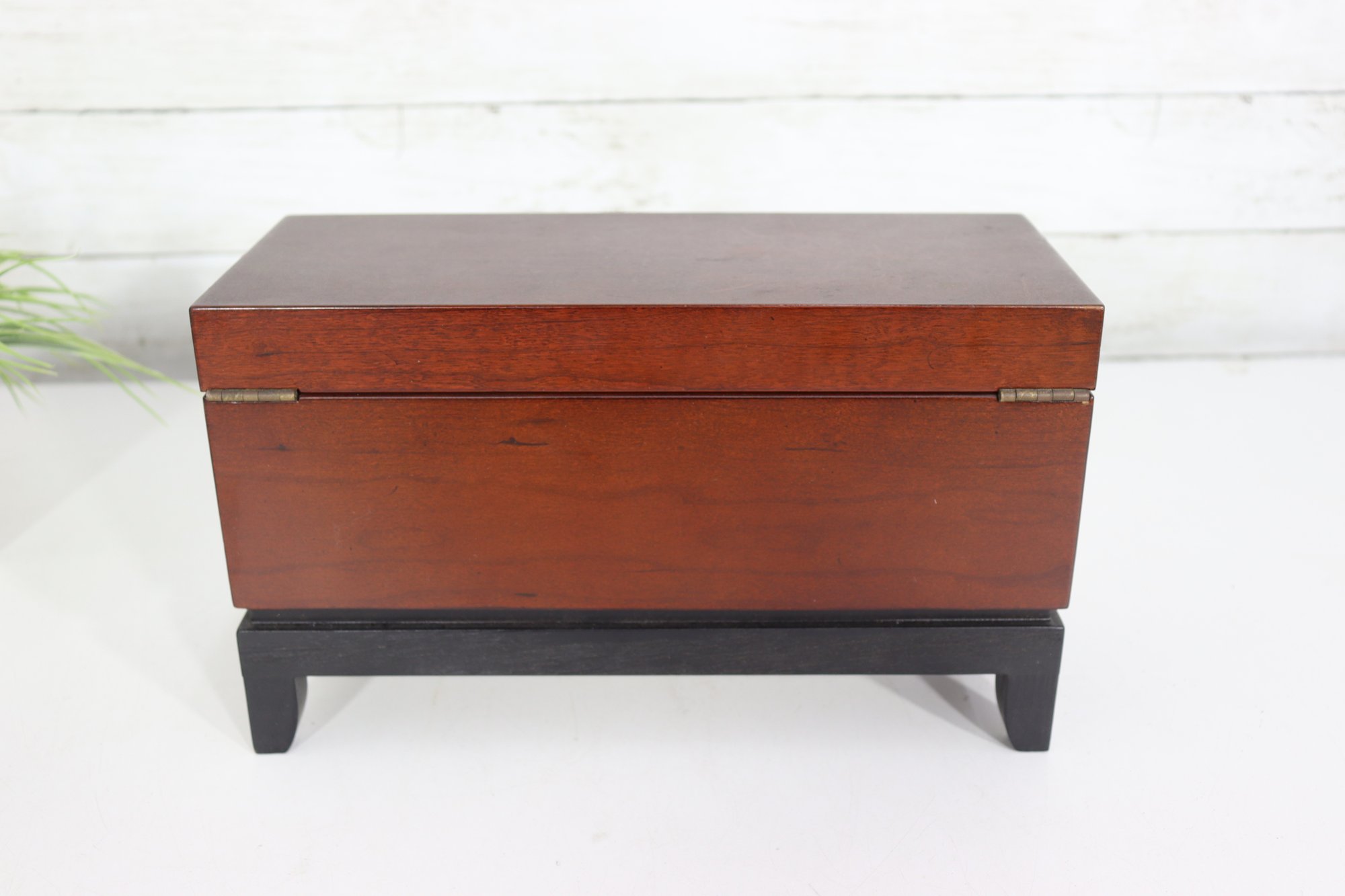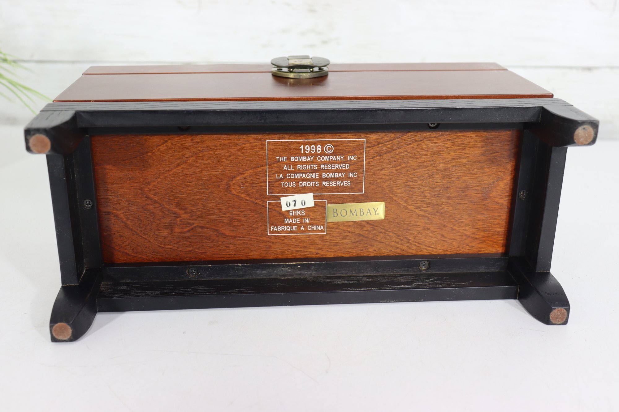 Vintage 1998 Bombay Company wooden jewelry / keepsake storage box with removable stand base. Beautiful classic Bombay styling featuring rich wood finish, brass locking hardware, and black felt-lined interior. The box sits elevated on its fitted black wood stand giving it a more elegant display presence.