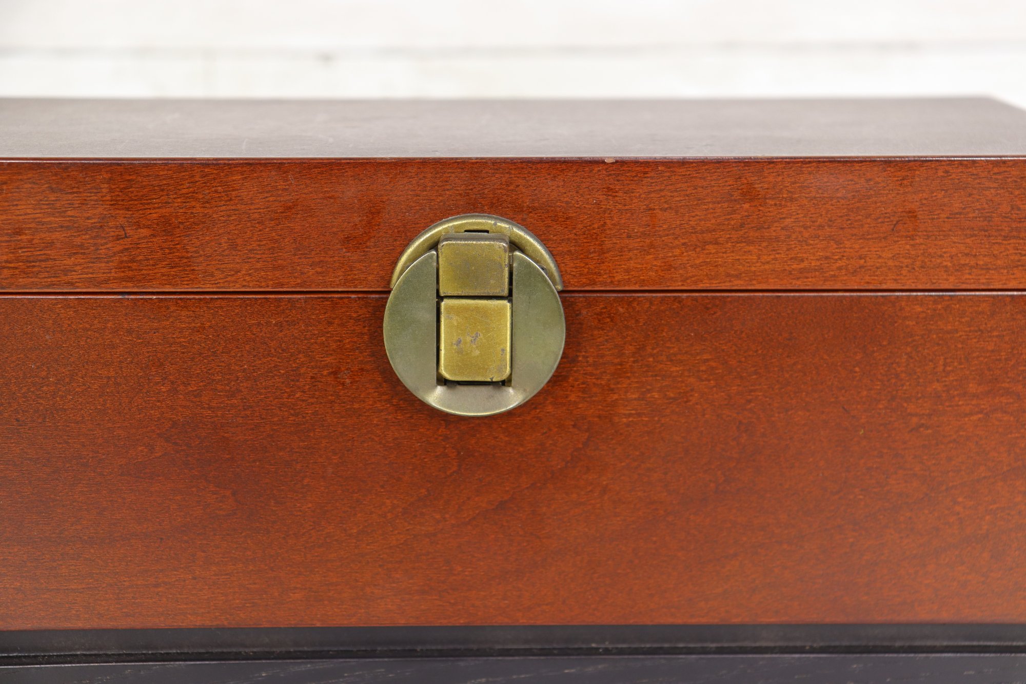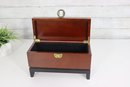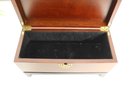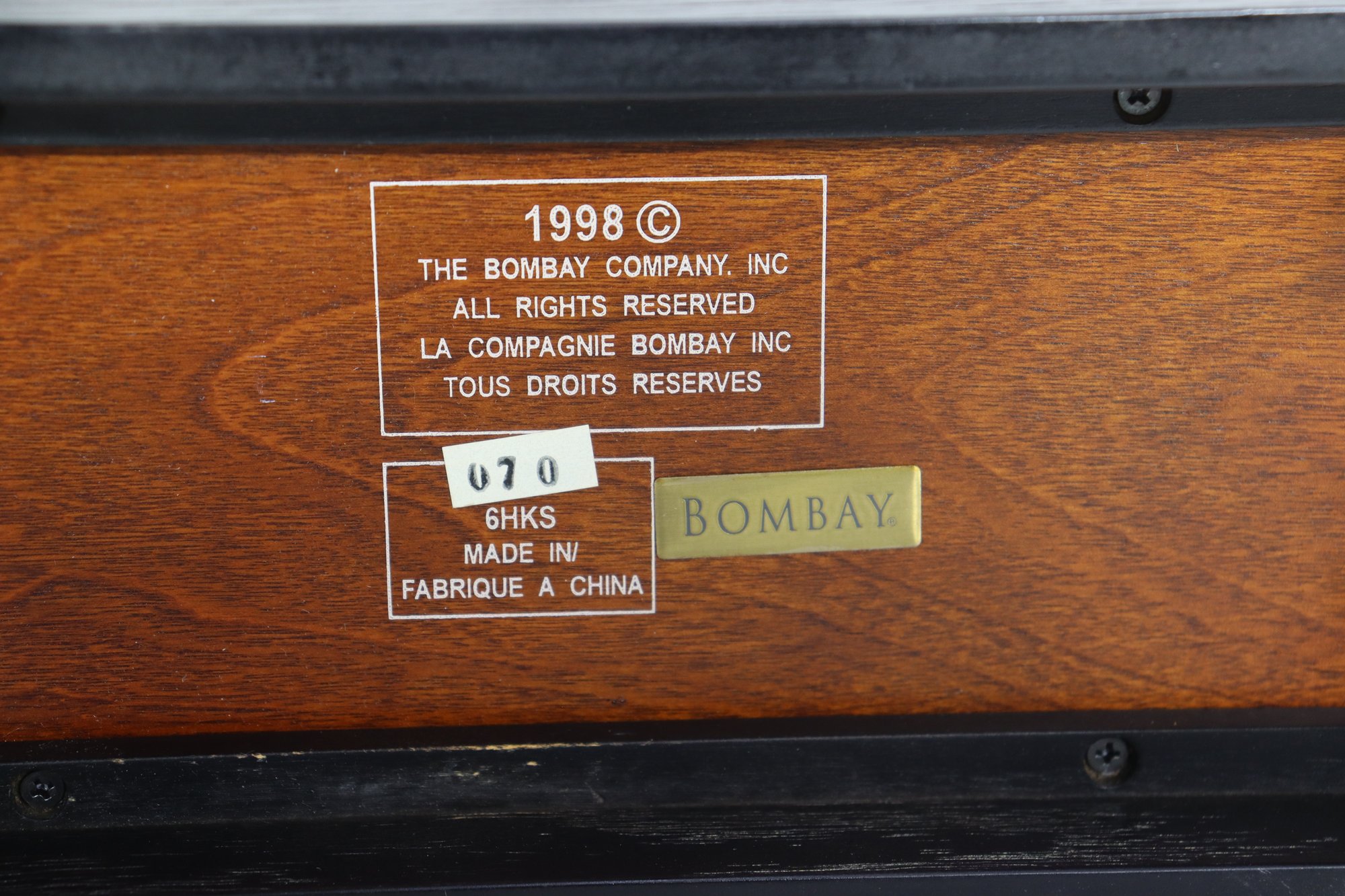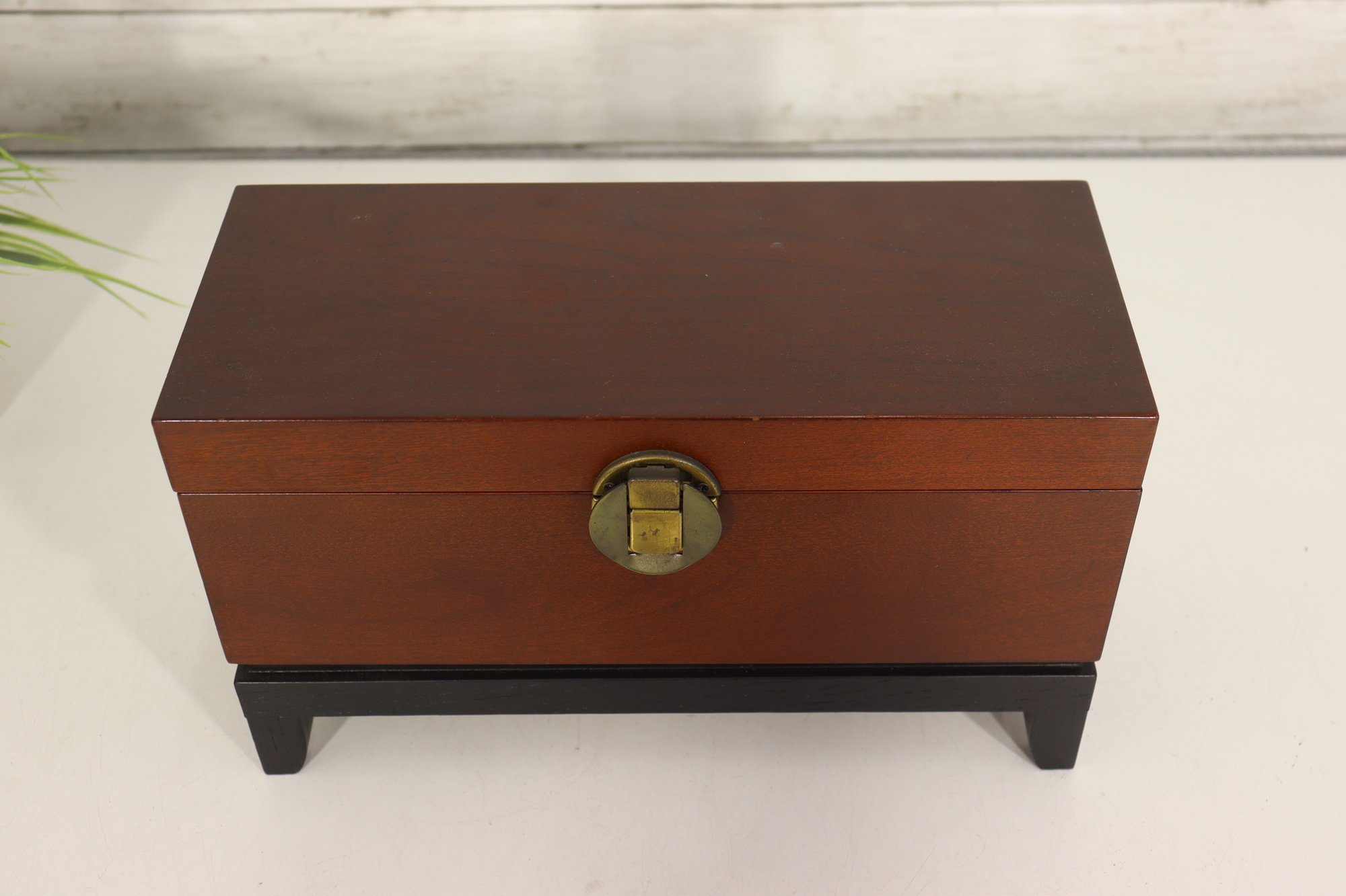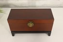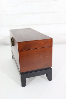 Vintage 1998 Bombay Company wooden jewelry / keepsake storage box with removable stand base. Beautiful classic Bombay styling featuring rich wood finish, brass locking hardware, and black felt-lined interior. The box sits elevated on its fitted black wood stand giving it a more elegant display presence.