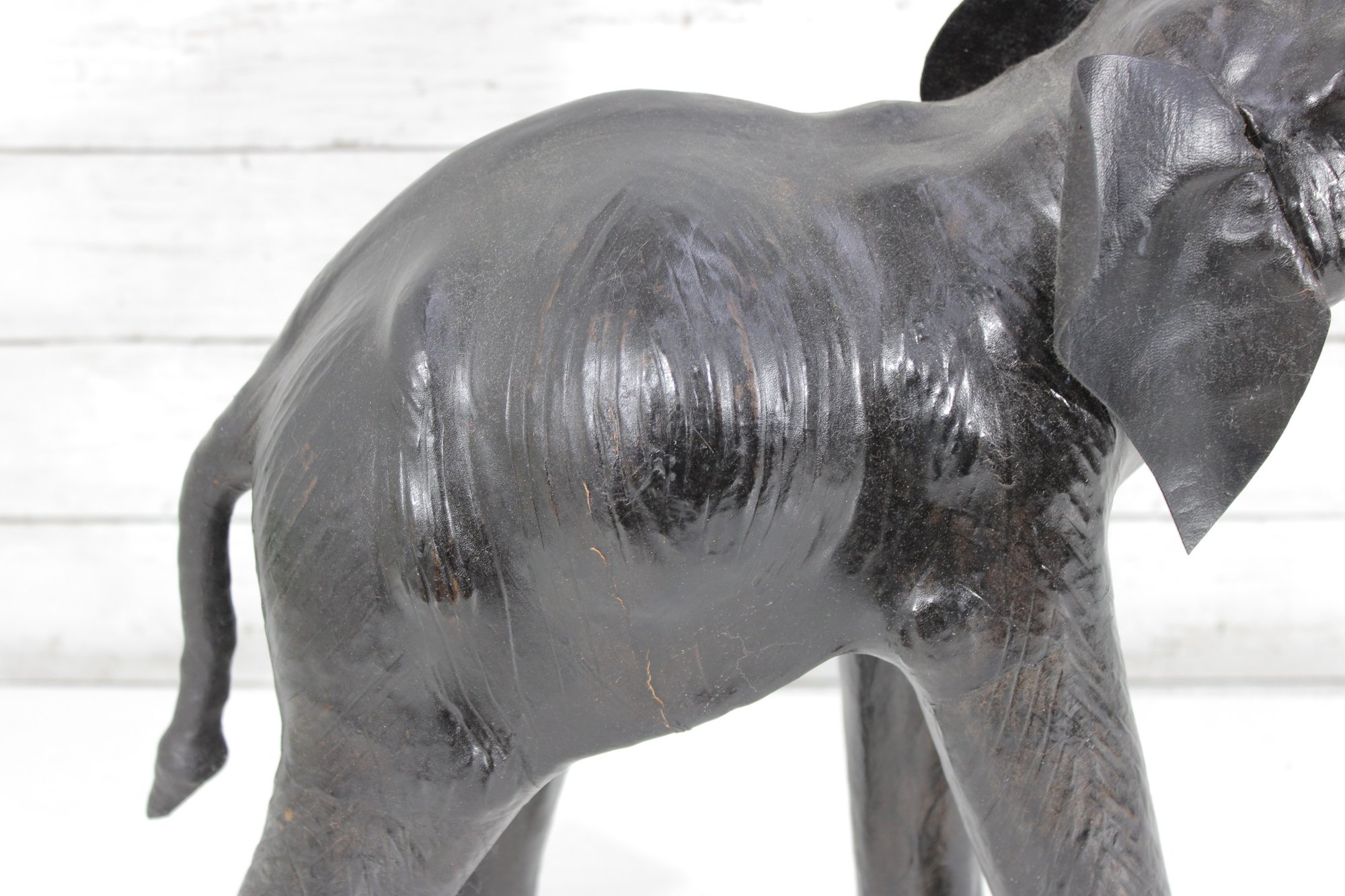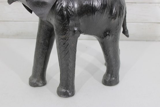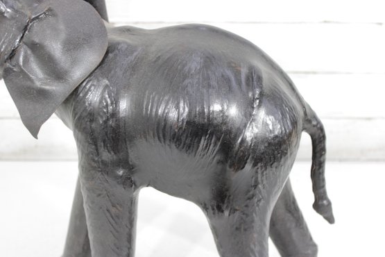 The surface has the look of leather or leather-wrapped styling (exact material unknown), with visible texture and sculpted body contours that give it a handcrafted, artisan character. The darker finish gives this version a more dramatic, formal look compared to traditional brown tones, making it especially versatile in modern, traditional, or global-inspired interiors.