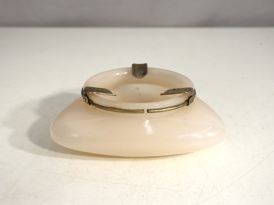 Sophisticated Art Deco opaline glass ashtray featuring a triangular shape with brass cigar rests. A stunning and functional collector’s piece.