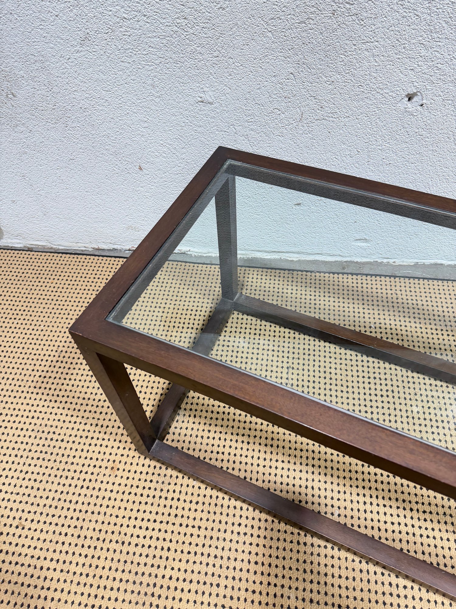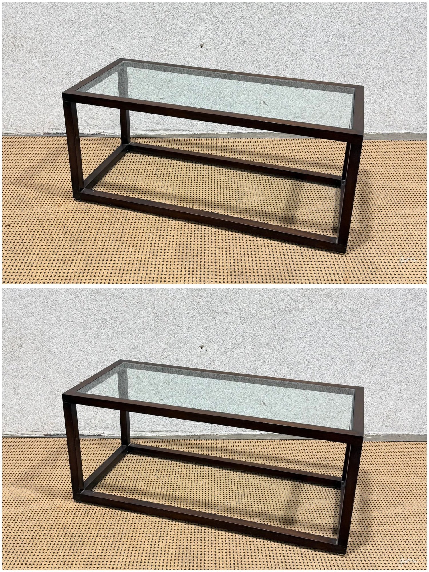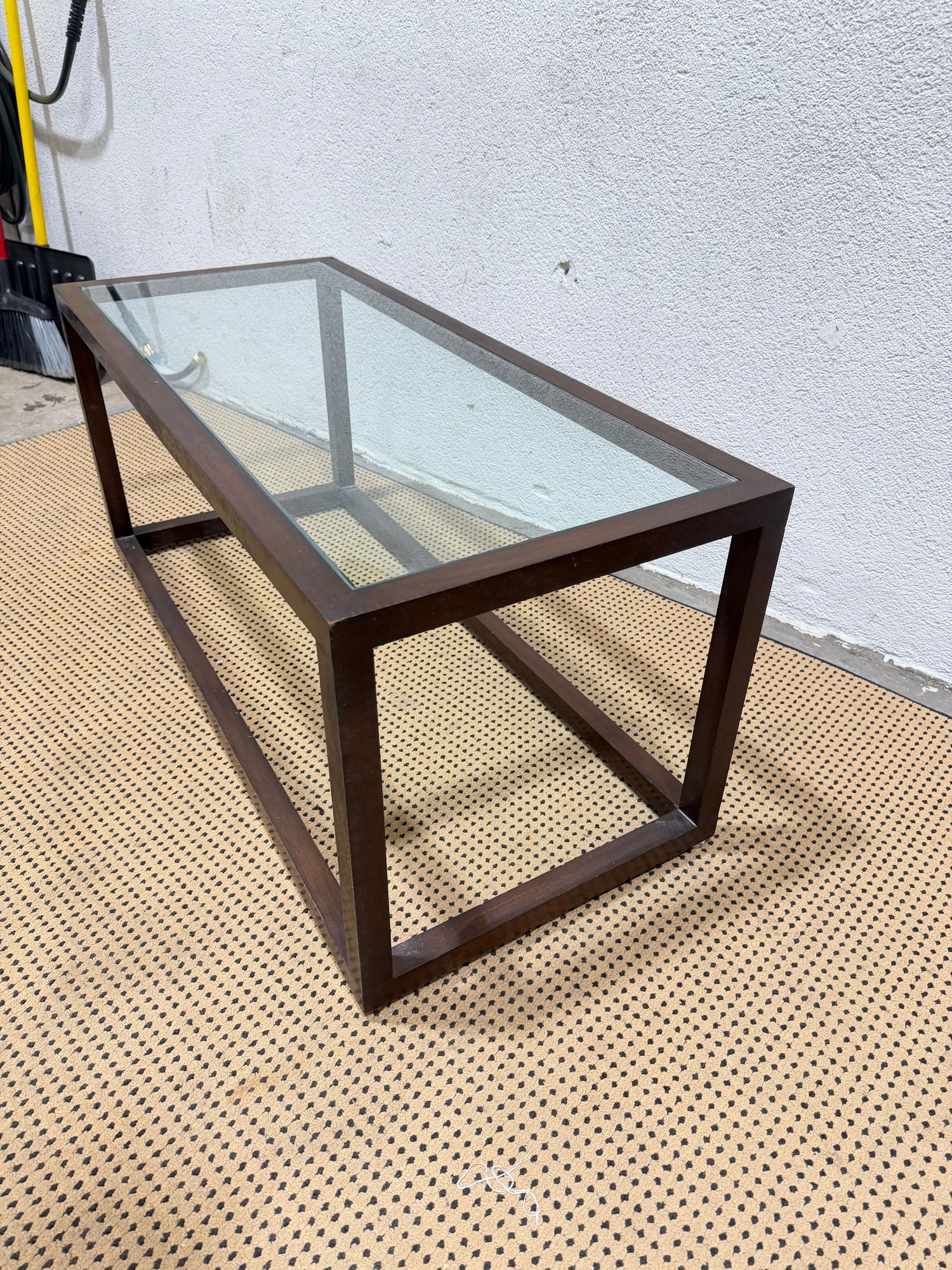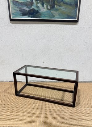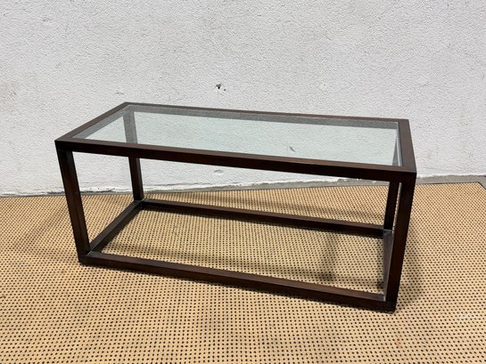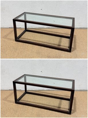 ***One has a chip, one does not*** Clean-lined modern glass top coffee table featuring a rectangular wood frame and inset glass surface. The minimalist design and dark metal finish give this piece a sleek, contemporary look that works well in modern, industrial, or mid-century–inspired interiors.