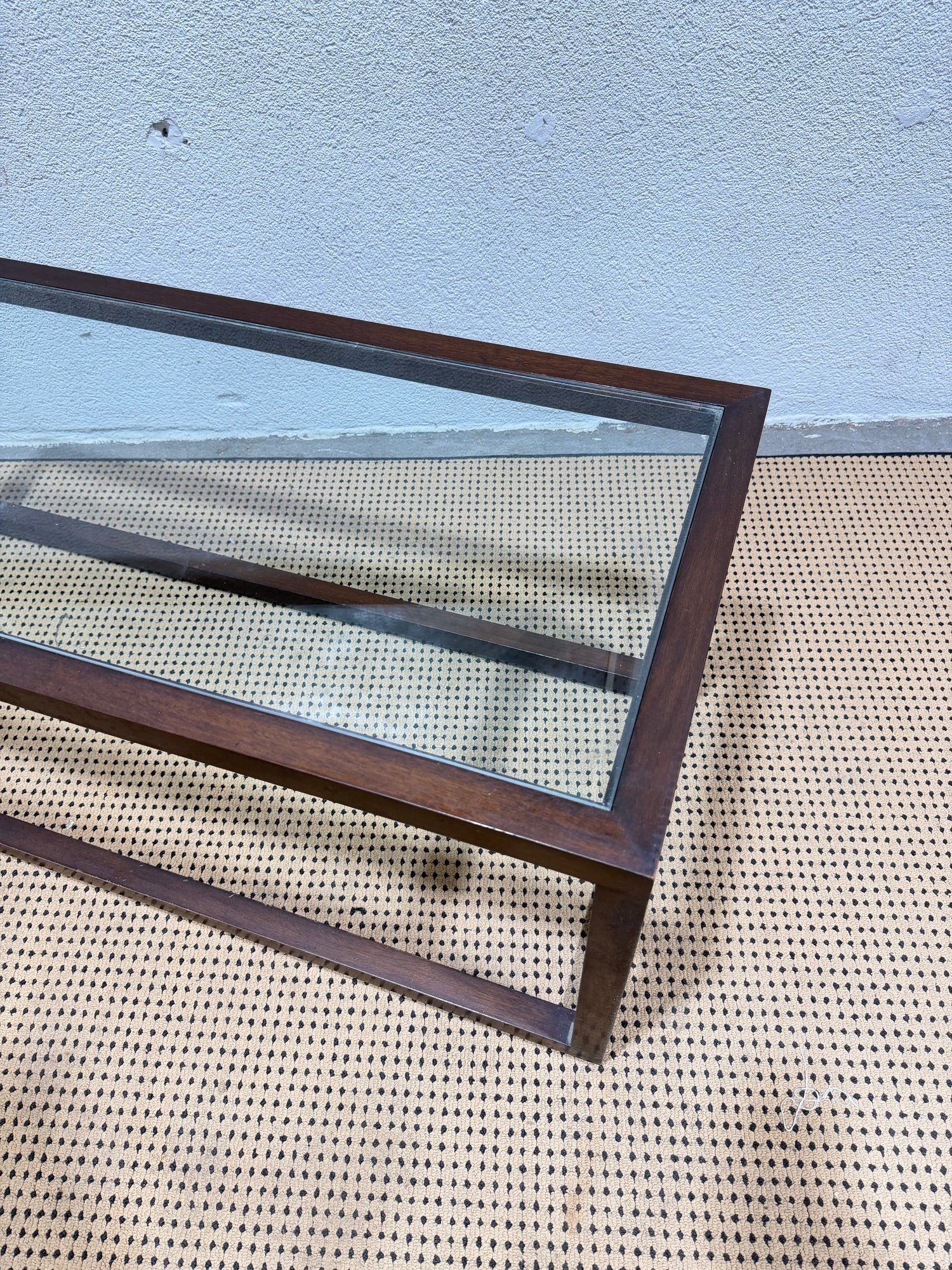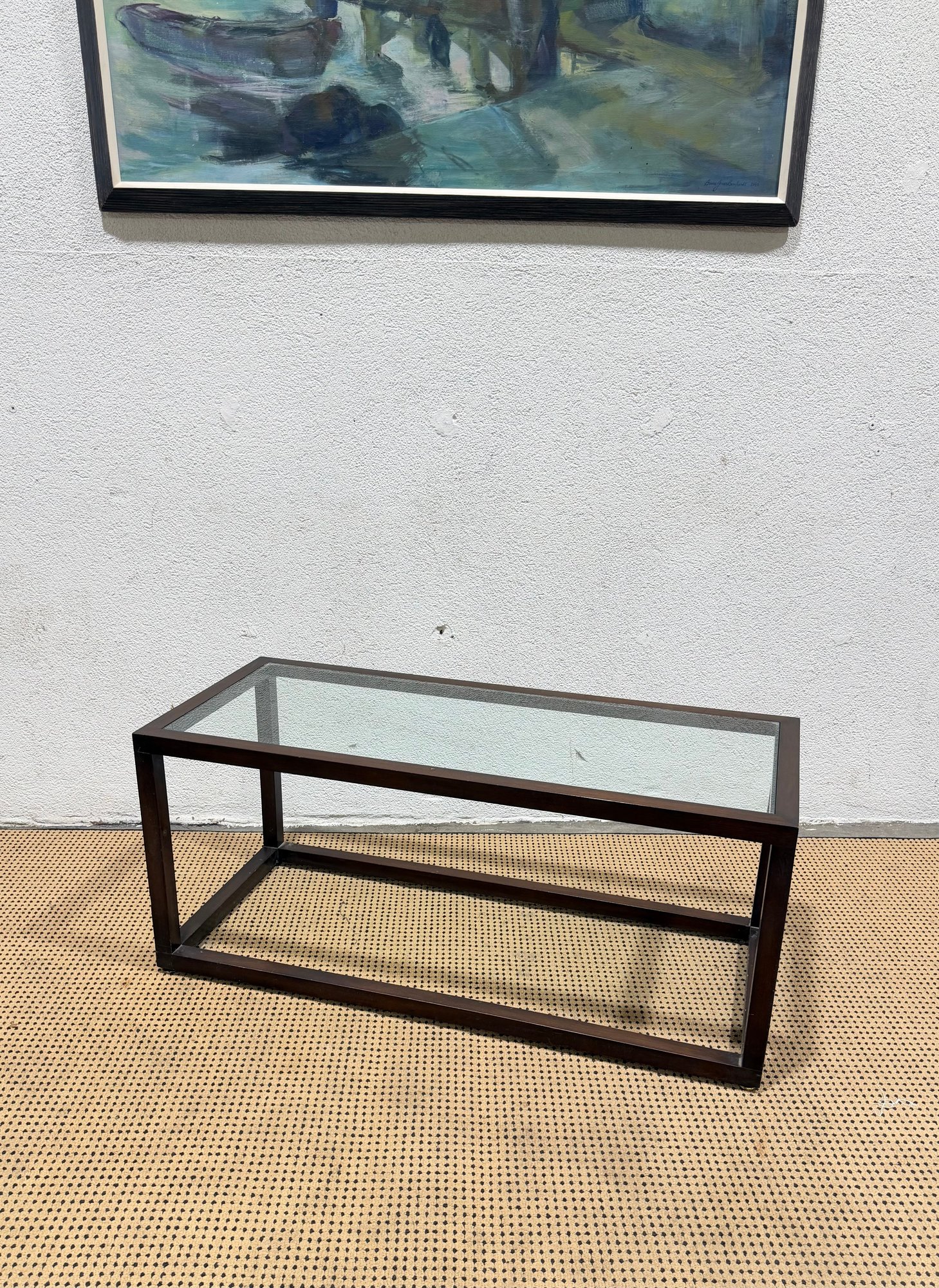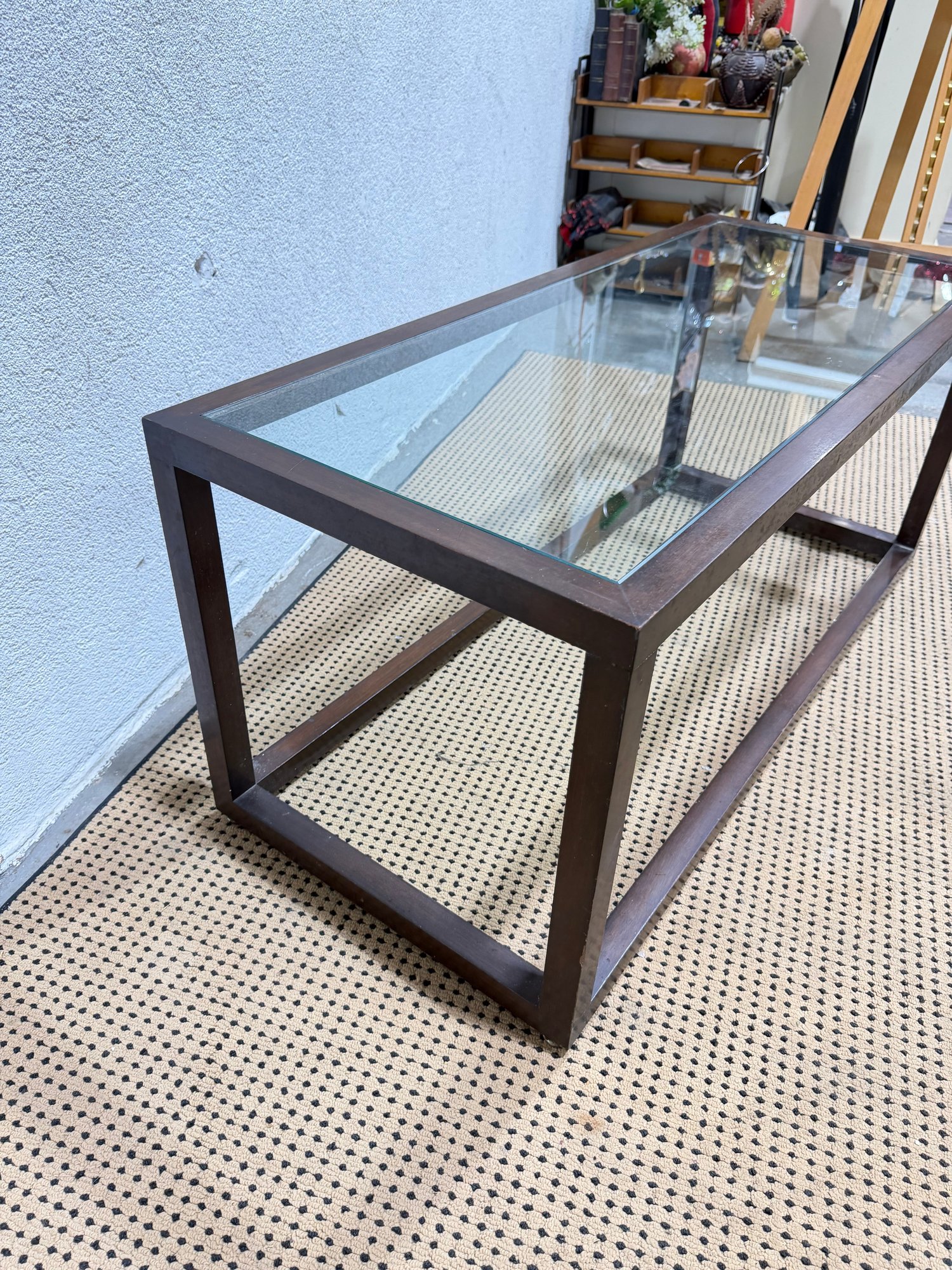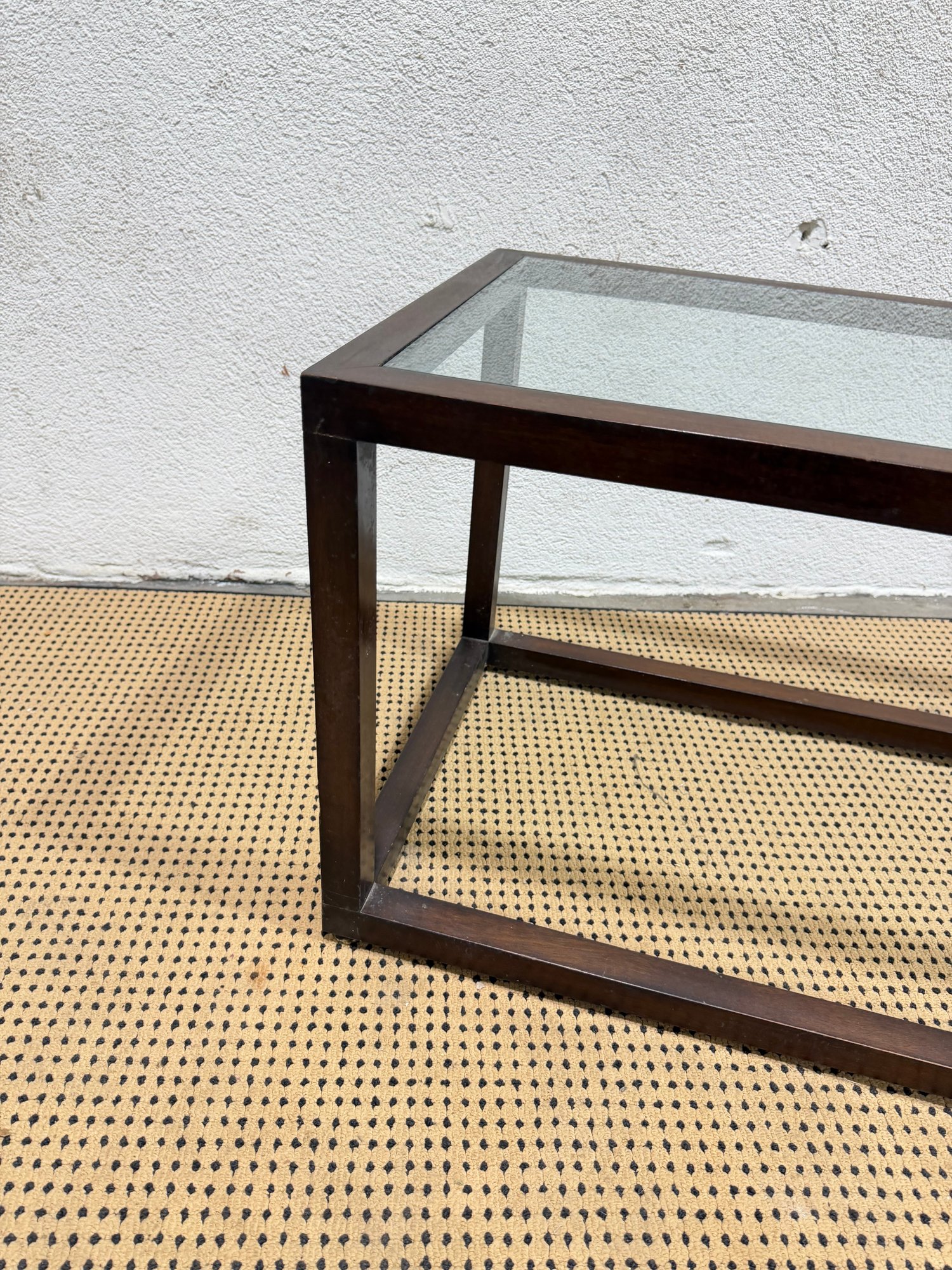 ***One has a chip, one does not*** Clean-lined modern glass top coffee table featuring a rectangular wood frame and inset glass surface. The minimalist design and dark metal finish give this piece a sleek, contemporary look that works well in modern, industrial, or mid-century–inspired interiors.