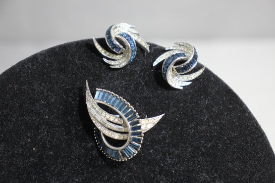 #21--Vintage 3-Piece Set: Elegant Blue And Clear Rhinestone Brooch And Matching Earrings