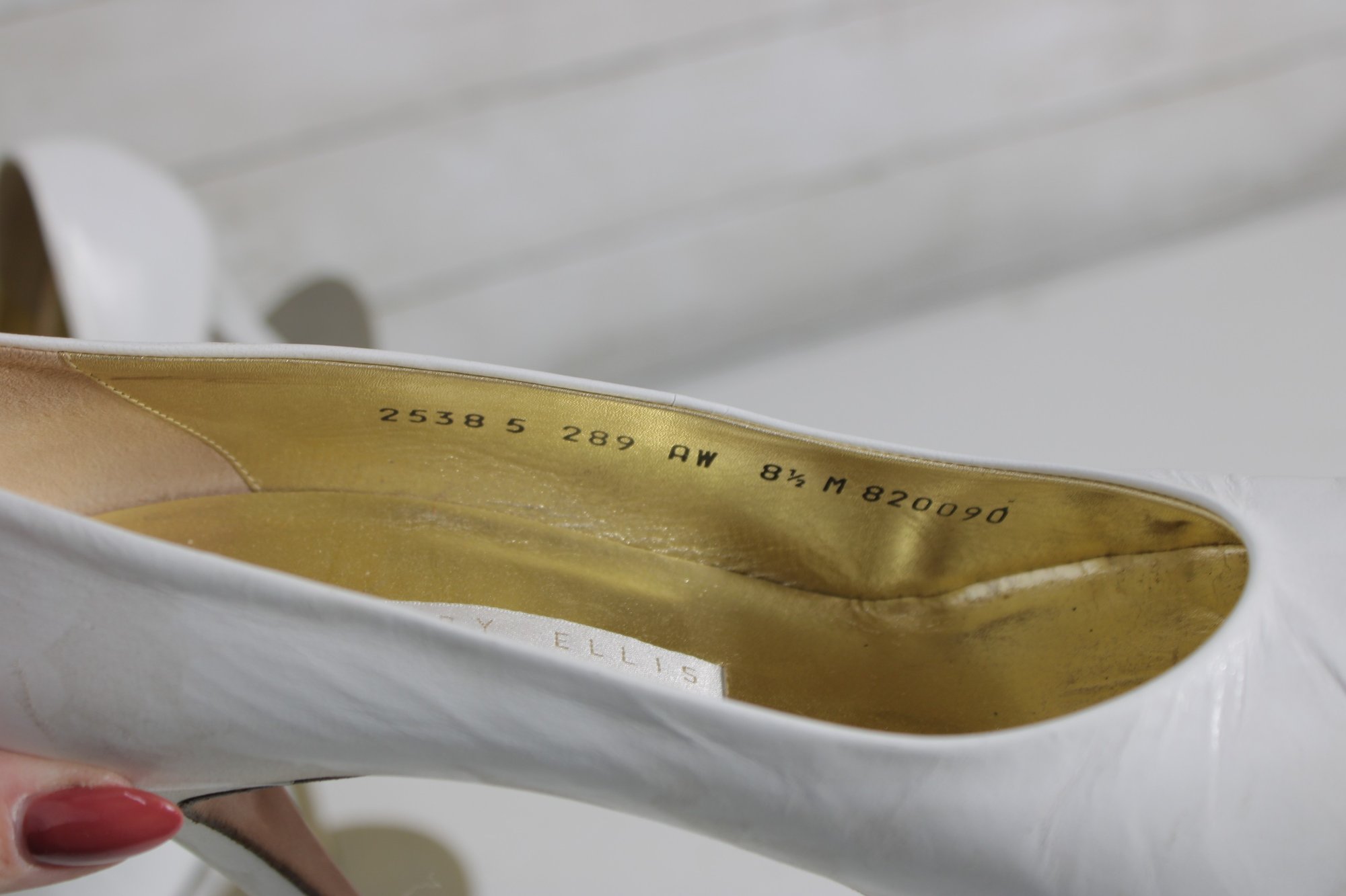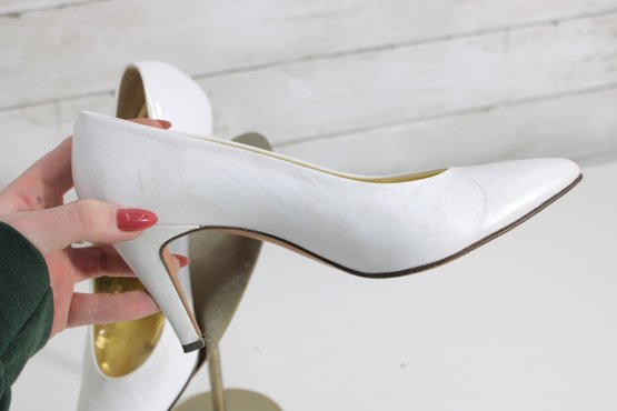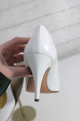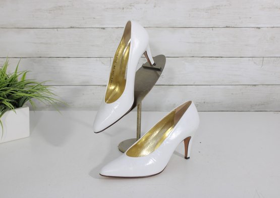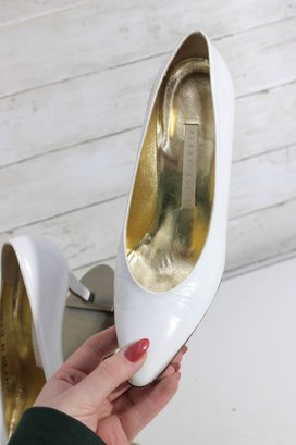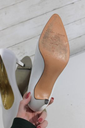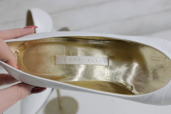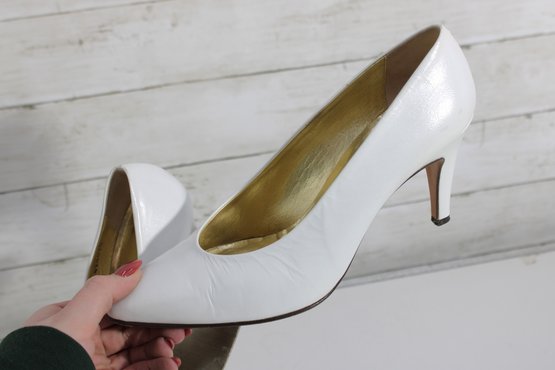 Elegant Perry Ellis pumps crafted in smooth white leather with a timeless pointed-toe silhouette and graceful mid-height heel. These classic heels feature a rich gold-tone interior and a clean, refined look—perfect for bridal wear, formal occasions, office attire, or everyday sophistication.
