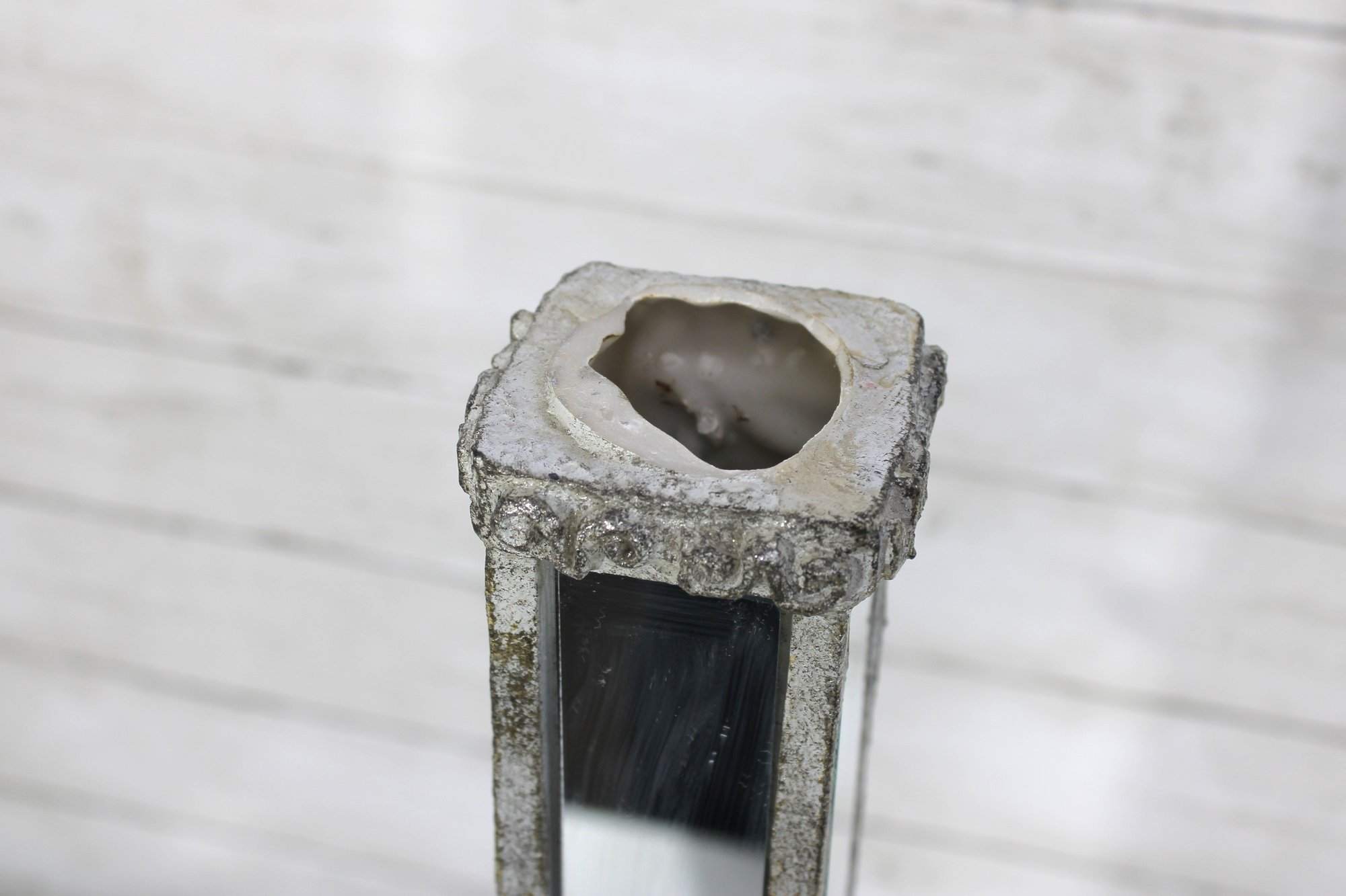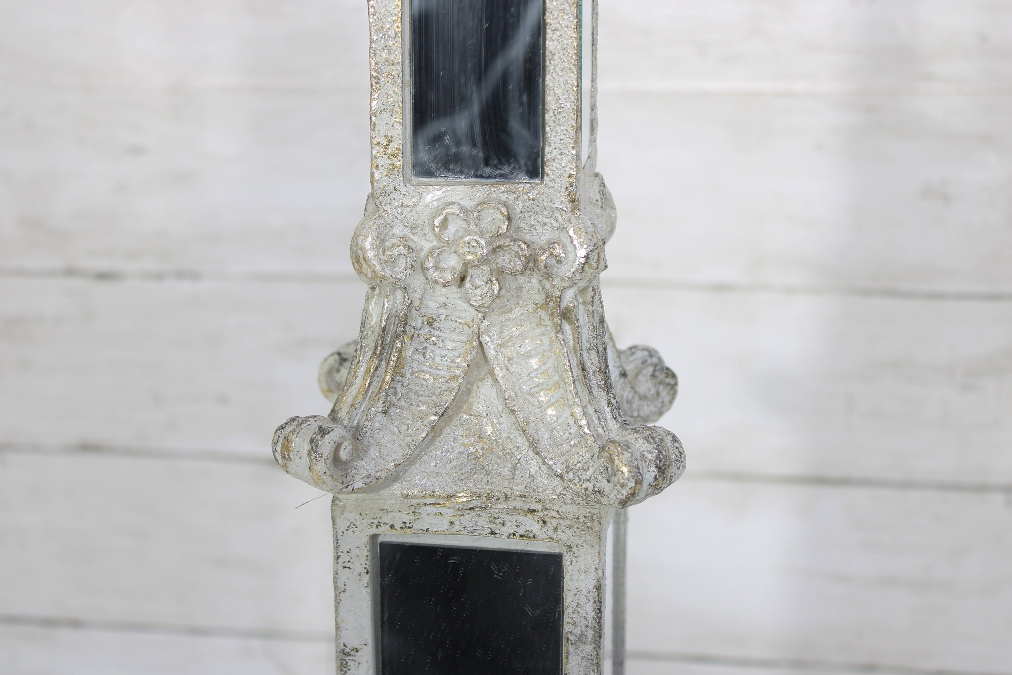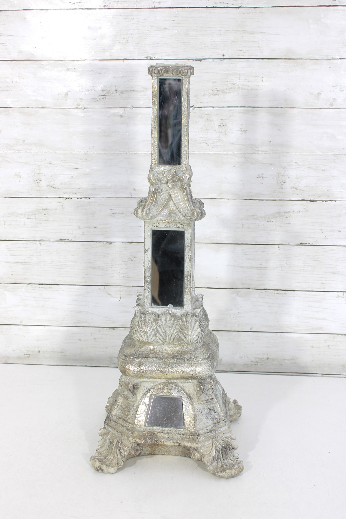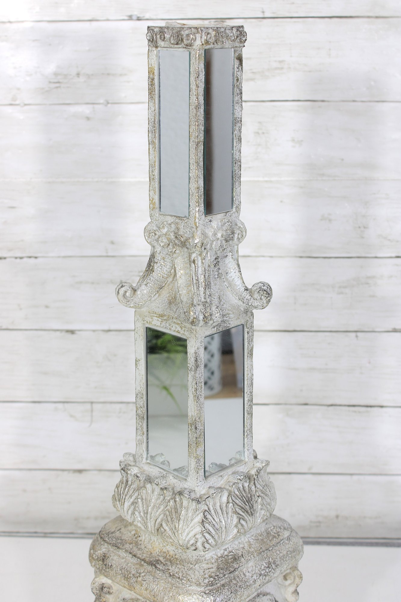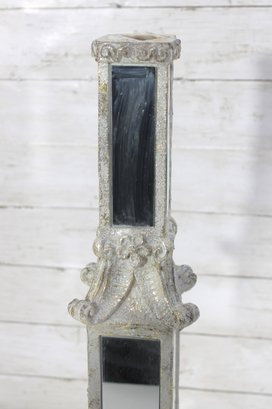The tall, slender upper column is fitted with vertical mirrored panels, while the lower section includes additional mirror accents framed by decorative molding. The top has an open recess (possibly designed to hold a small candle or decorative element).