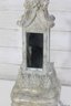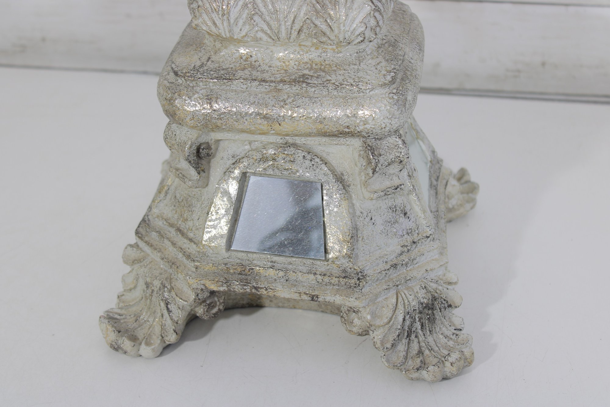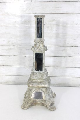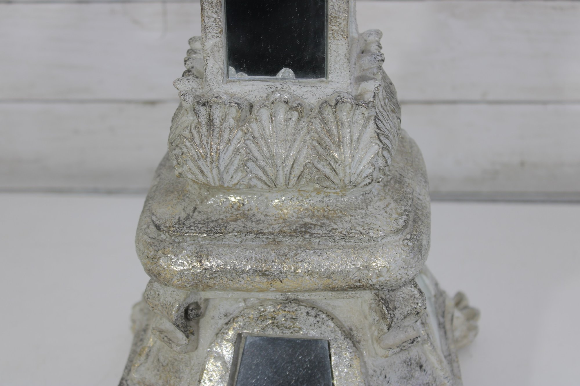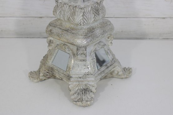 This striking accent piece showcases a tiered architectural form with beveled mirror inserts on multiple sides, set within a heavily textured, distressed white/cream finish. The base features ornate detailing with scroll and leaf-style embellishments, giving it a stately, old-world character.