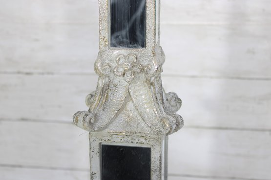 Elegant 24-inch tall decorative mirror obelisk featuring a neoclassical-inspired design with antiqued finish and inset mirrored panels.