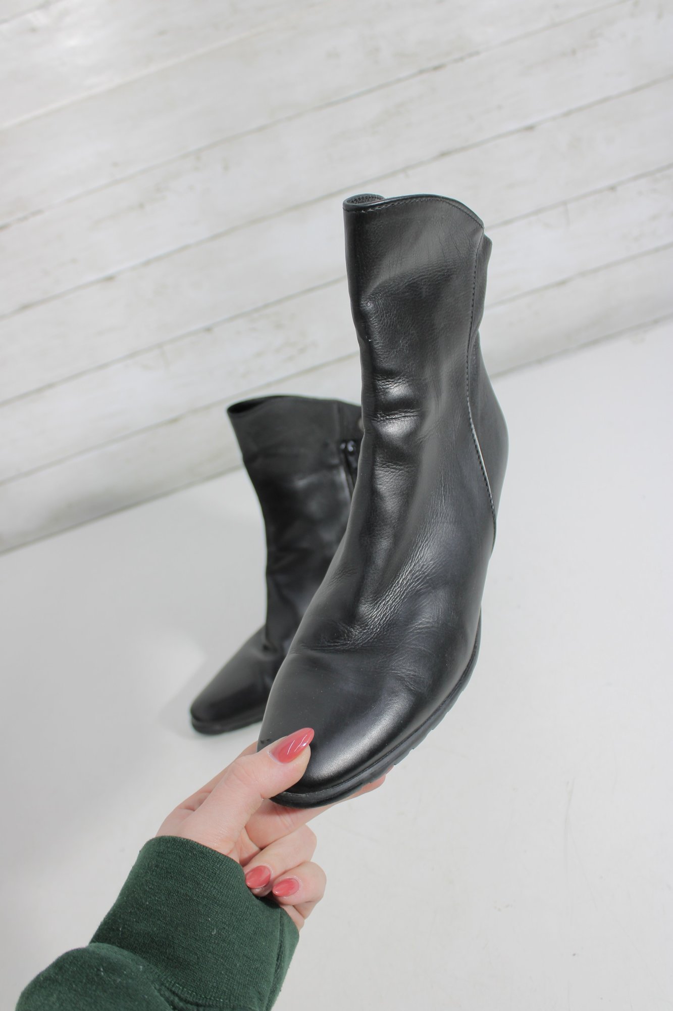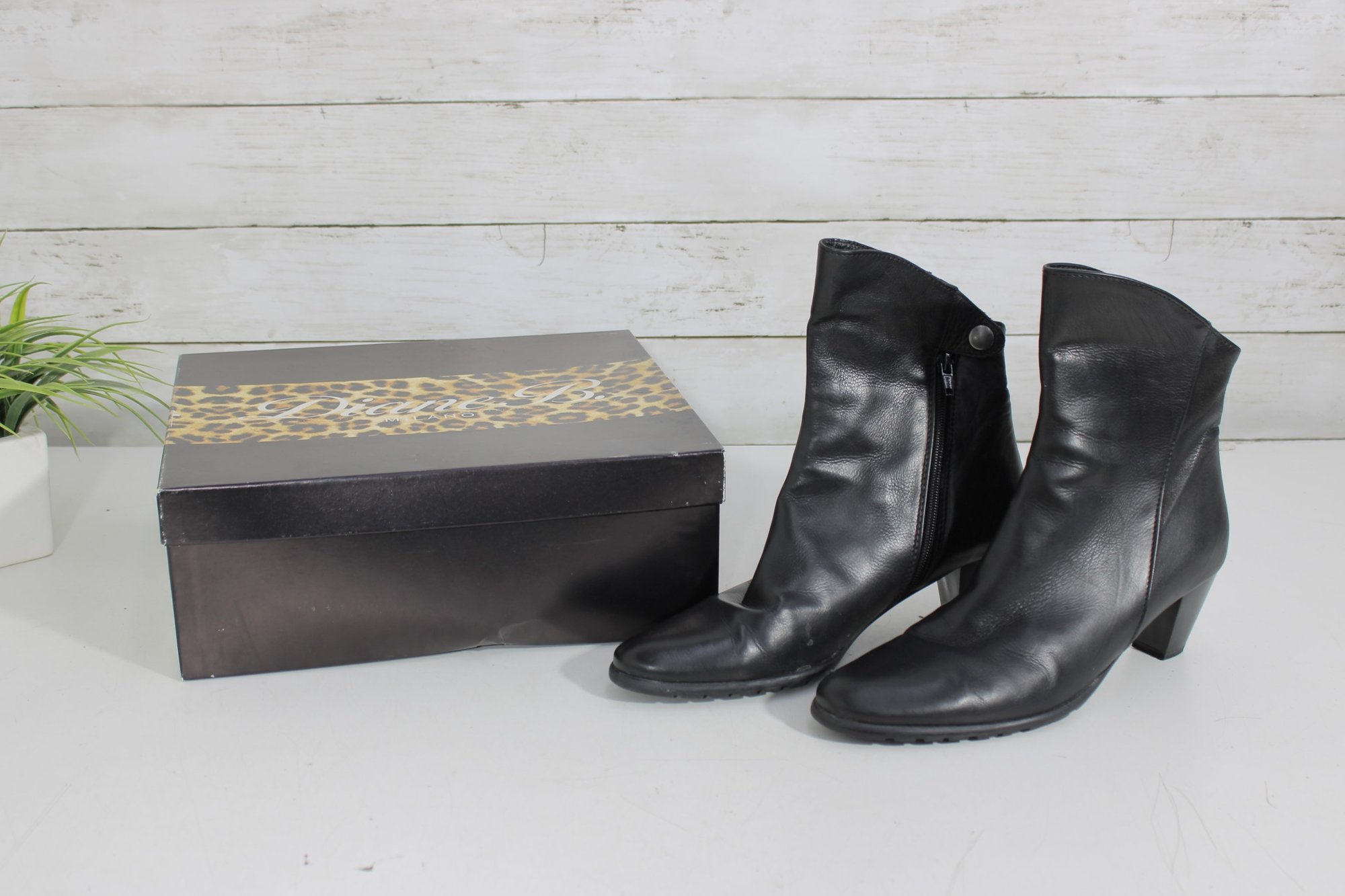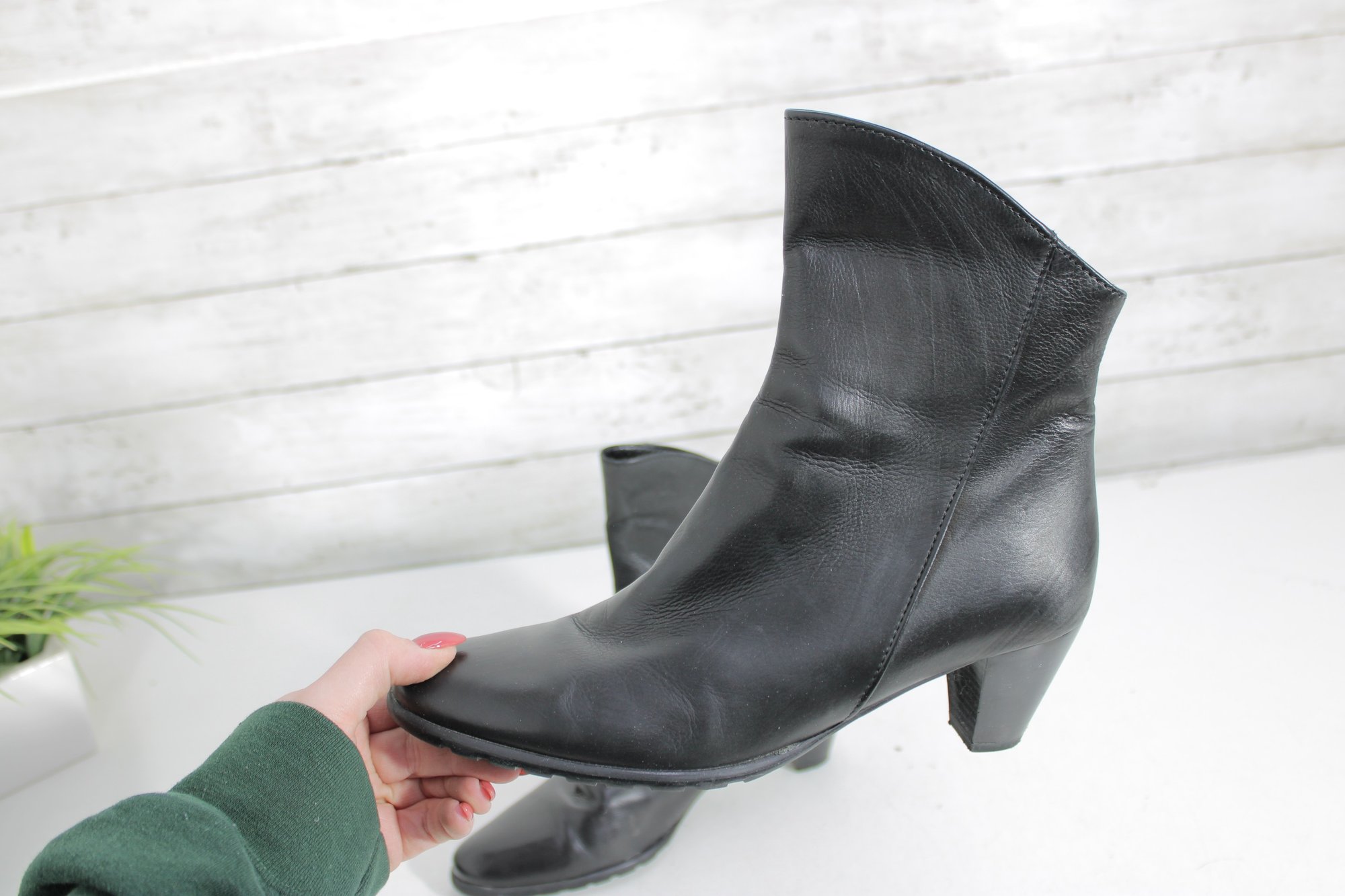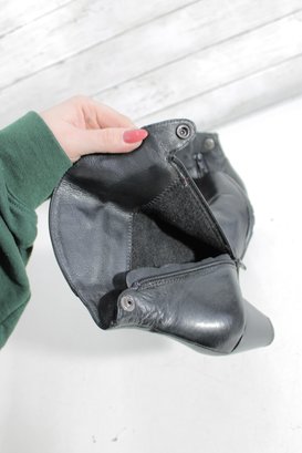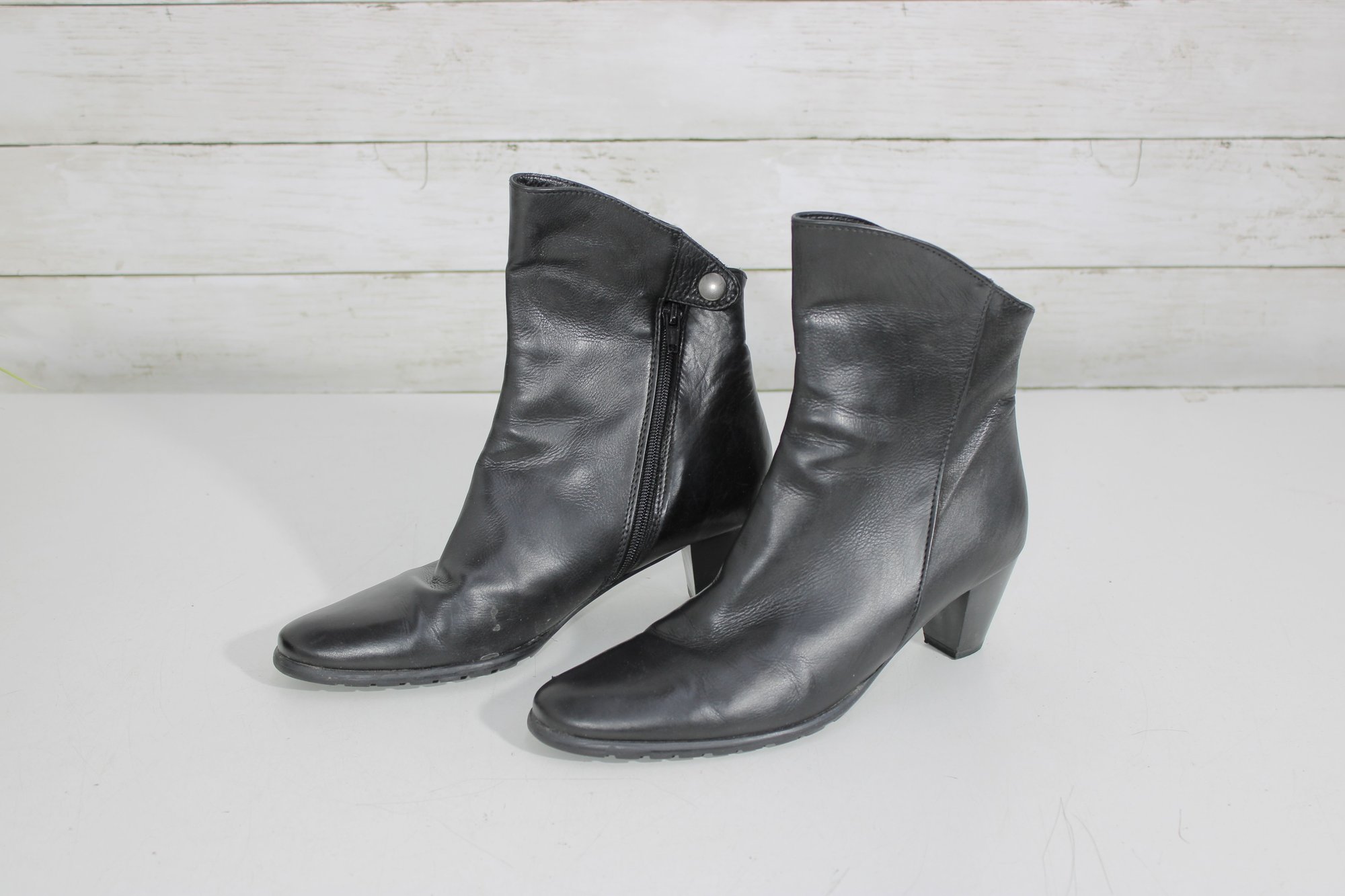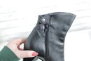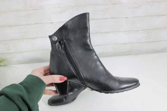 Stylish and versatile women’s black leather ankle boots, perfect for everyday wear or dressing up. These booties feature a sleek leather upper with a comfortable block heel and convenient side zipper for easy on and off.