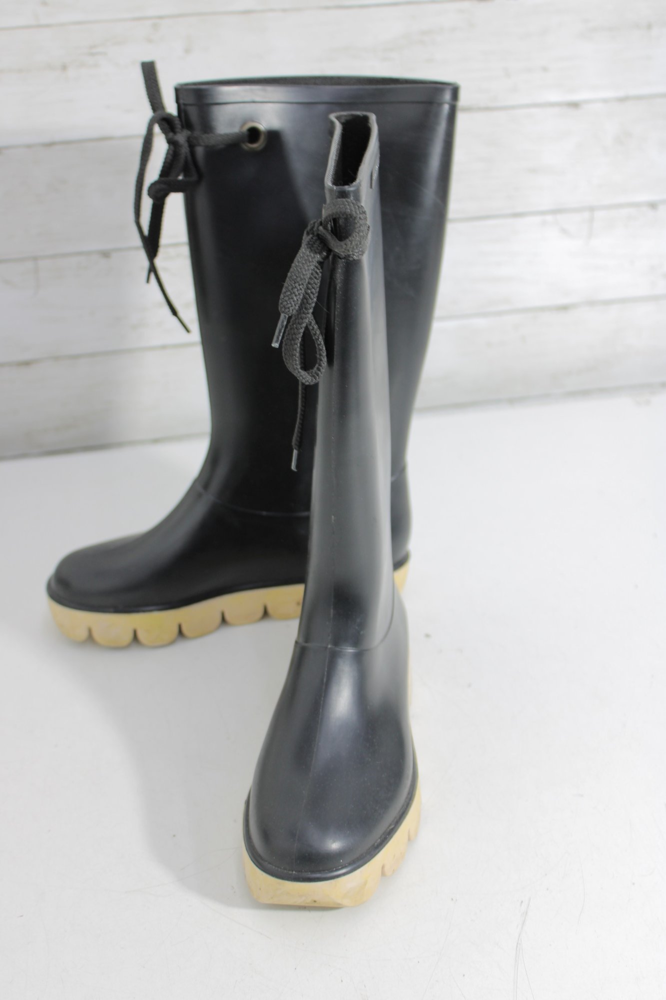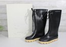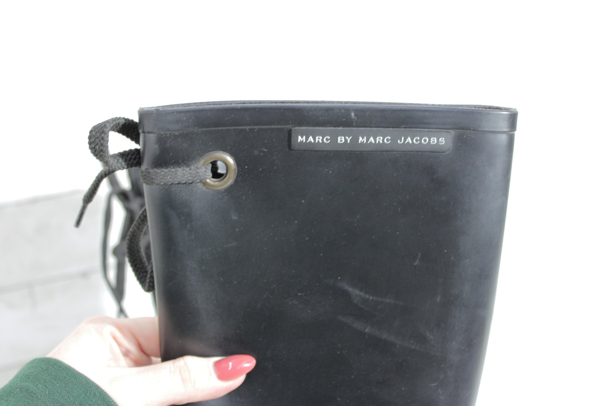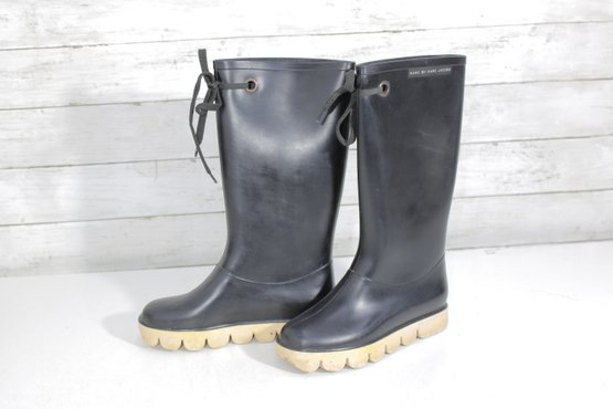Stylish and functional designer rain boots by Marc by Marc Jacobs. These boots feature a sleek black rubber exterior paired with a sturdy, textured sole—perfect for rainy days while still keeping a fashionable edge.