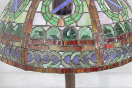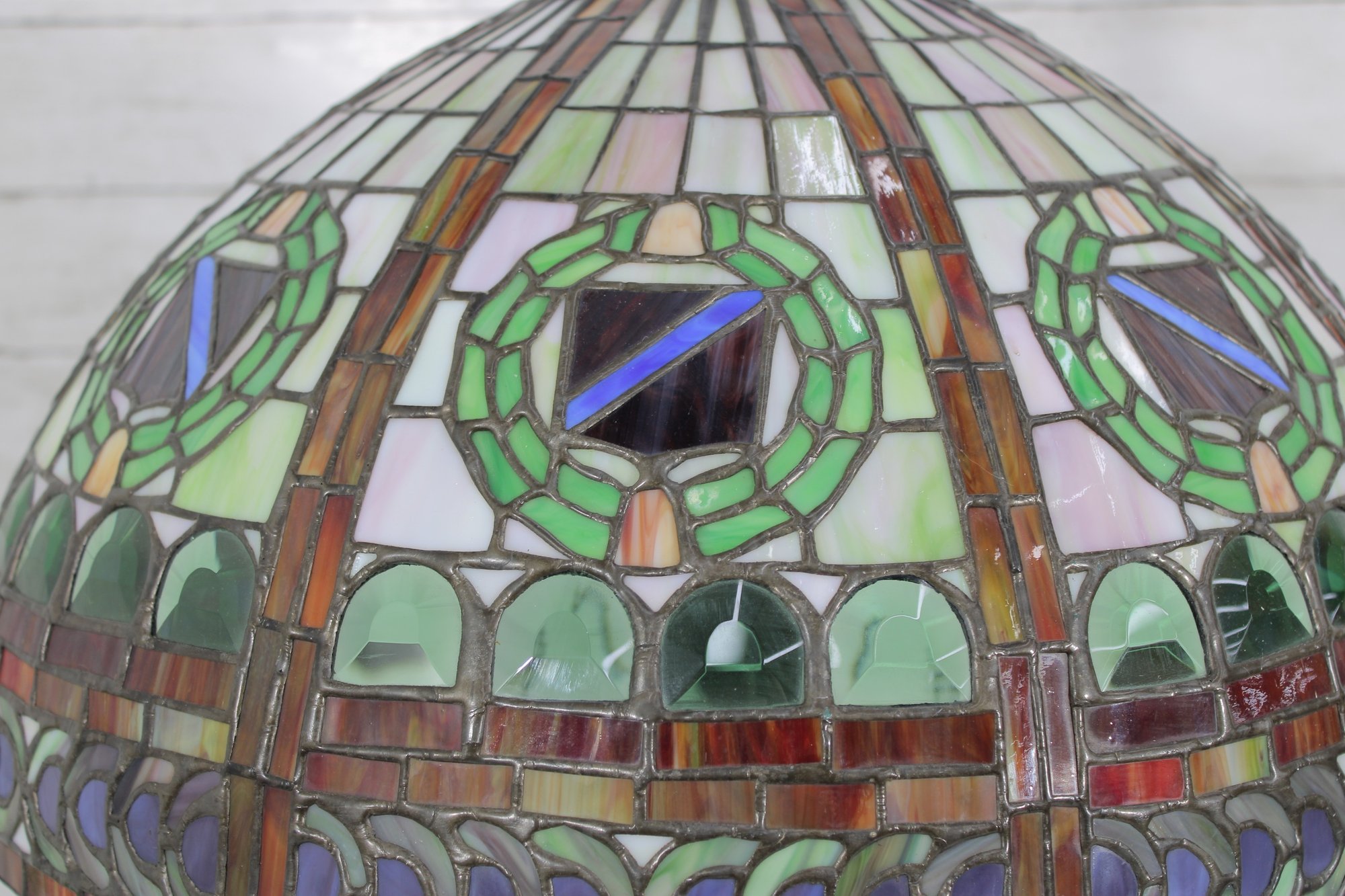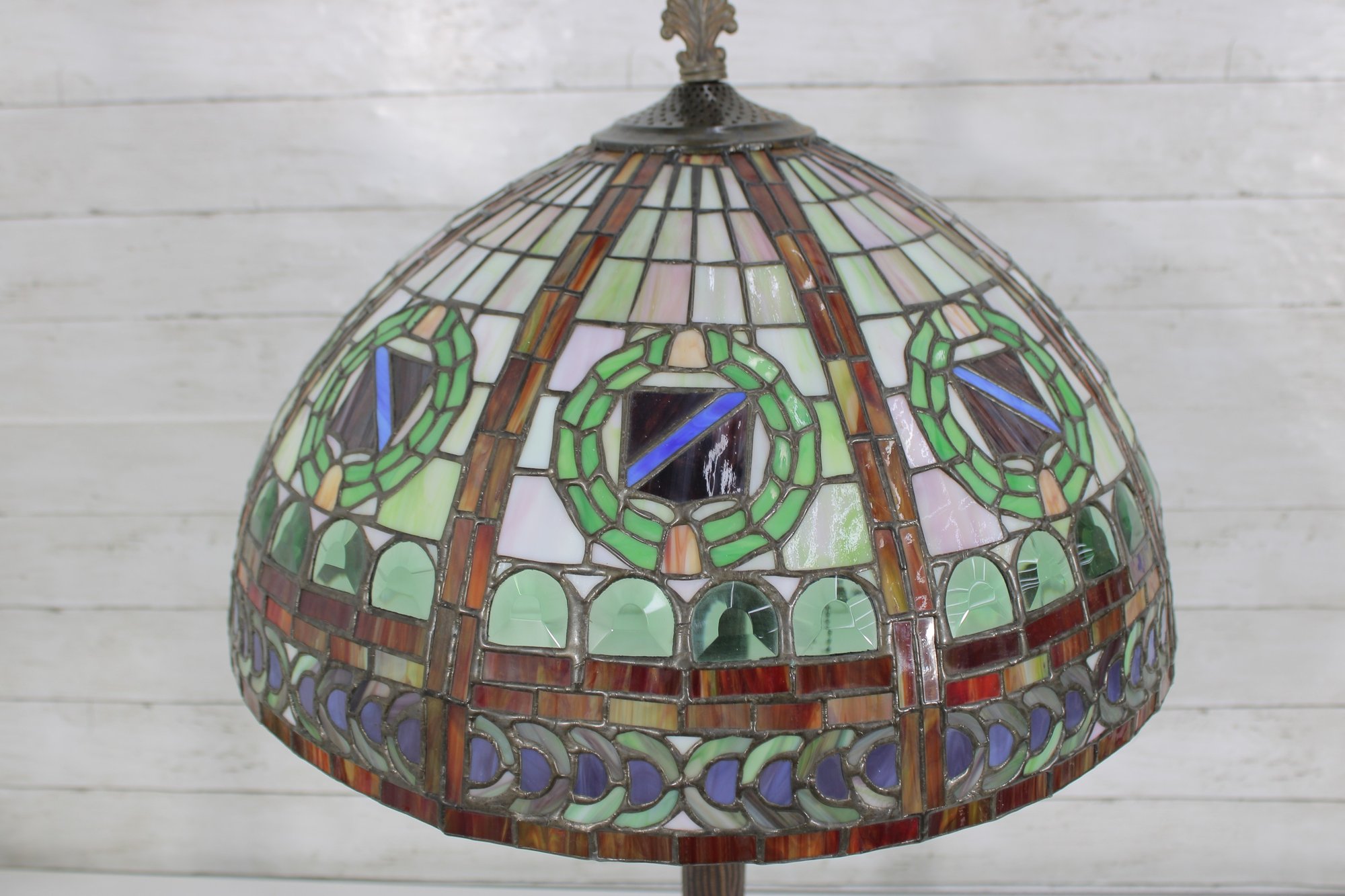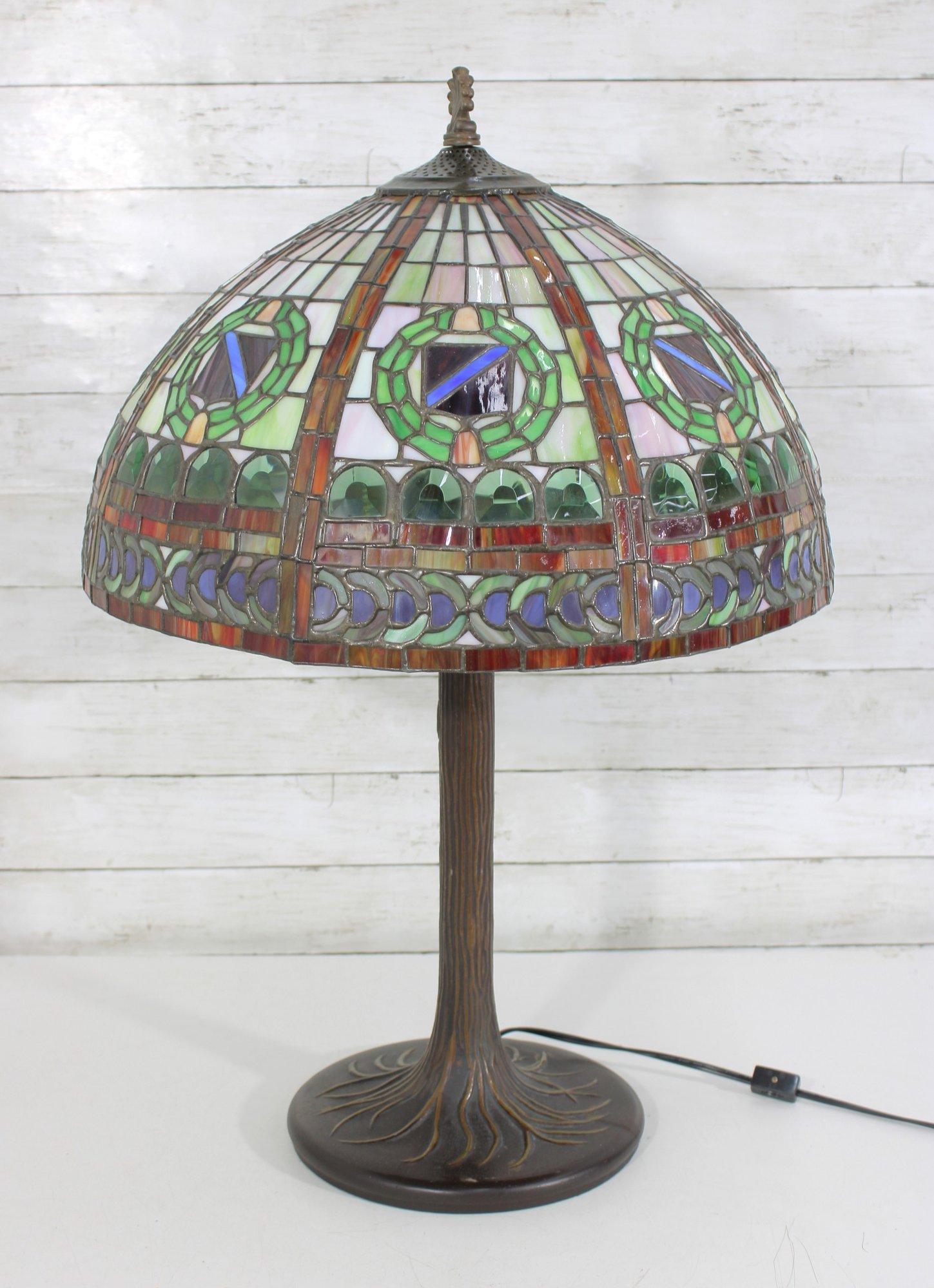 Make a bold and elegant statement with this impressive Tiffany-style table lamp. Standing 29 inches tall with a generous 20-inch round shade, this lamp features a beautifully patterned dome in soothing tones of green, blue, amber, and soft lavender. The geometric and Art Deco–inspired design is accented with jewel-like center panels that shimmer when illuminated.
