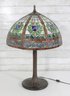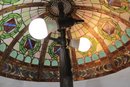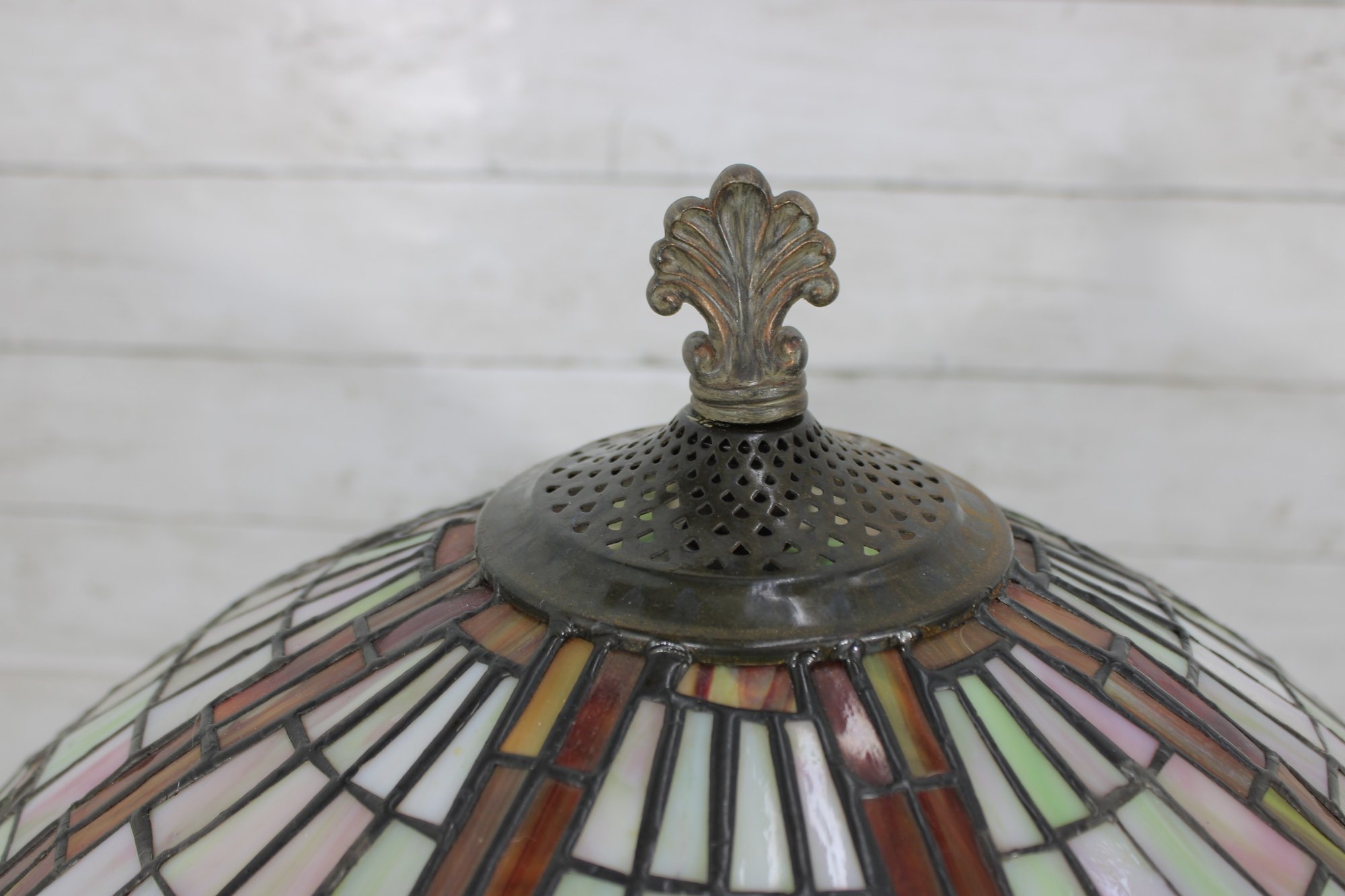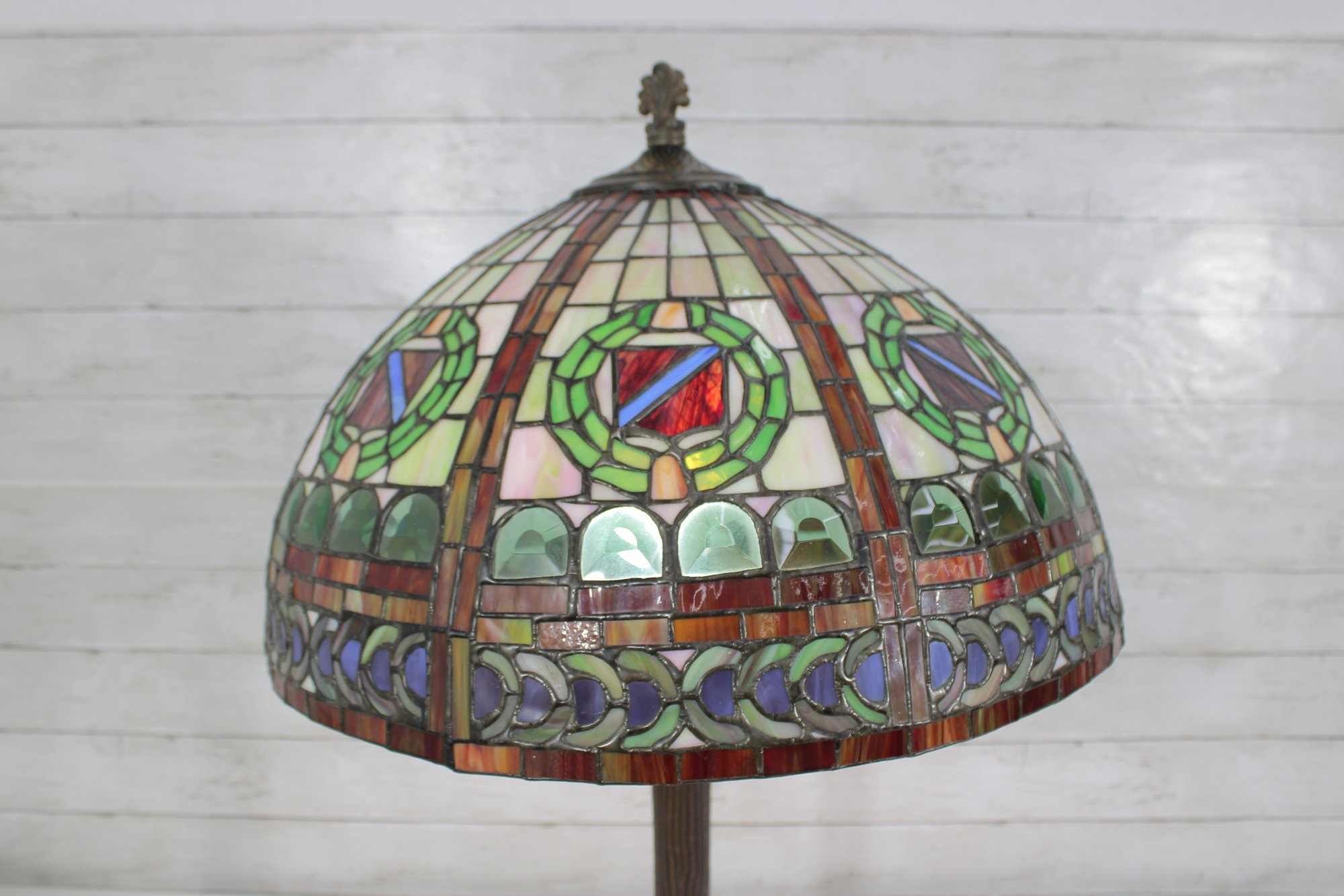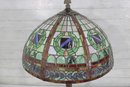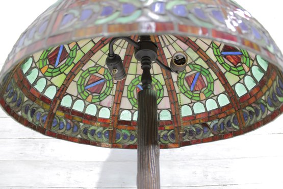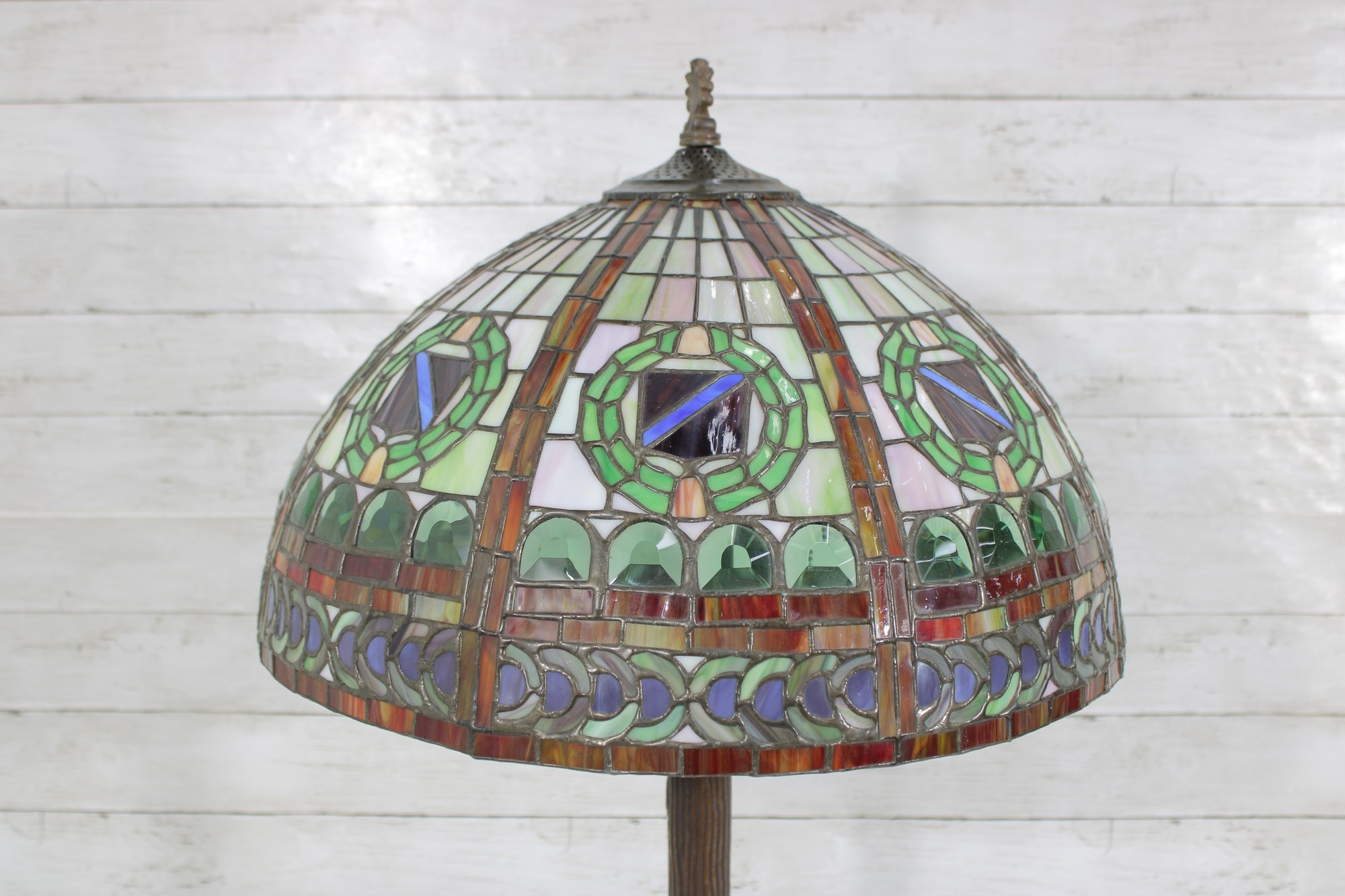 Make a bold and elegant statement with this impressive Tiffany-style table lamp. Standing 29 inches tall with a generous 20-inch round shade, this lamp features a beautifully patterned dome in soothing tones of green, blue, amber, and soft lavender. The geometric and Art Deco–inspired design is accented with jewel-like center panels that shimmer when illuminated.