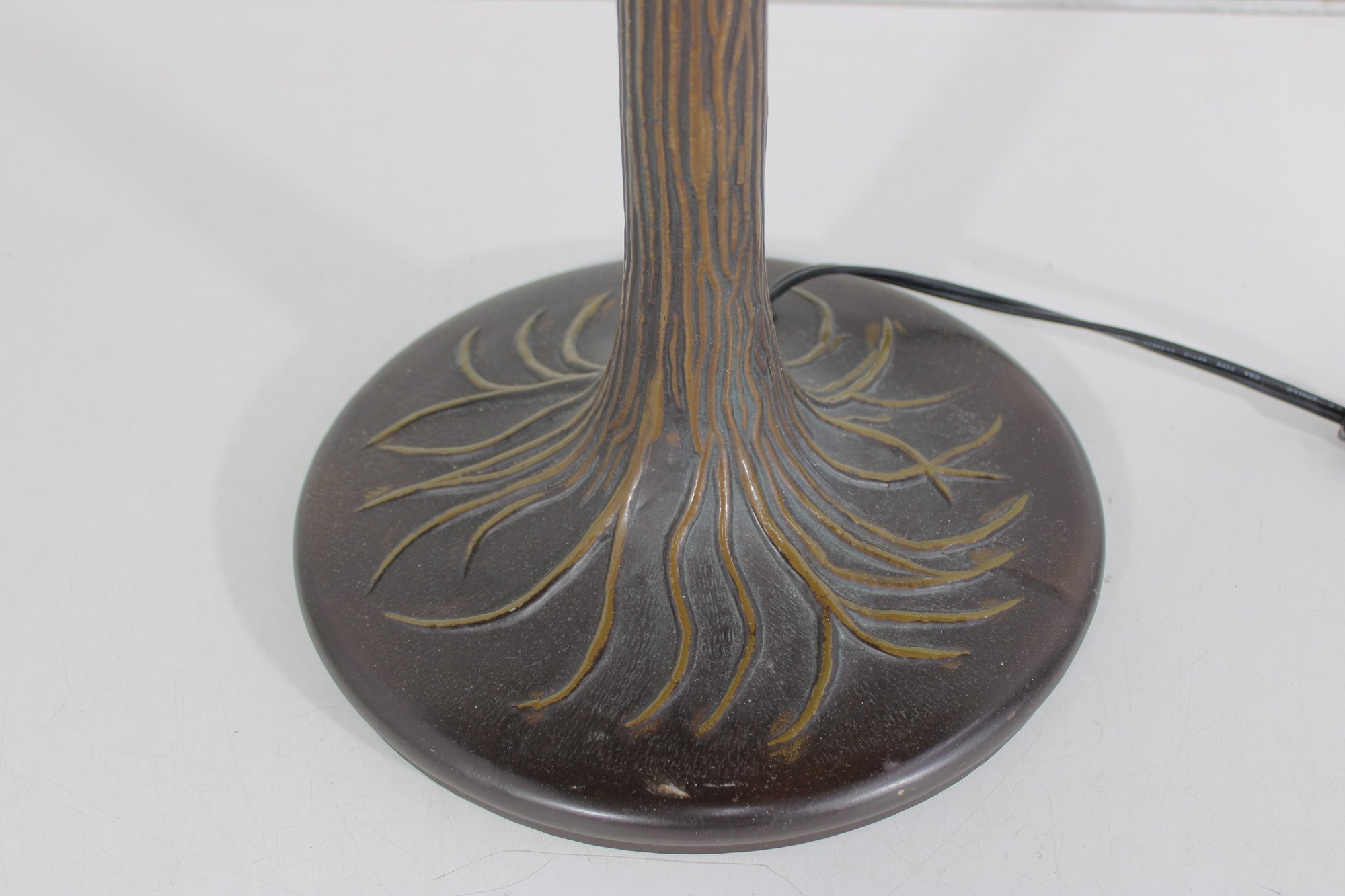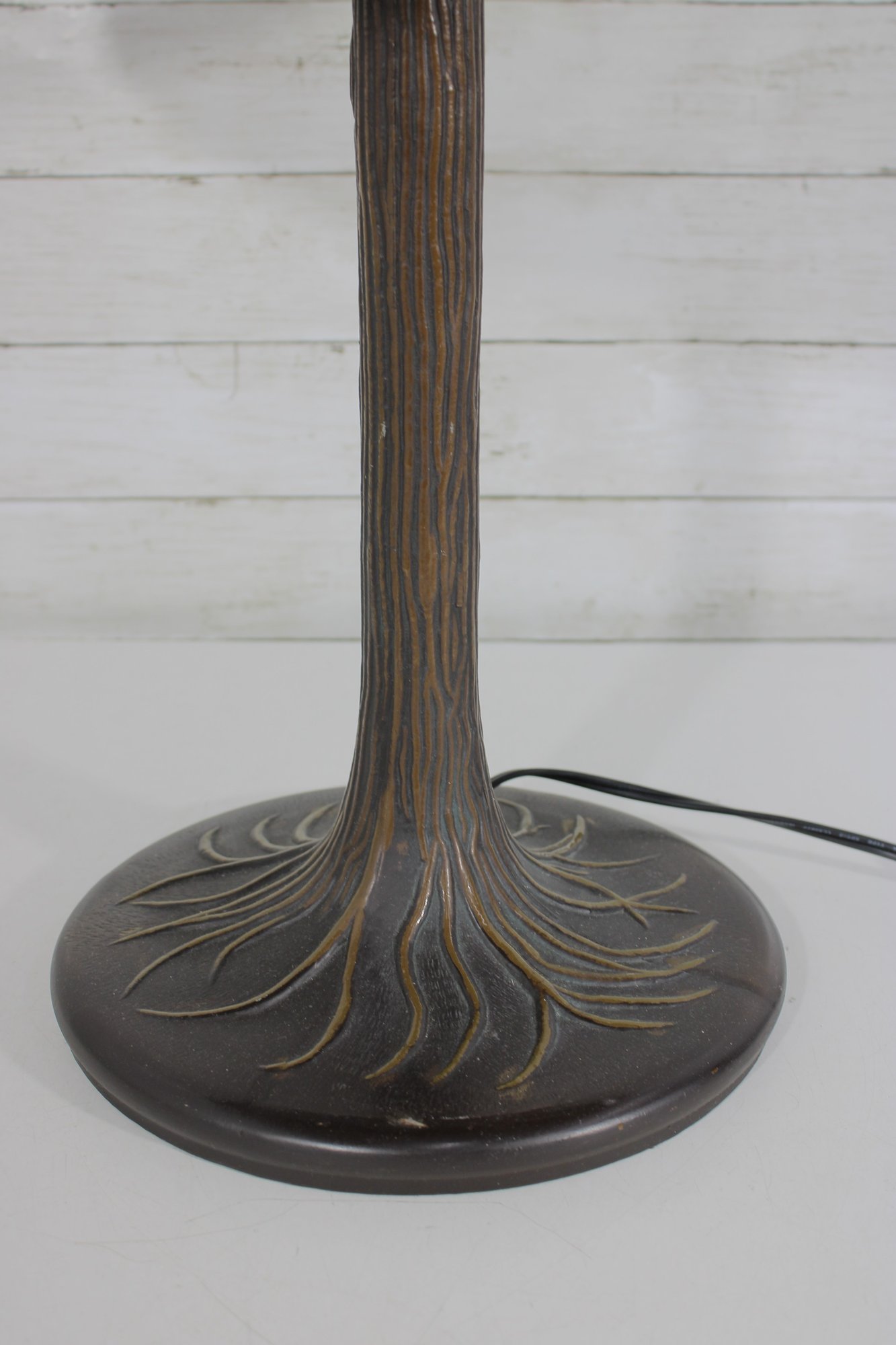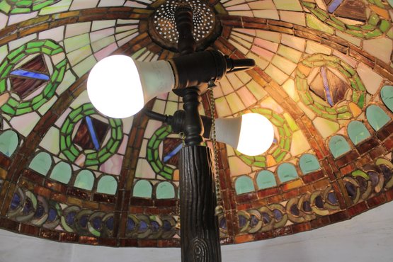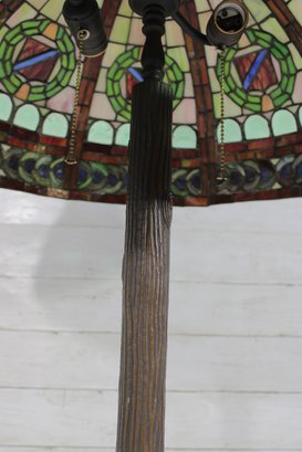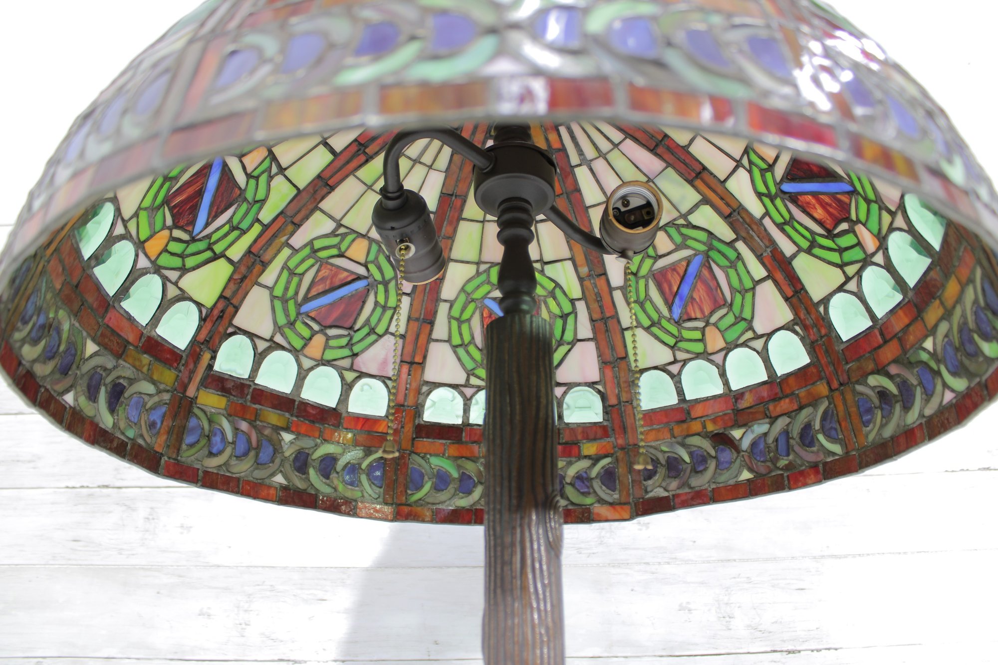 The lamp is supported by a classic bronze-tone base with flowing, sculpted details that complement the shade’s refined pattern. With dual sockets and pull chains, it offers adjustable lighting and fills a room with a warm, colorful glow.