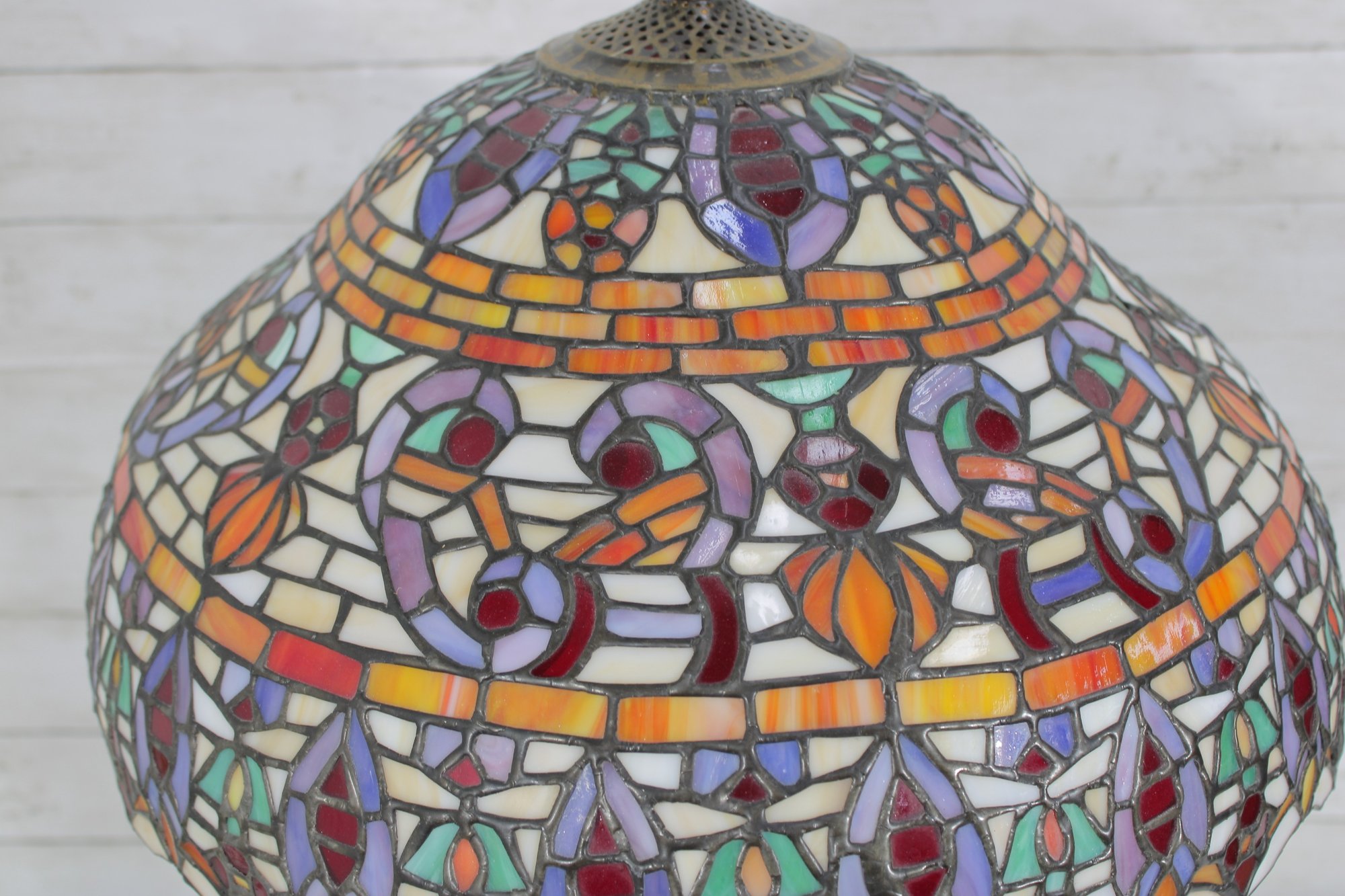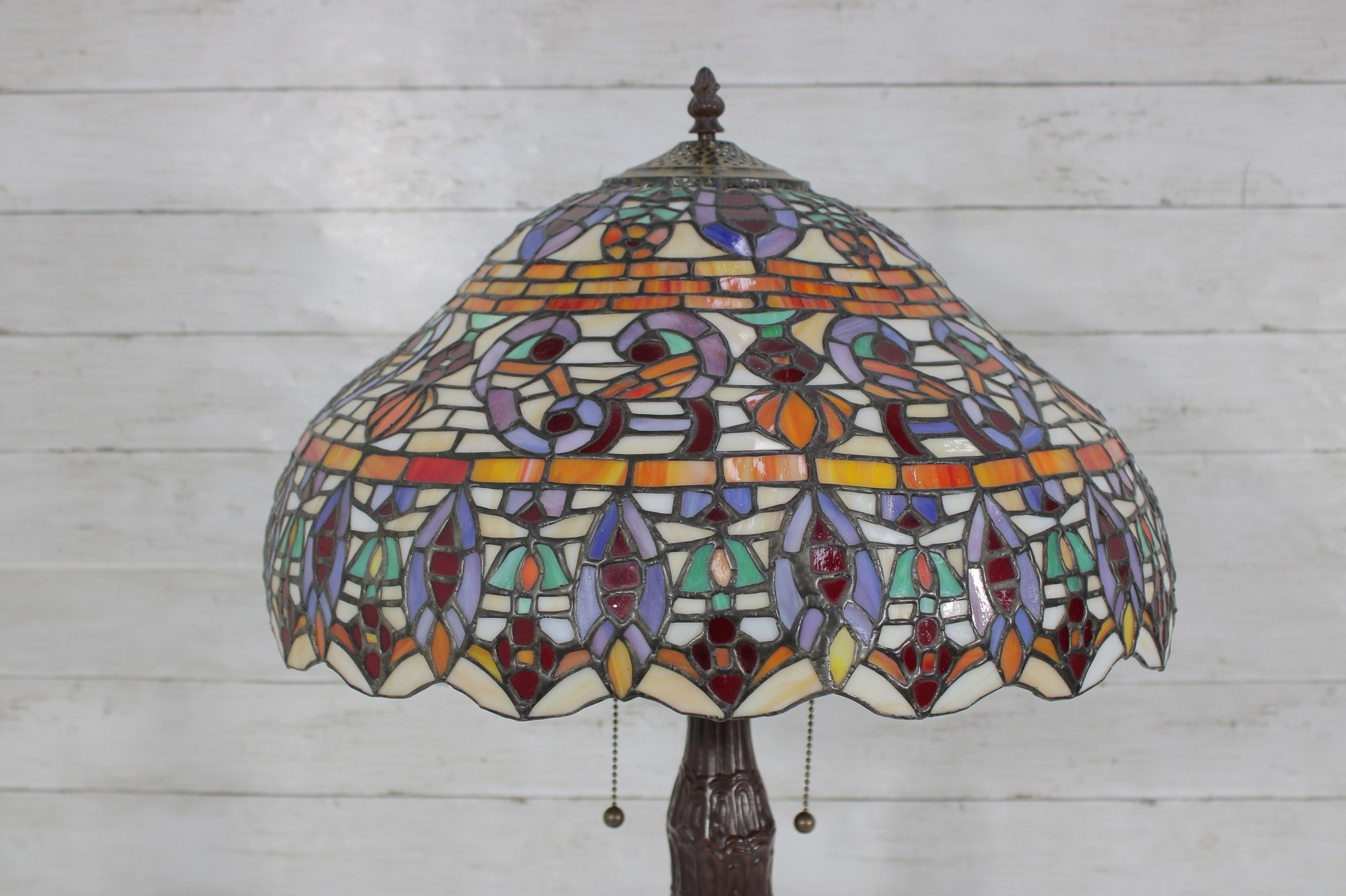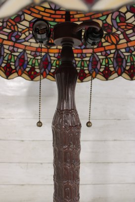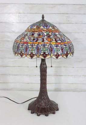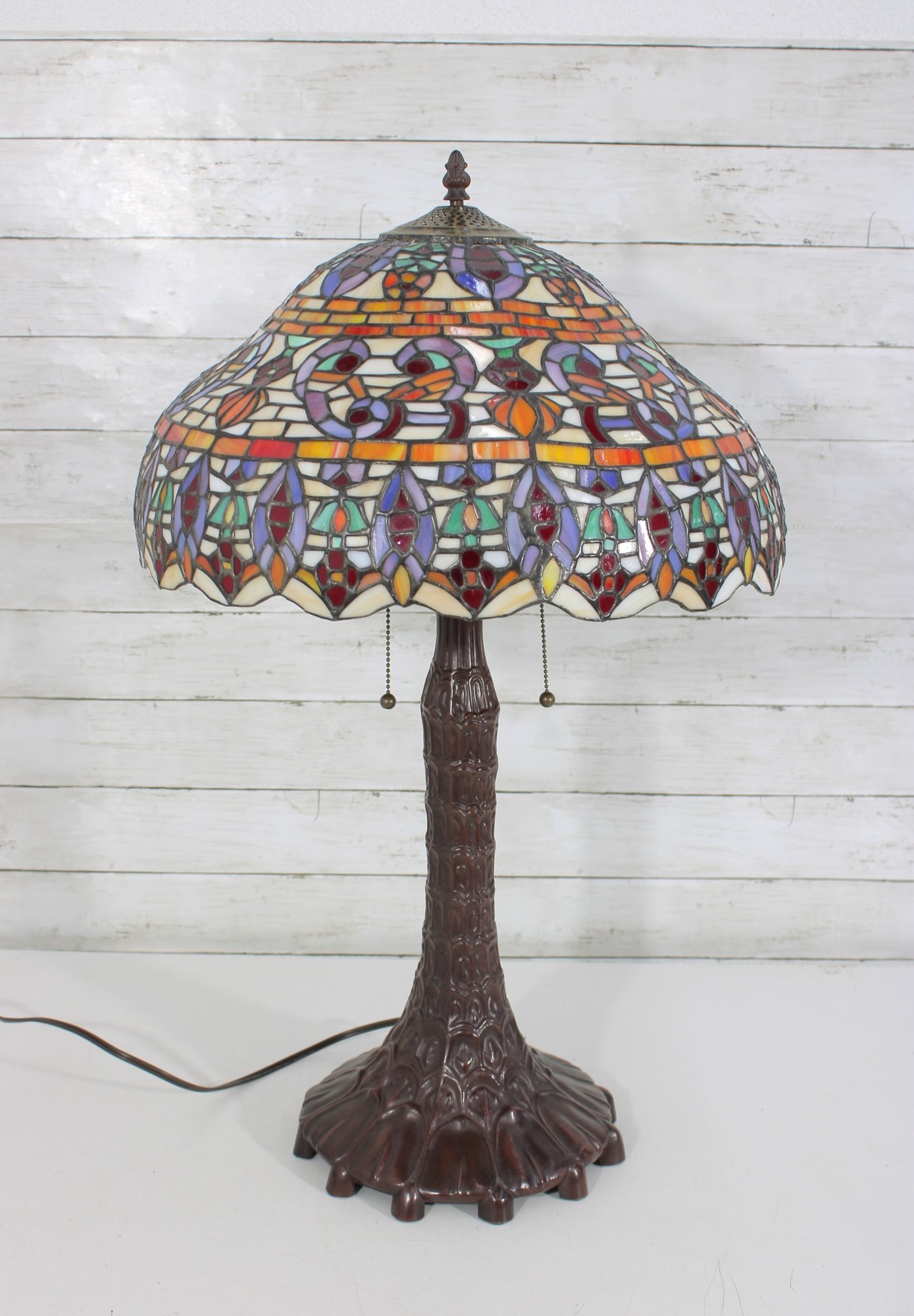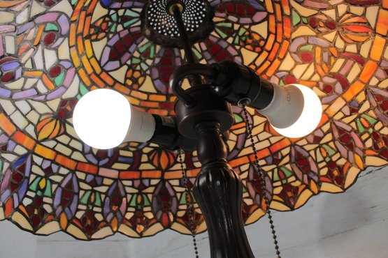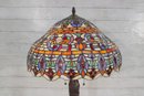 this stunning Tiffany-style table lamp. Standing an impressive 29 inches tall, this lamp features a beautifully crafted shade with vibrant jewel tones in an intricate mosaic pattern. The rich colors glow warmly when illuminated, creating a classic, inviting atmosphere.