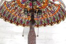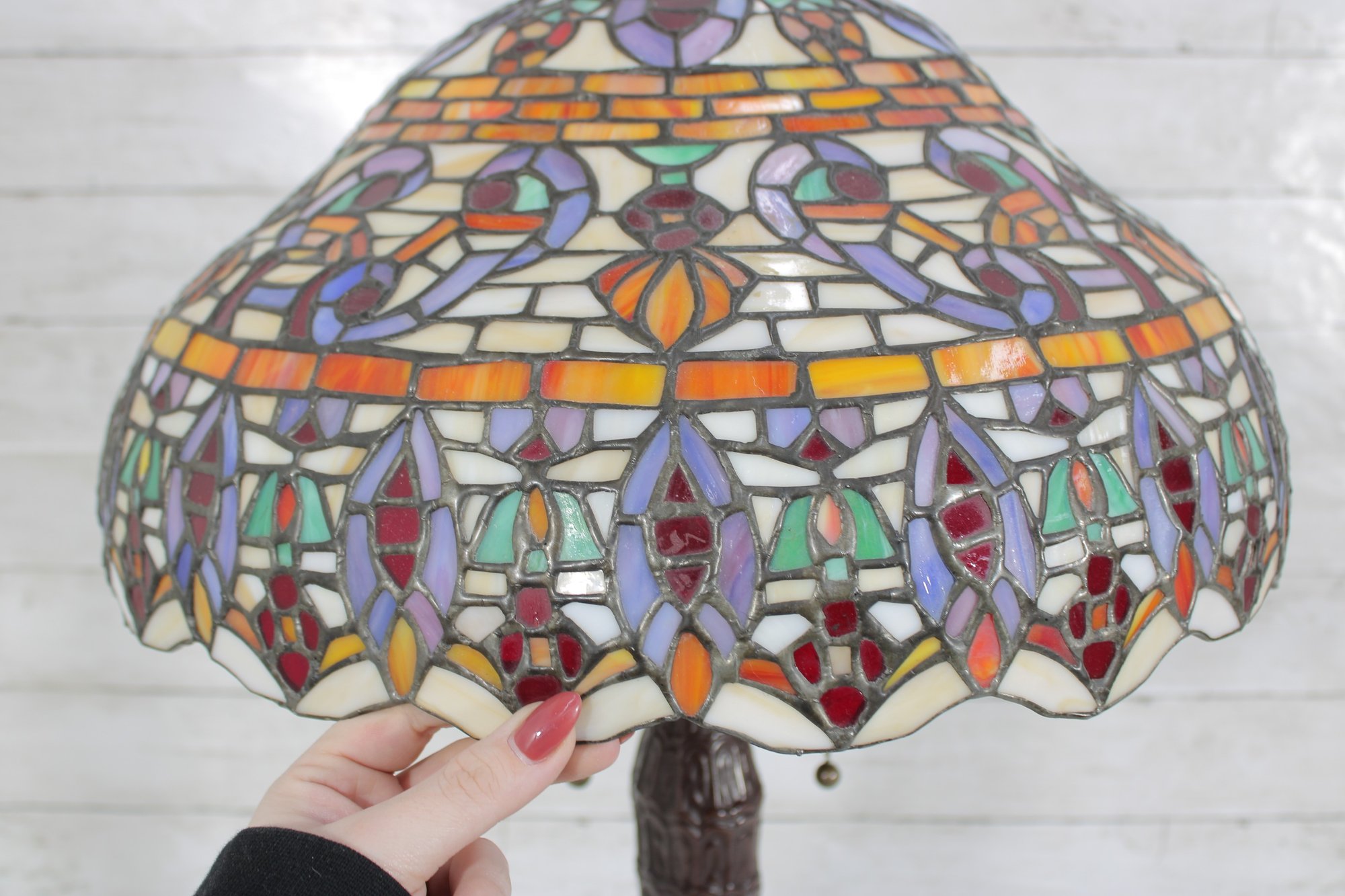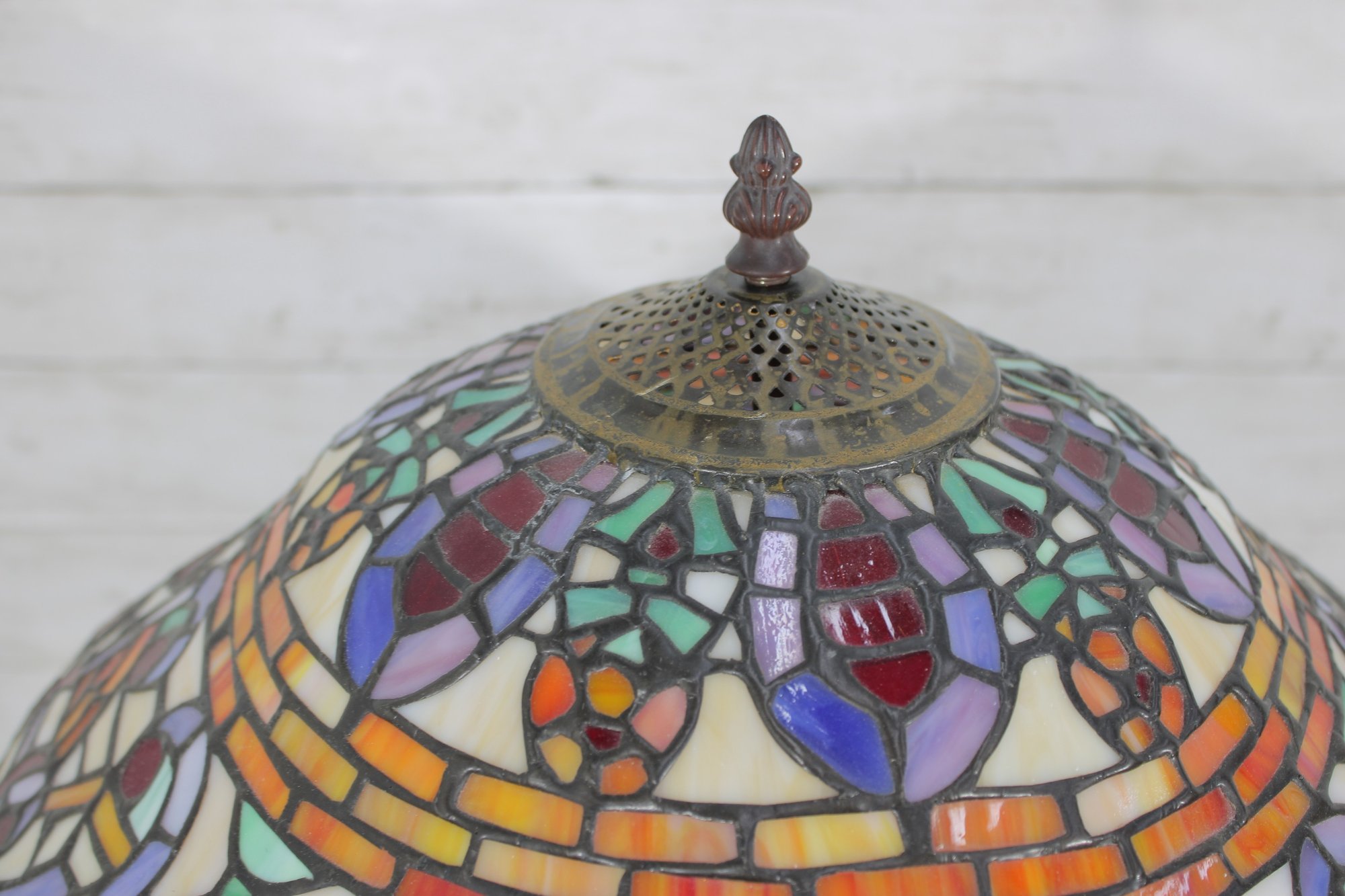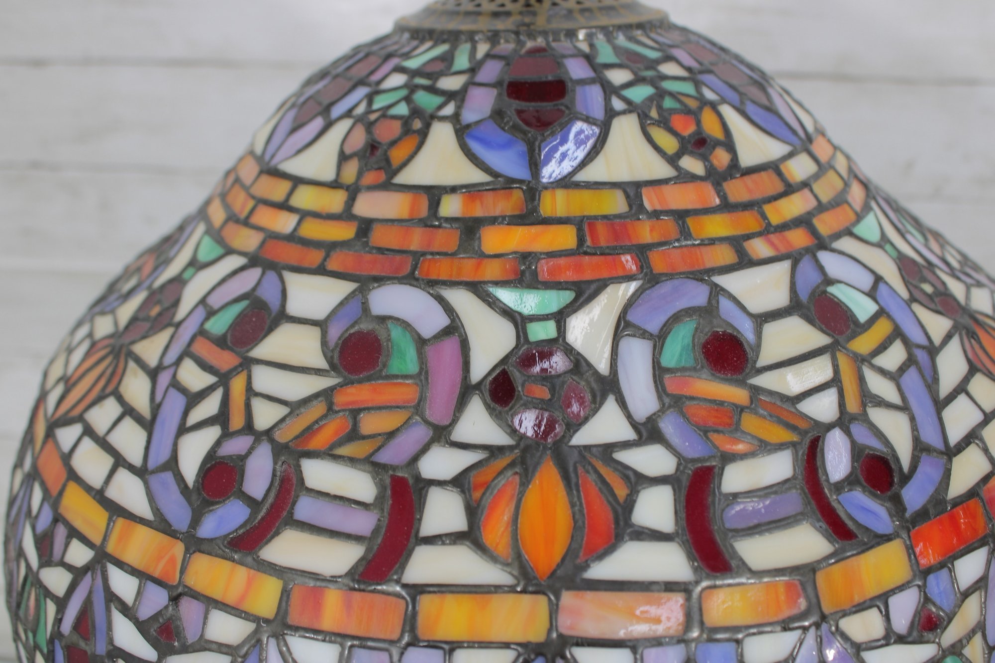 this stunning Tiffany-style table lamp. Standing an impressive 29 inches tall, this lamp features a beautifully crafted shade with vibrant jewel tones in an intricate mosaic pattern. The rich colors glow warmly when illuminated, creating a classic, inviting atmosphere.