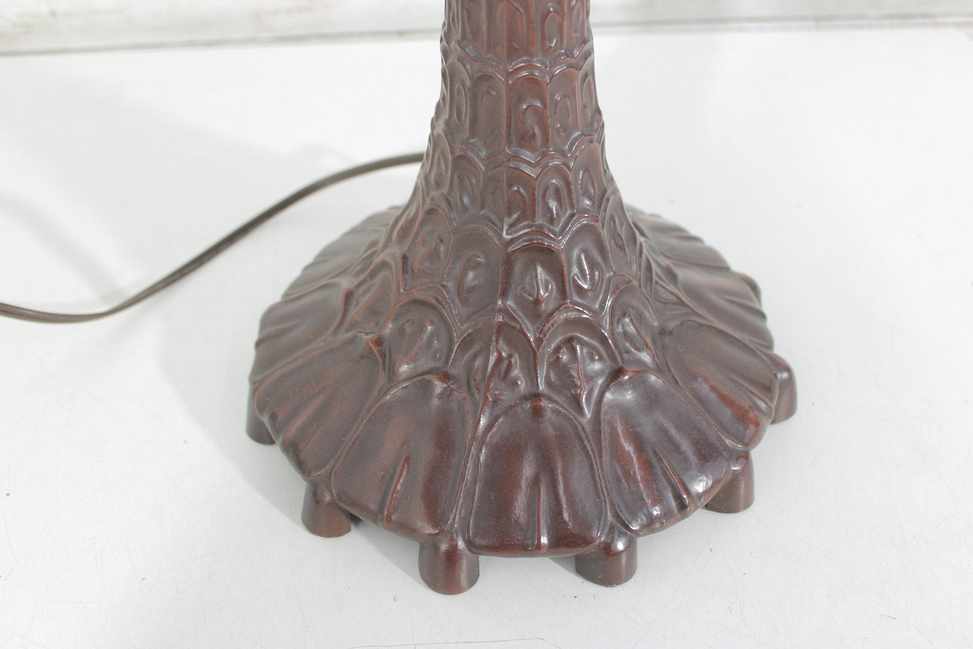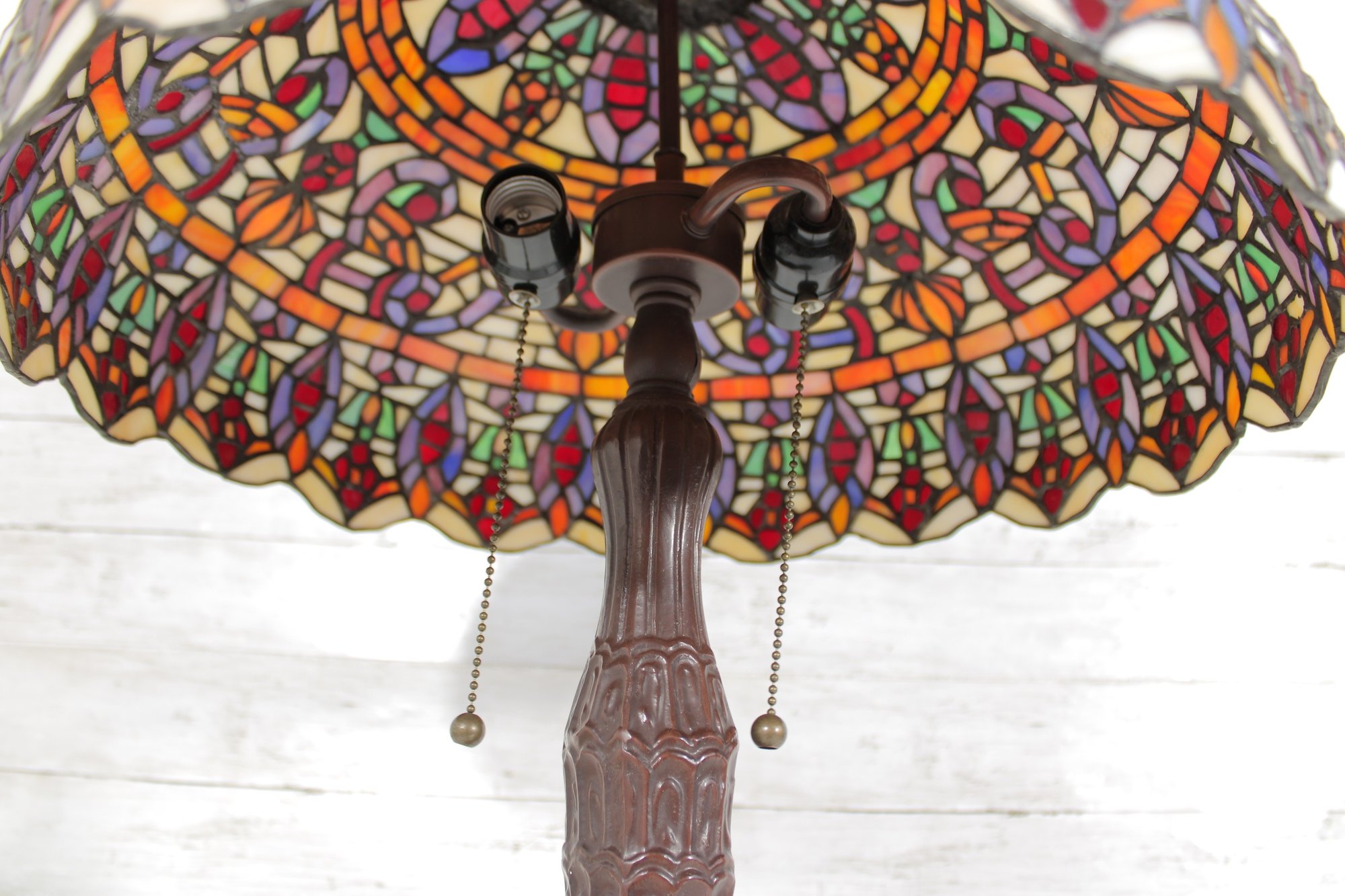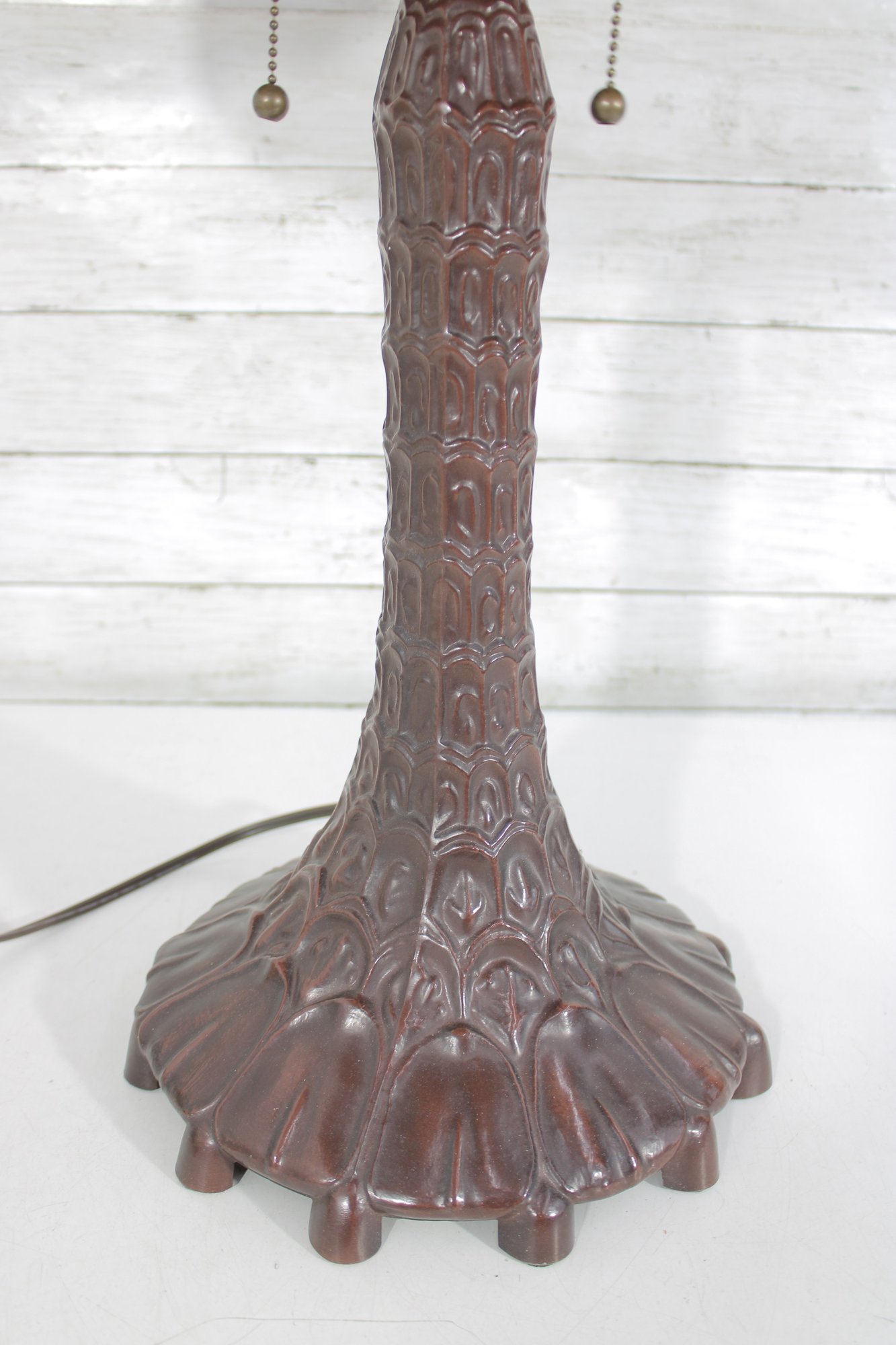 The lamp is paired with an ornate, sculpted bronze-tone base that adds weight, character, and old-world charm. Designed with dual pull chains and two sockets, it offers convenient lighting control and a bright, even glow.