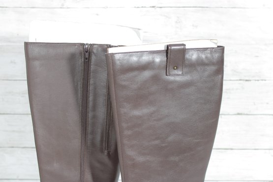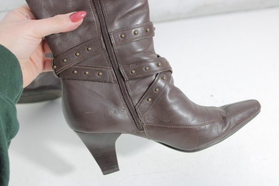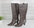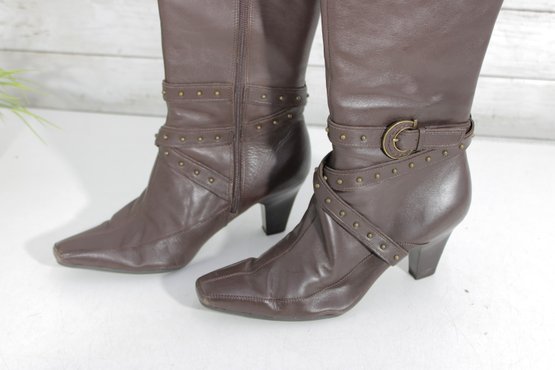 Classic and stylish women’s knee-high leather boots in a rich brown tone. These boots feature elegant buckle and stud detailing around the ankle, a sleek pointed toe, and a comfortable block heel—perfect for dressing up or elevating everyday outfits.
