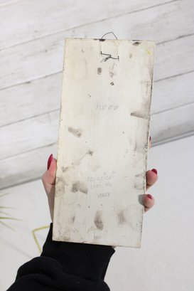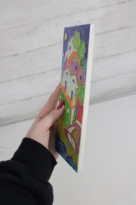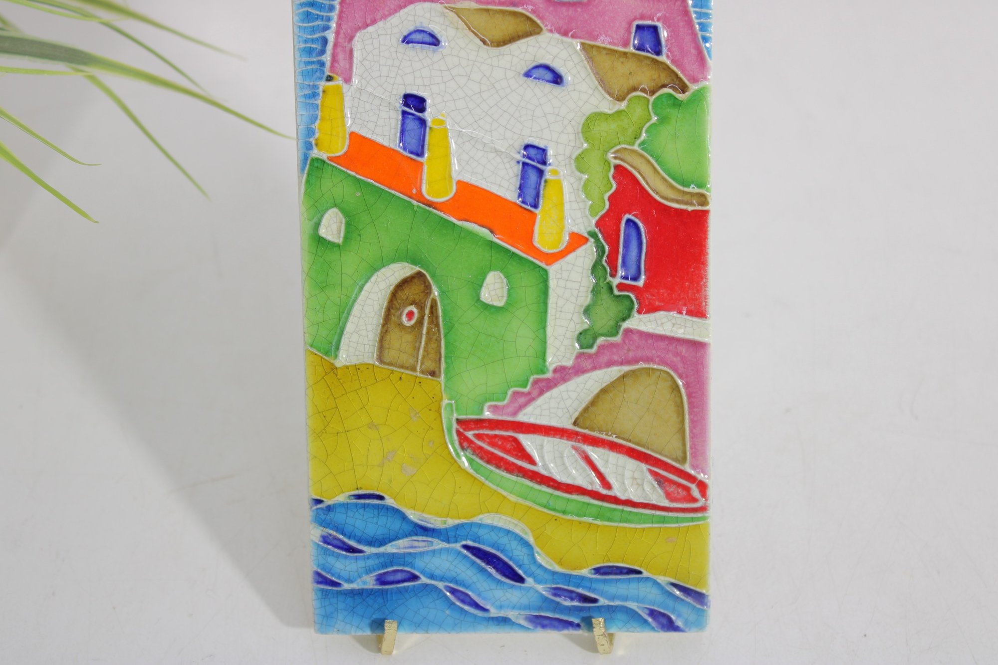 Executed in vivid, glossy enamels, the tile has a lively, almost storybook quality with raised outlines and rich colors typical of Italian decorative ceramics. The elongated 9.5” x 4” format makes it perfect for display as a wall accent or shelf piece.