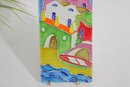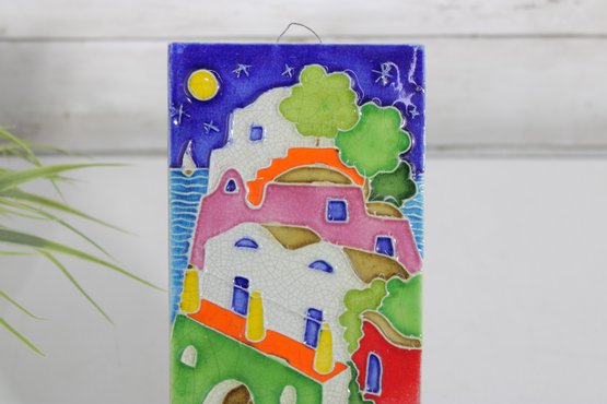 Bright and charming Italian ceramic tile signed Creazioni Luciano Salerno, featuring a whimsical coastal village scene. This hand-painted piece showcases a picturesque hillside with colorful homes, a crescent moon and stars overhead, and a small red boat resting by the water—capturing the warmth and charm of the Italian seaside.