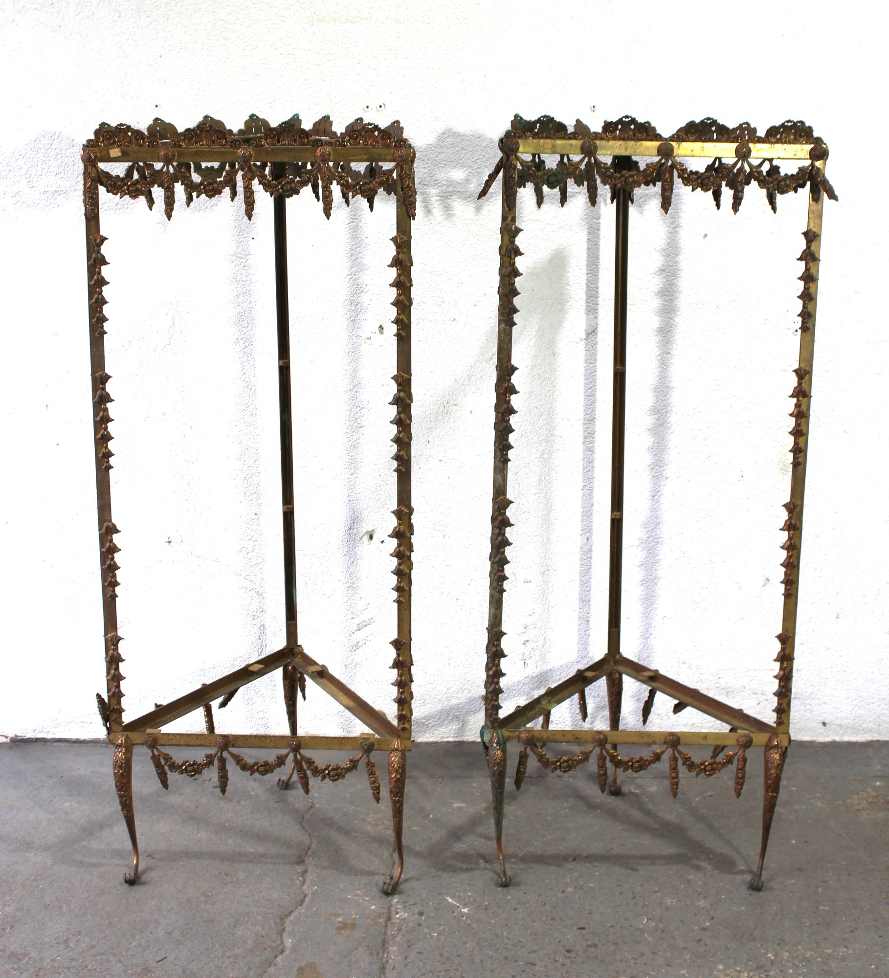 This auction features a stunning pair of vintage 54" tall glass stands, showcasing intricate decorative detailing with ornate garland motifs on the frame. The stands are crafted from metal and exhibit a charming aged patina. Originally designed to hold glass panels, the glass is no longer present, allowing for creative restoration or alternative use. Ideal for adding a touch of elegance to any space. Some signs of wear consistent with age.