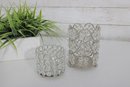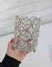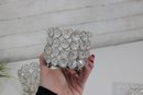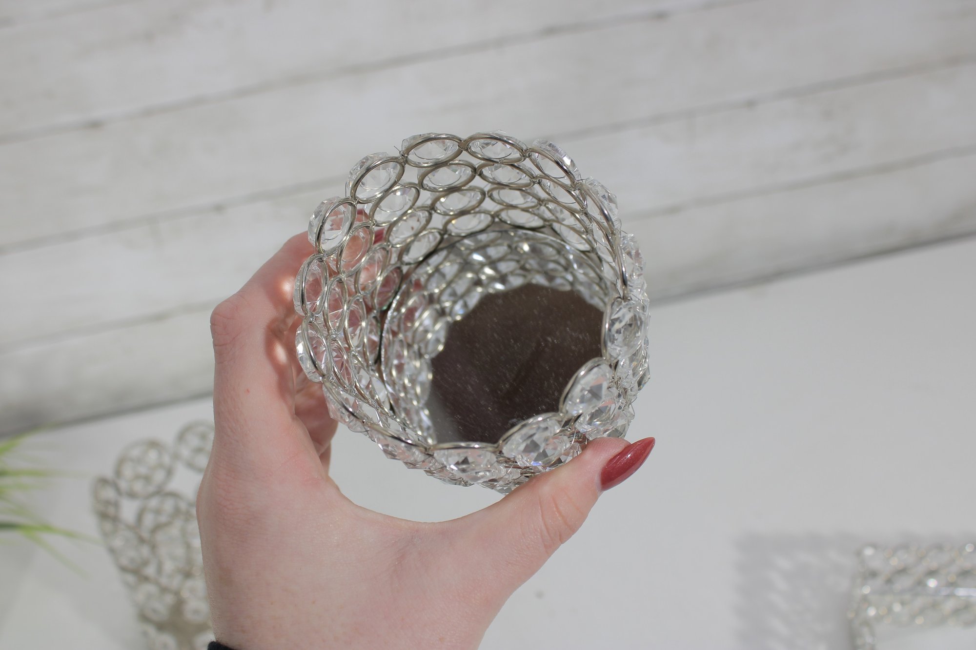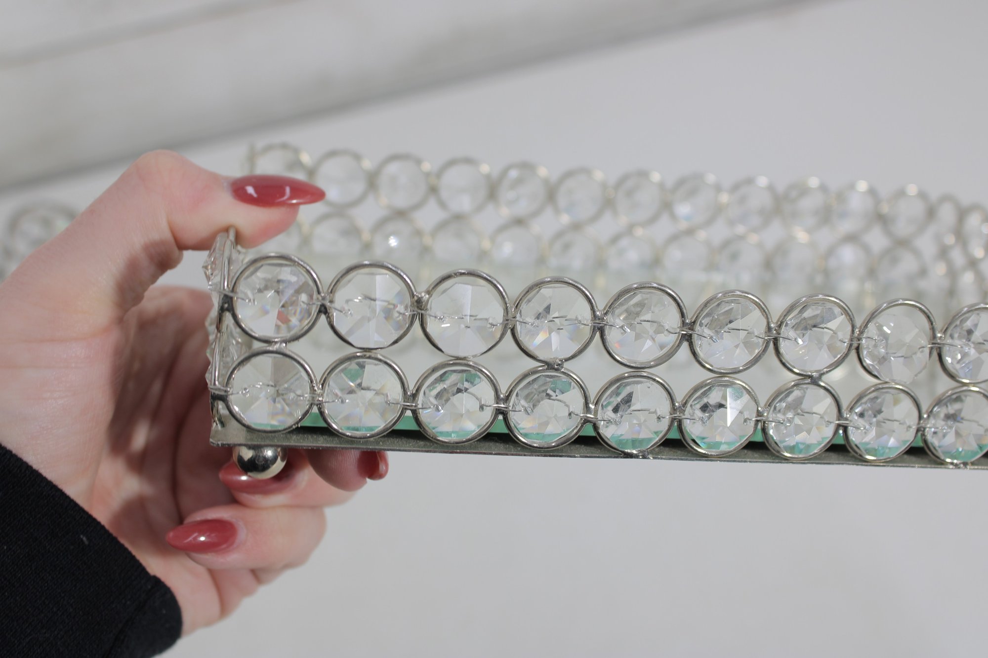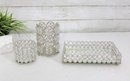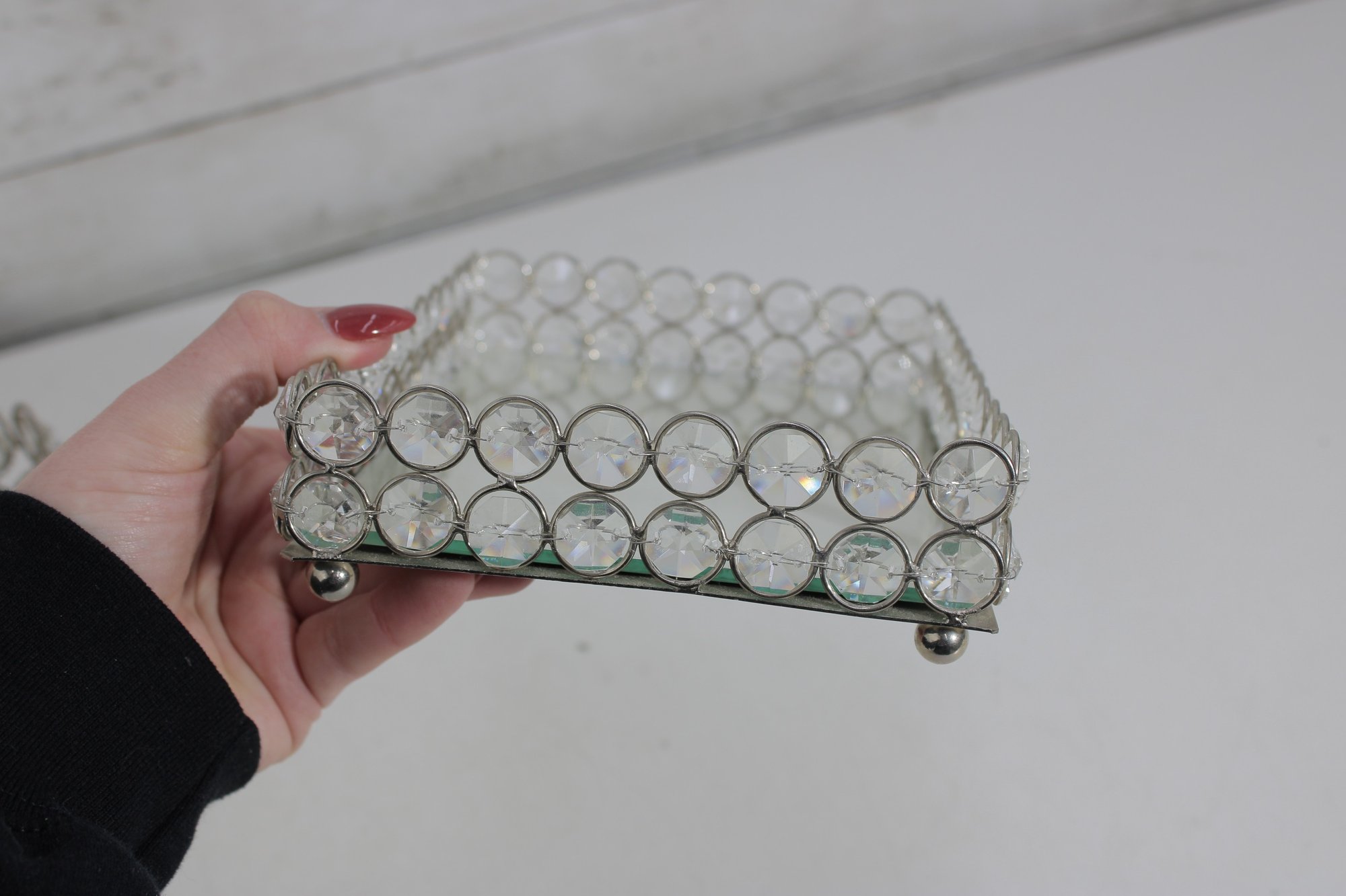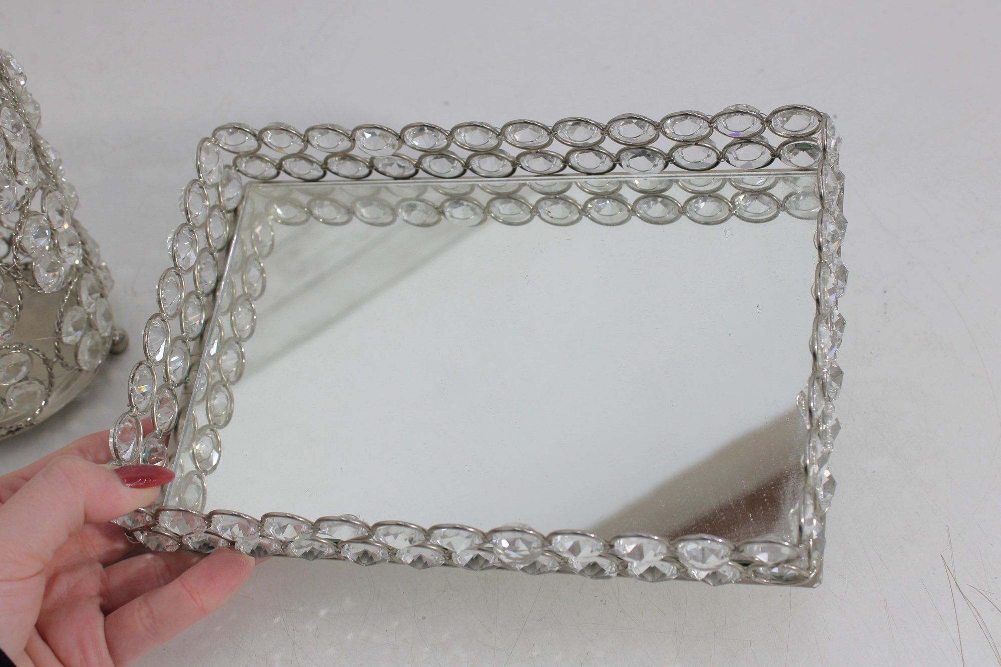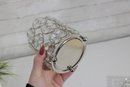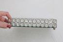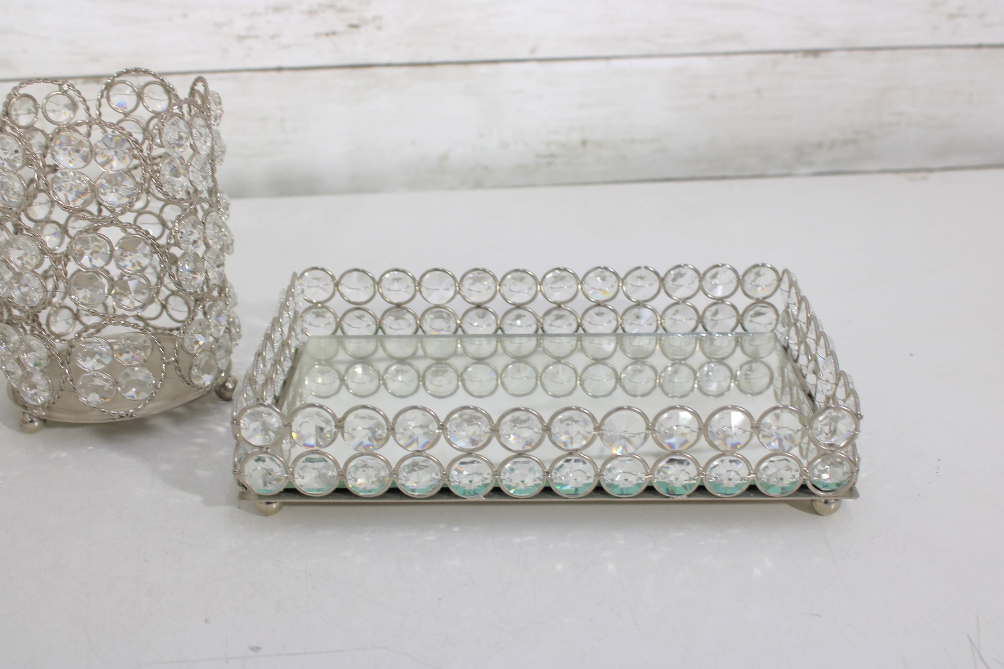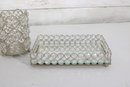Each piece features an openwork metal design with circular settings holding clear crystal-style beads that catch and reflect light beautifully. The tray has a mirrored base and small feet, making it perfect for displaying perfumes, cosmetics, candles, or jewelry.
