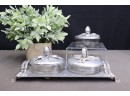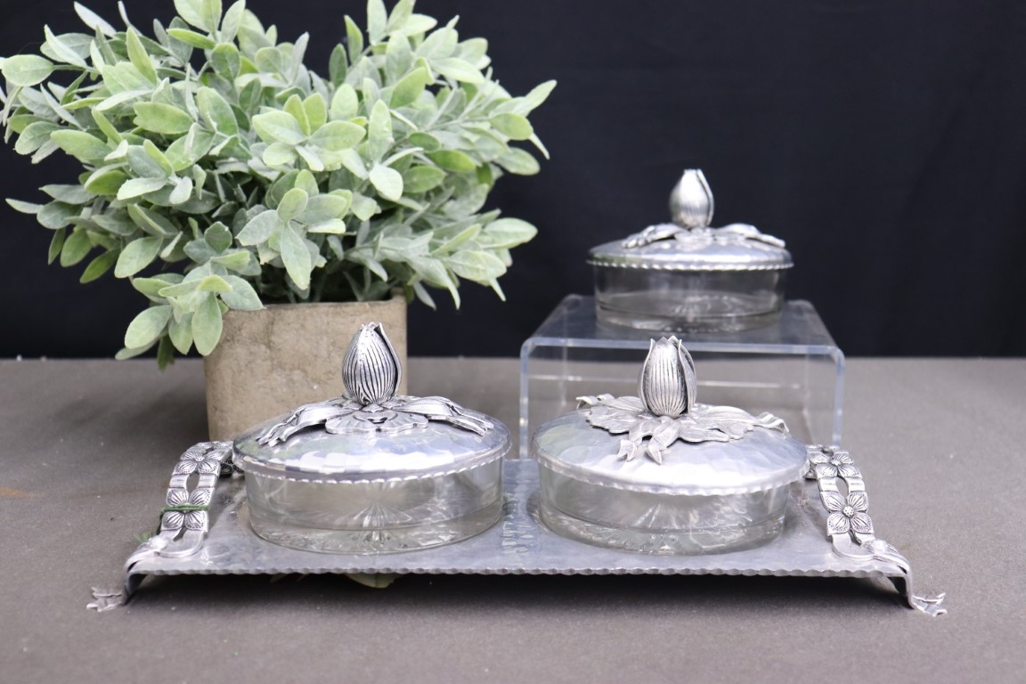 3 Rodney-Kent Silver Co. Hand Hammered Aluminum Covered 'Tulip' Bowls And Caddy