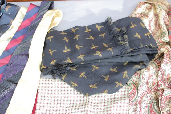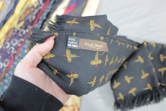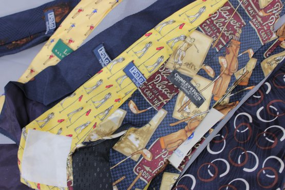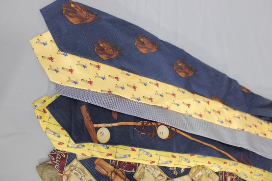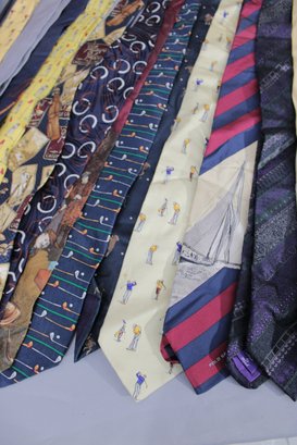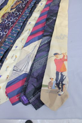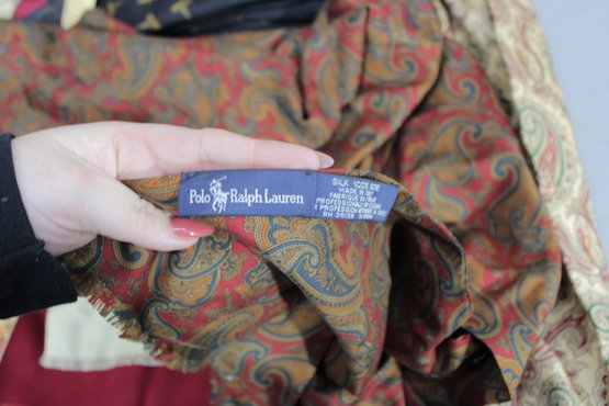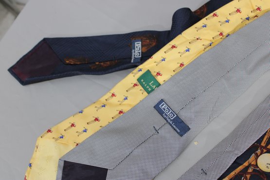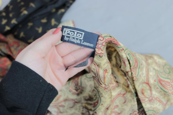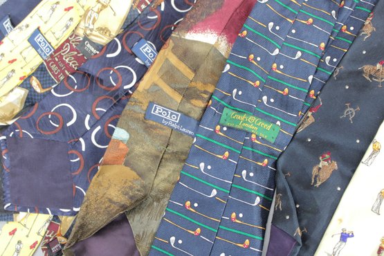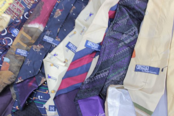 a large mixed lot of men’s neckties, with most being Polo / Polo Ralph Lauren. The group features a wide variety of colors and patterns, including classic stripes, equestrian themes, novelty prints, and traditional menswear designs. Many display the iconic Polo style with horses, riders, and sporting motifs.