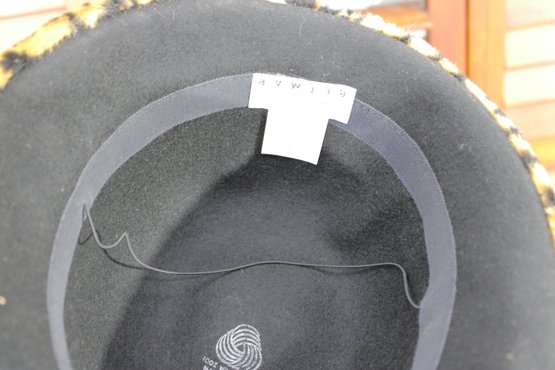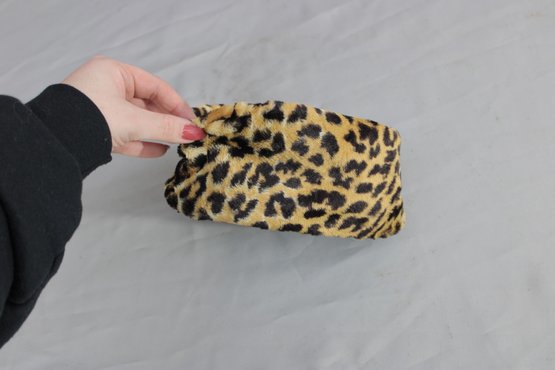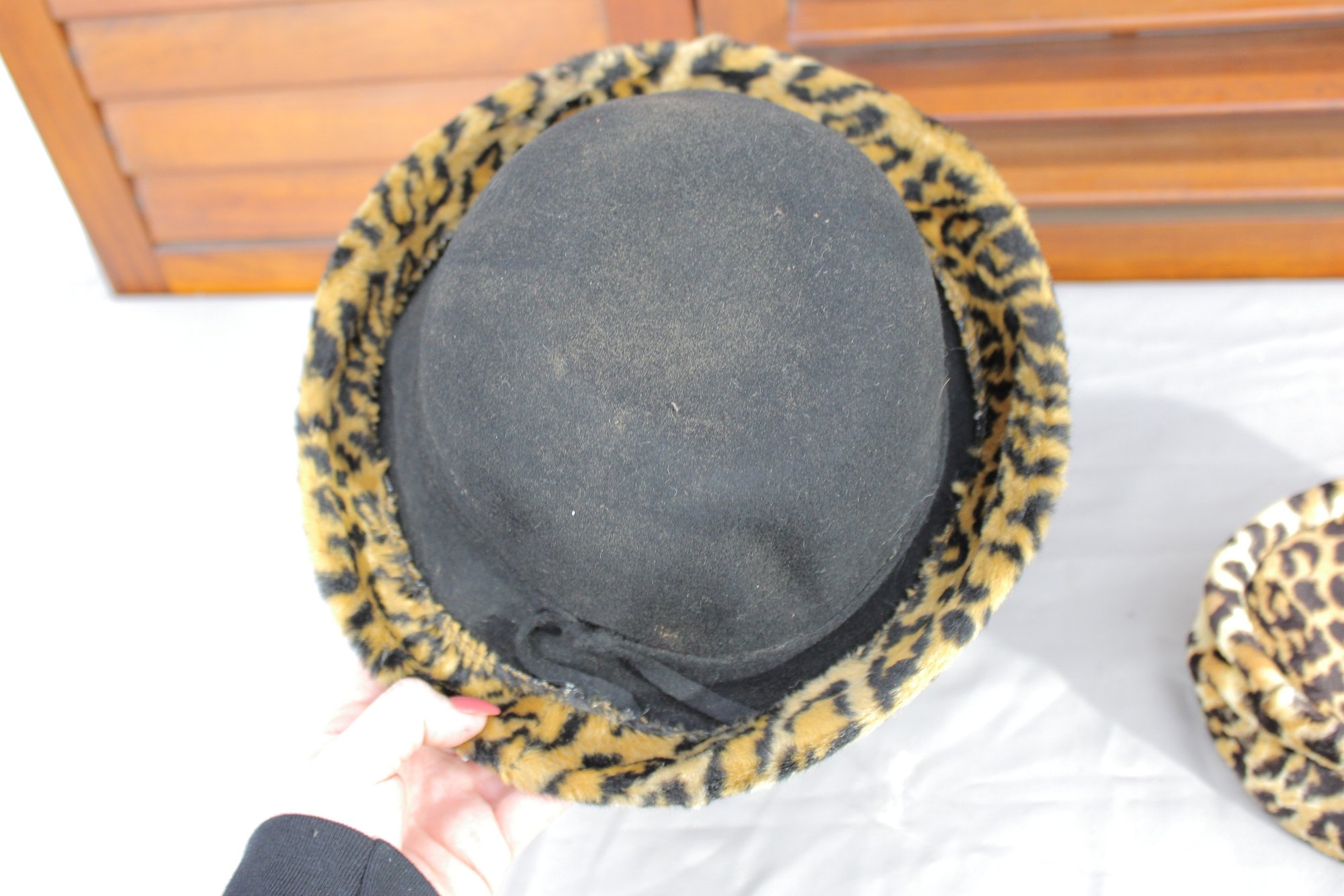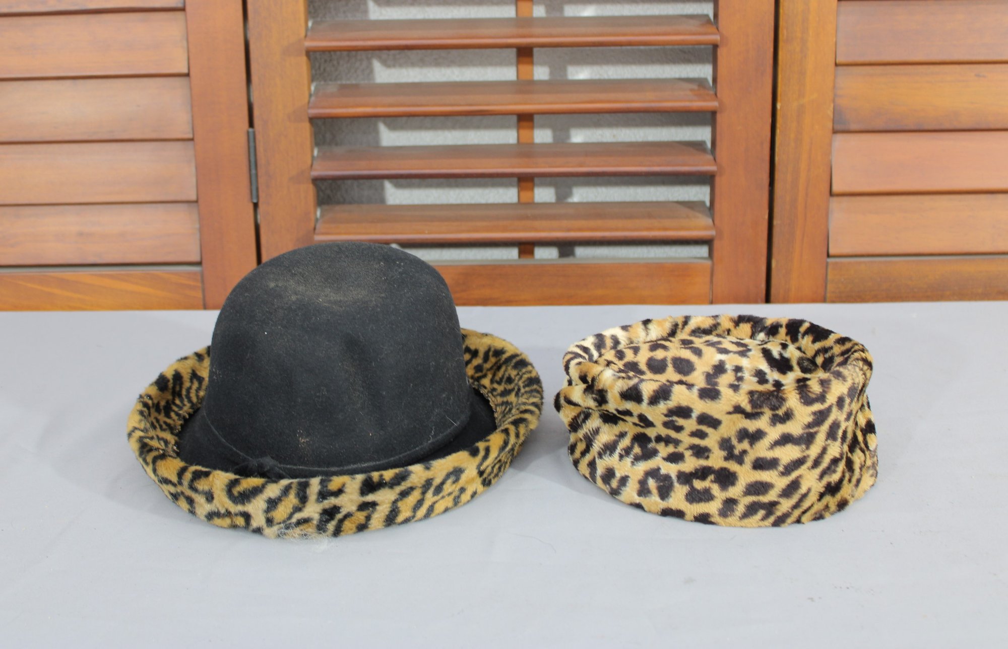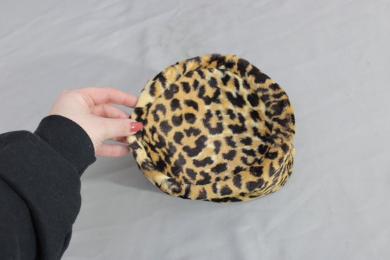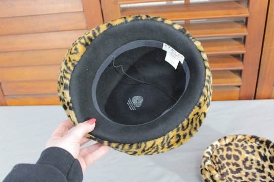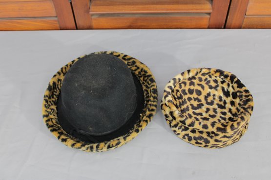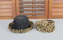 #313-Vintage Leopard Print Hat Lot Black Felt Fedora & Matching Faux Fur Cap 2 Pieces