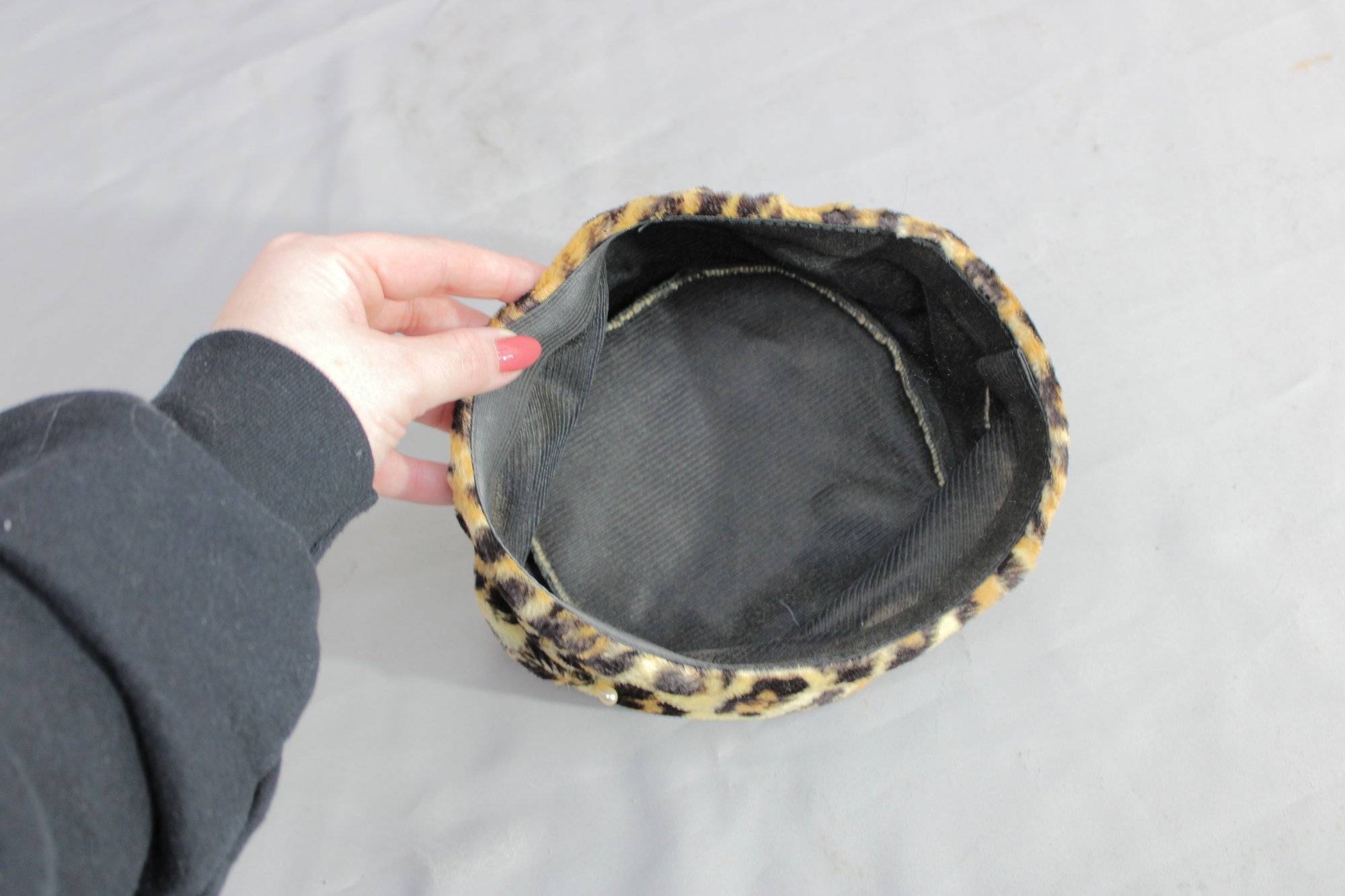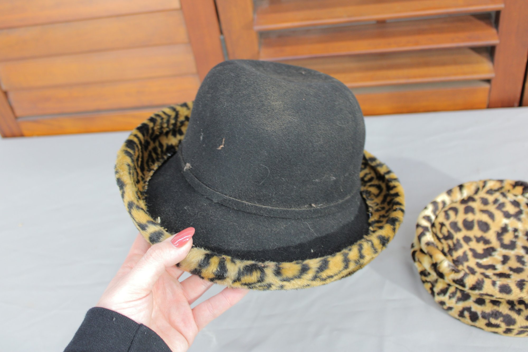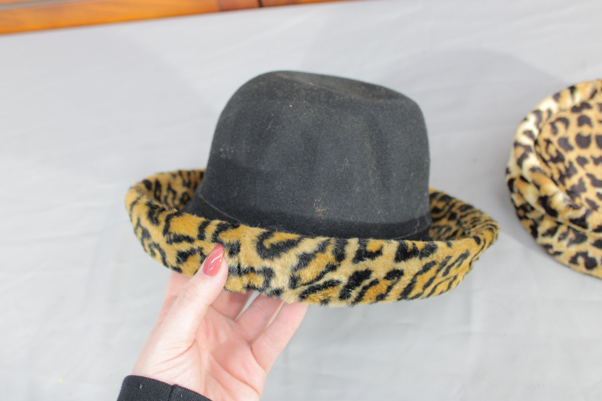 #313-Vintage Leopard Print Hat Lot Black Felt Fedora & Matching Faux Fur Cap 2 Pieces