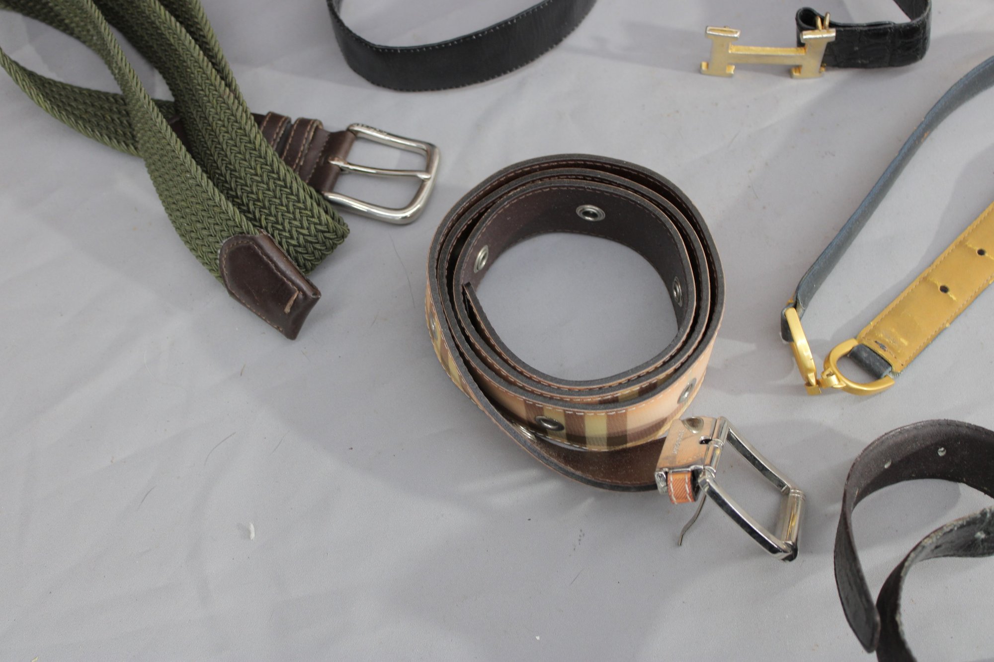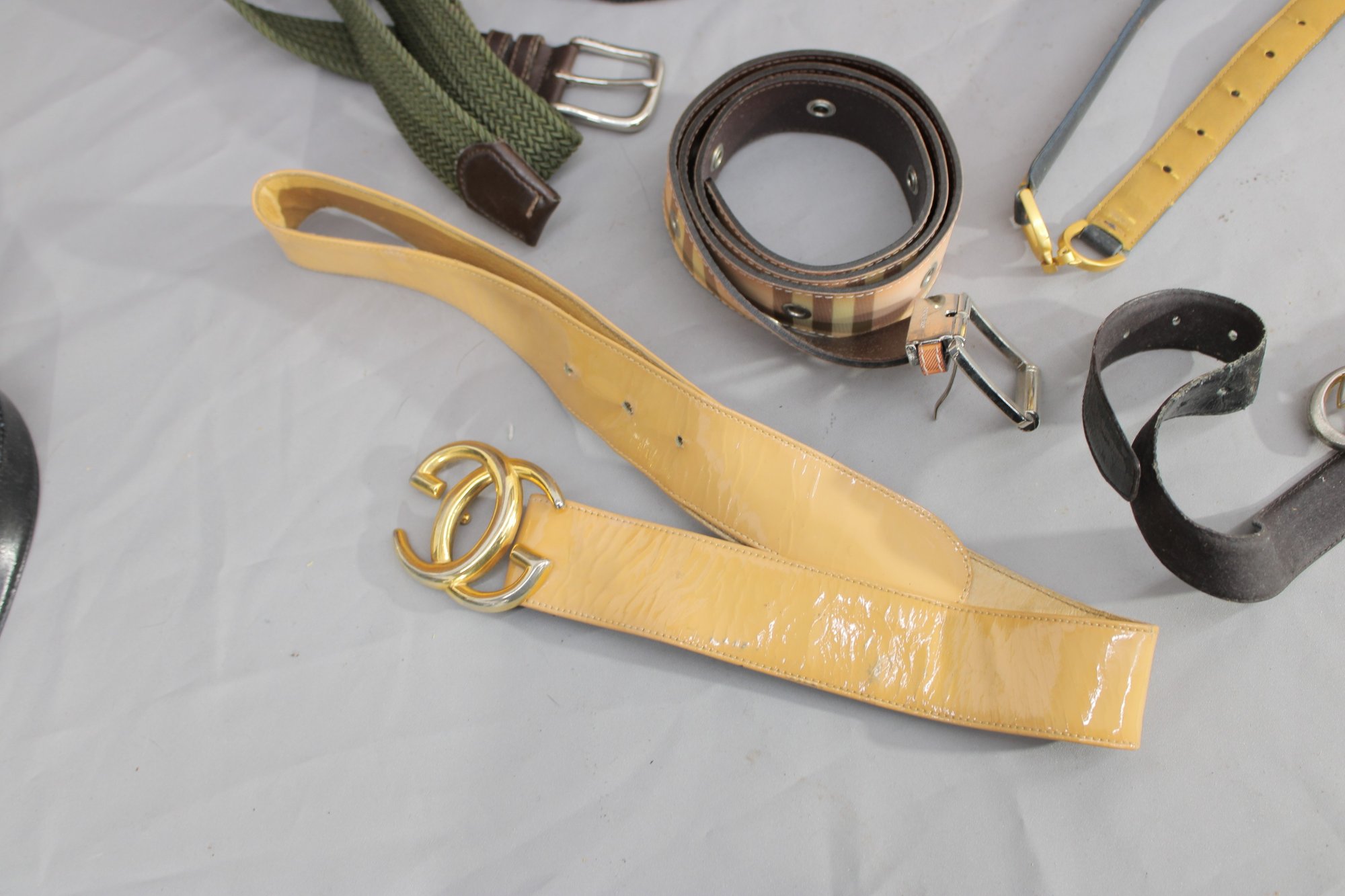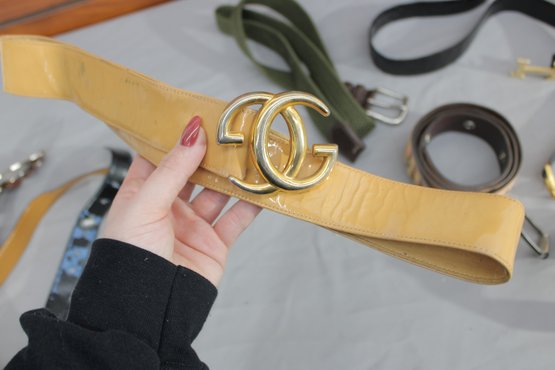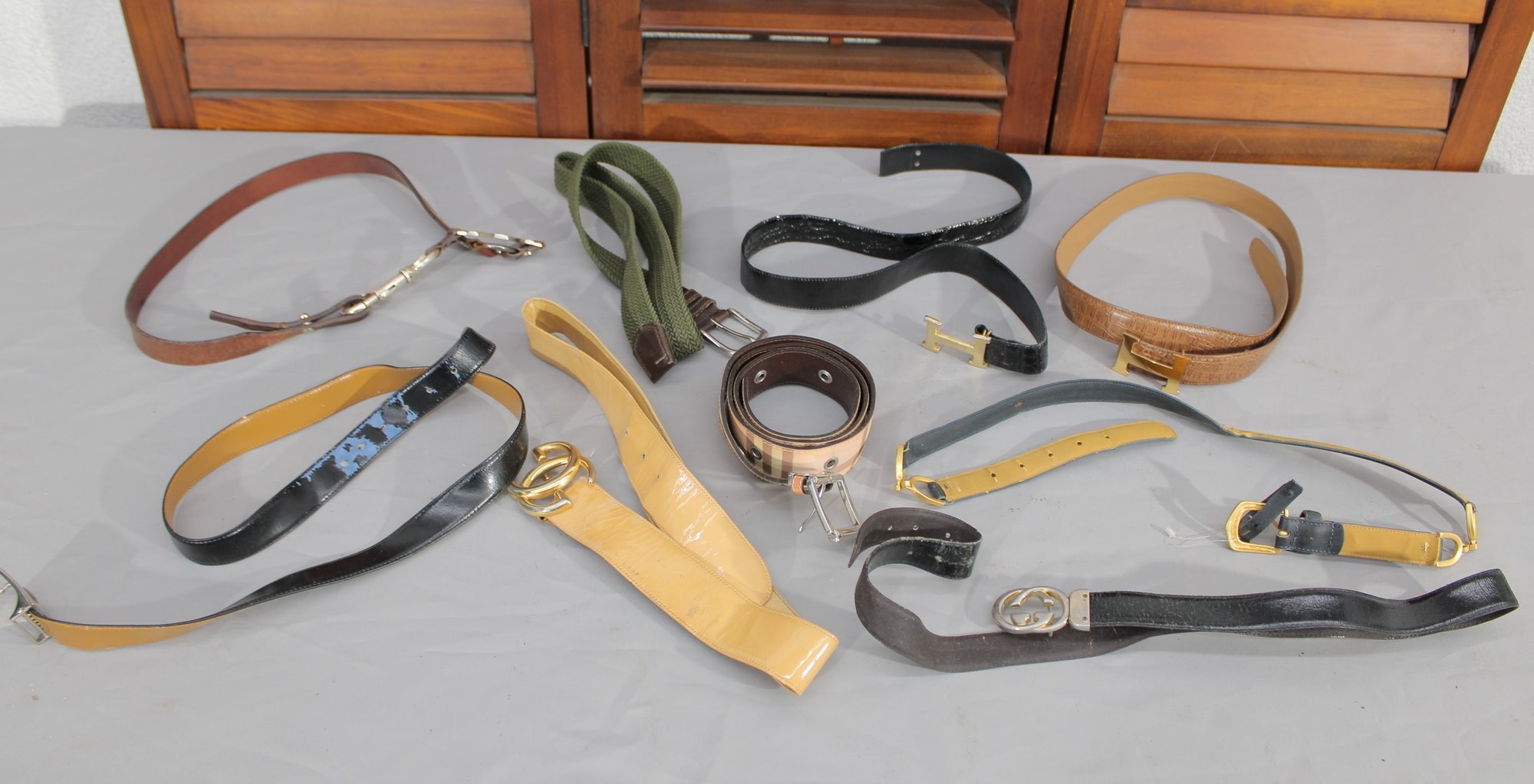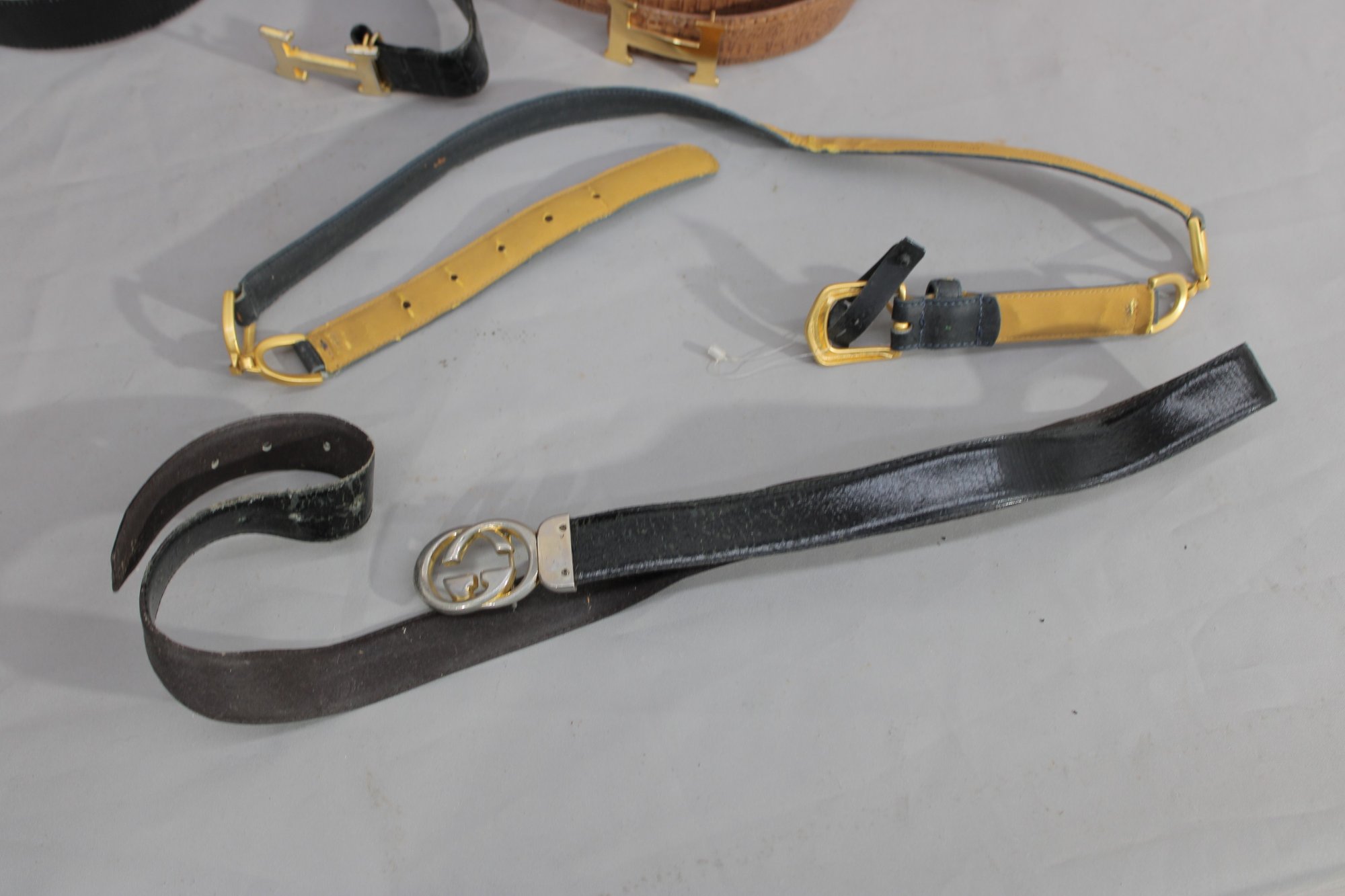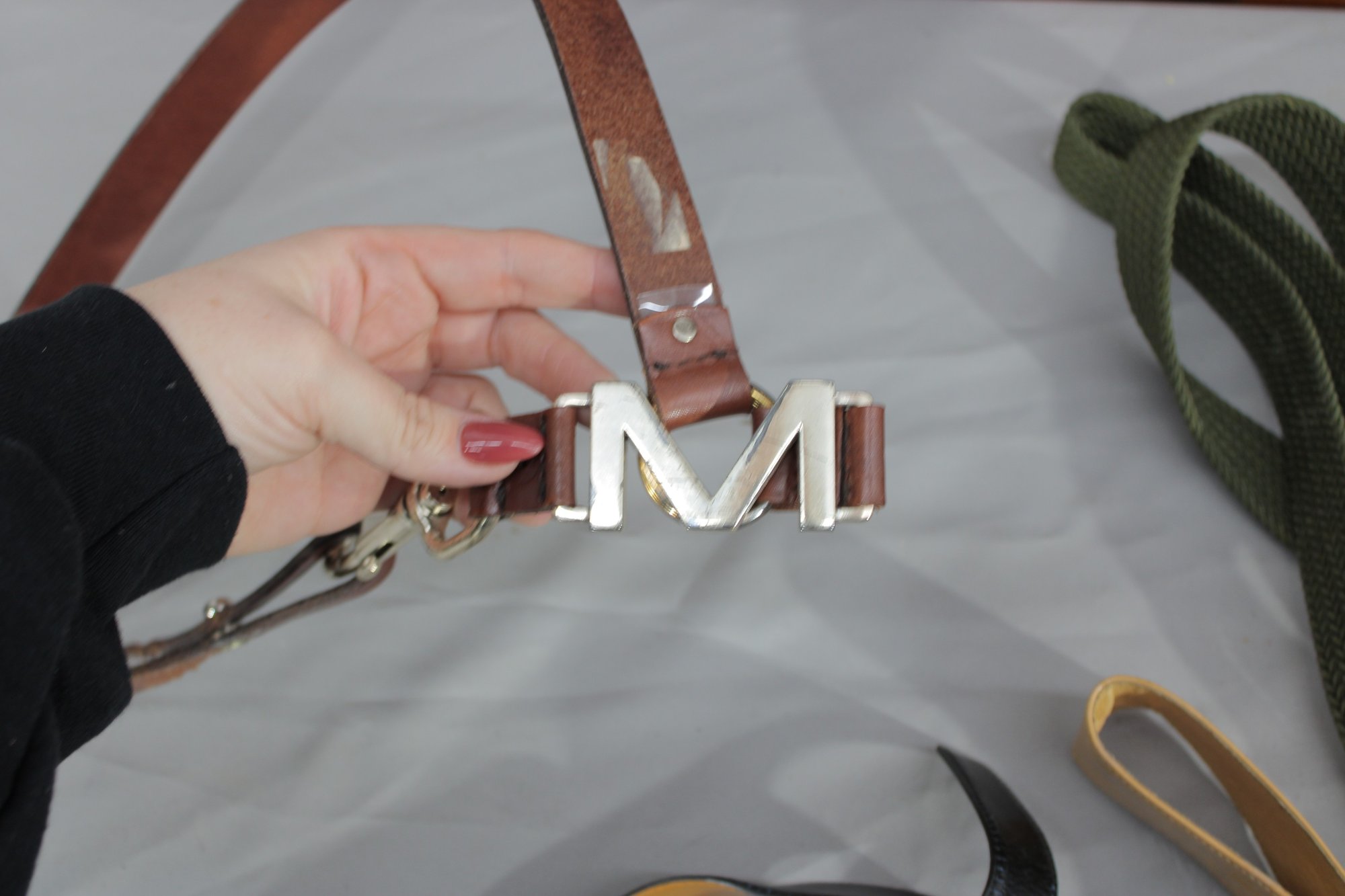 a mixed lot of fashion belts featuring designer-style buckles and looks, including styles resembling “M”, “H”, and interlocking “CC” designs. Belts vary in color, width, and material, with a mix of black, tan, brown, green, and patterned straps.