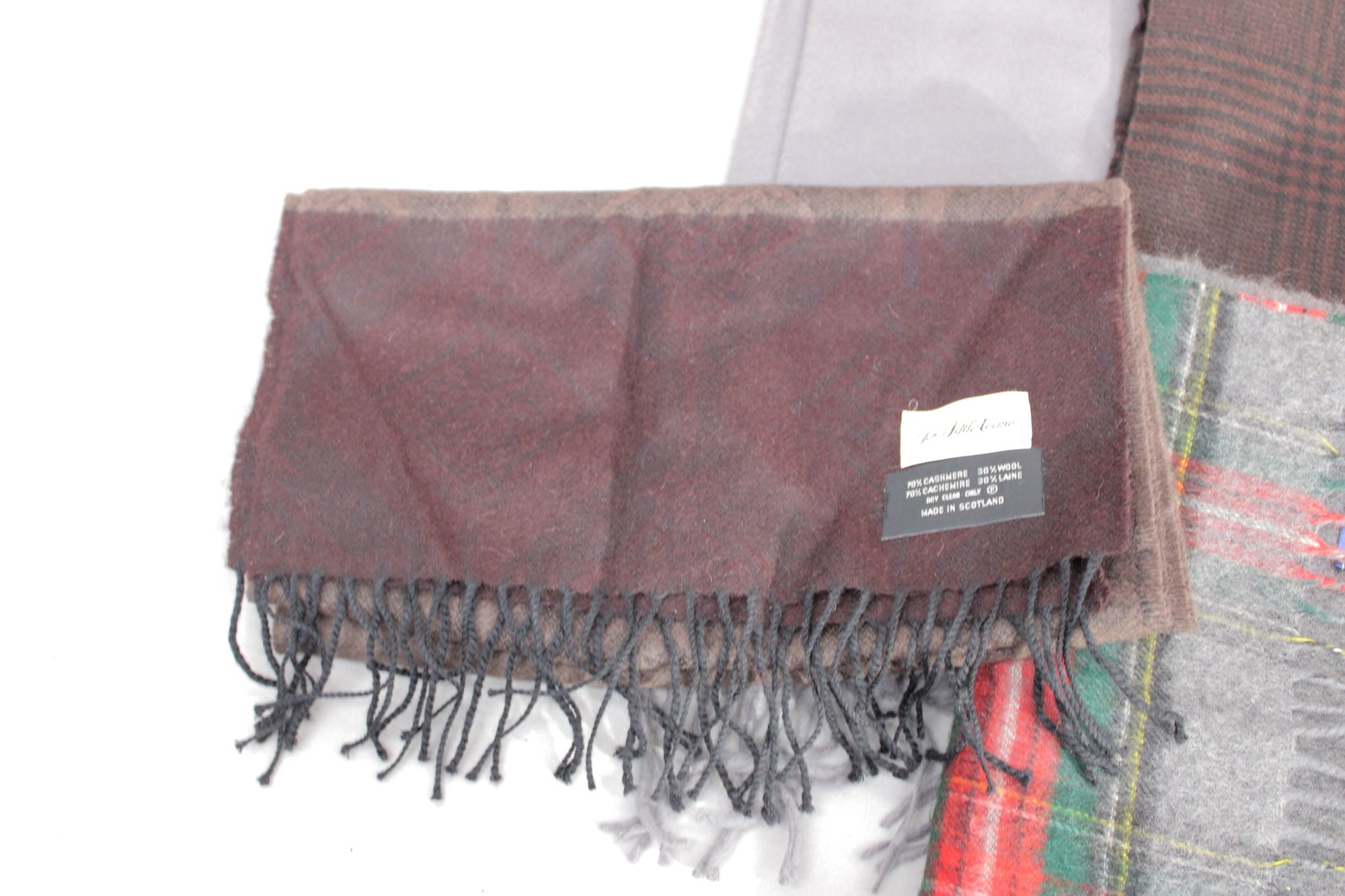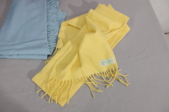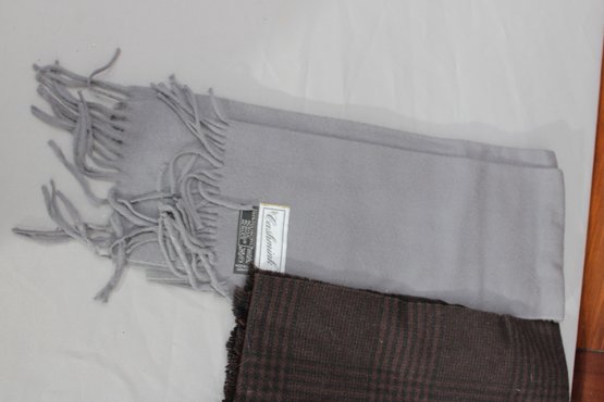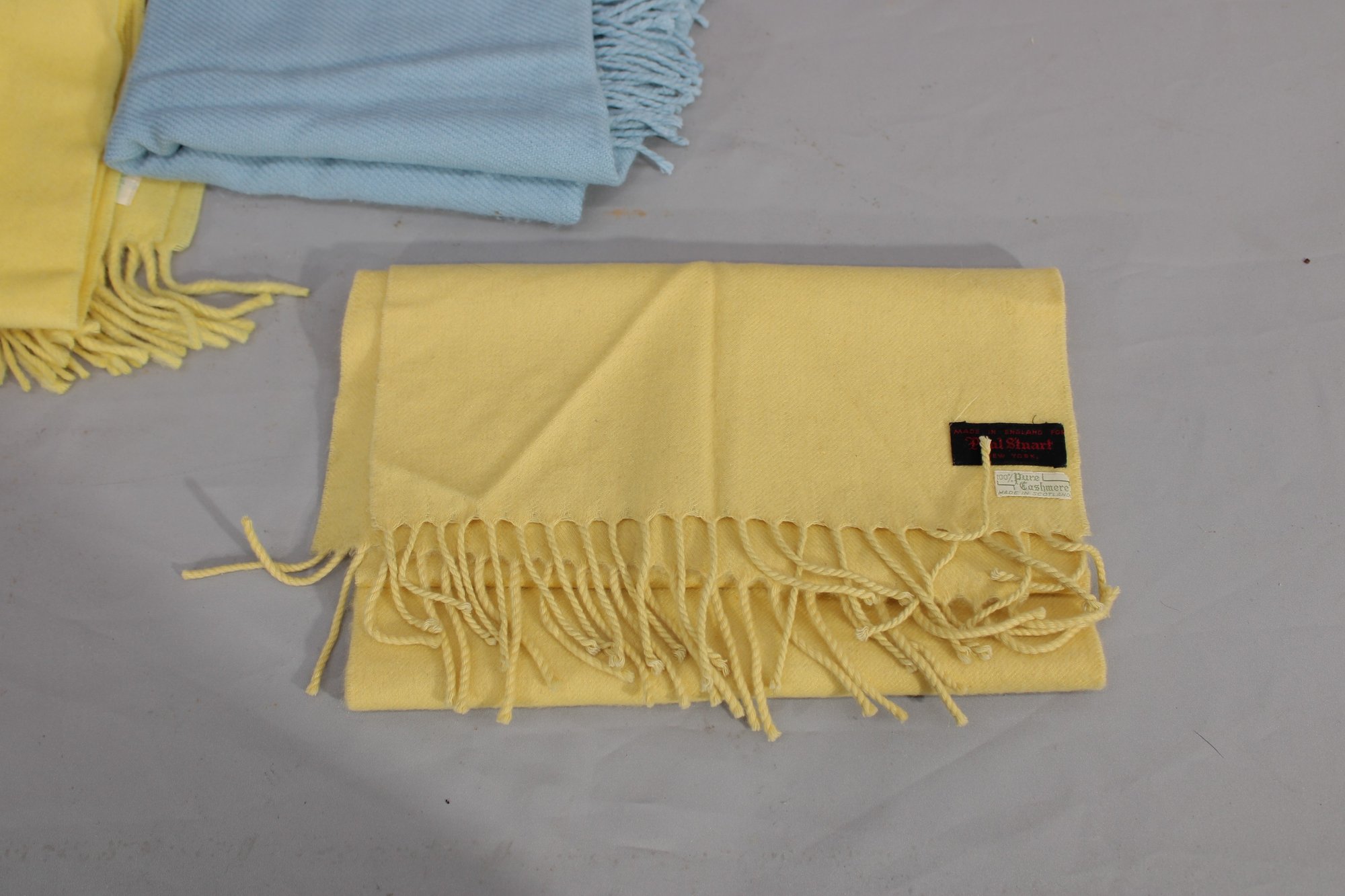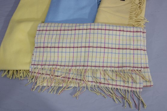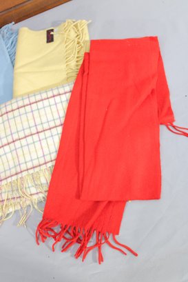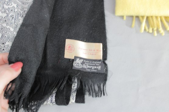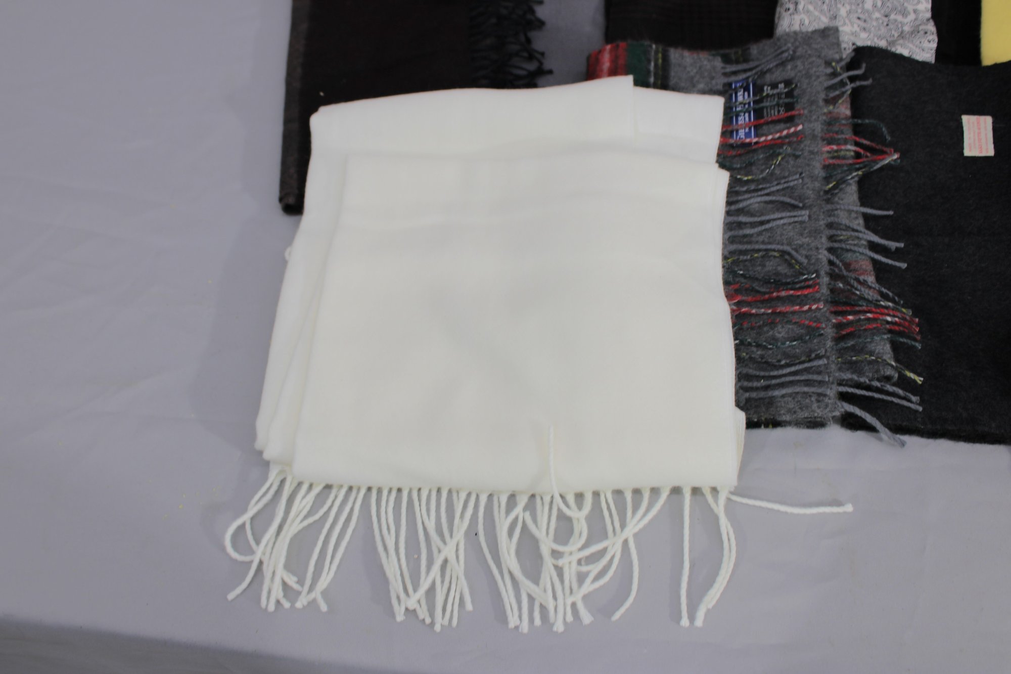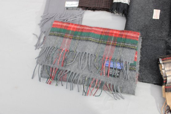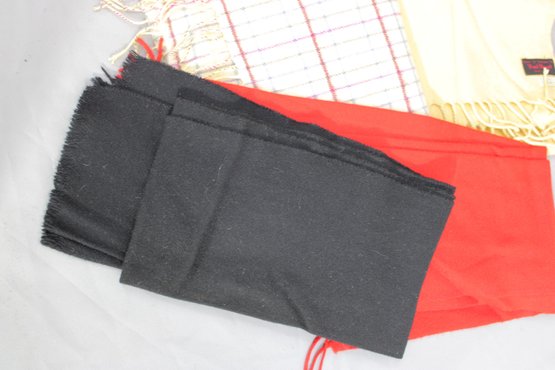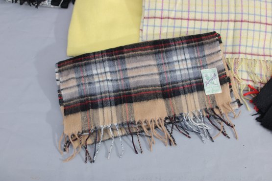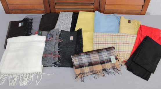 group lot of cashmere scarves in a variety of colors, patterns, and styles. The assortment includes solid colors, plaids, and classic woven designs in shades such as black, white, gray, blue, yellow, red, and neutral tones. Many feature traditional fringe ends and soft, lightweight warmth.