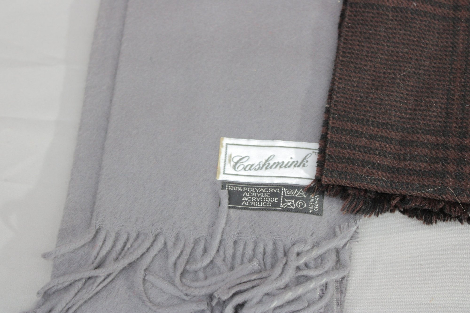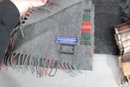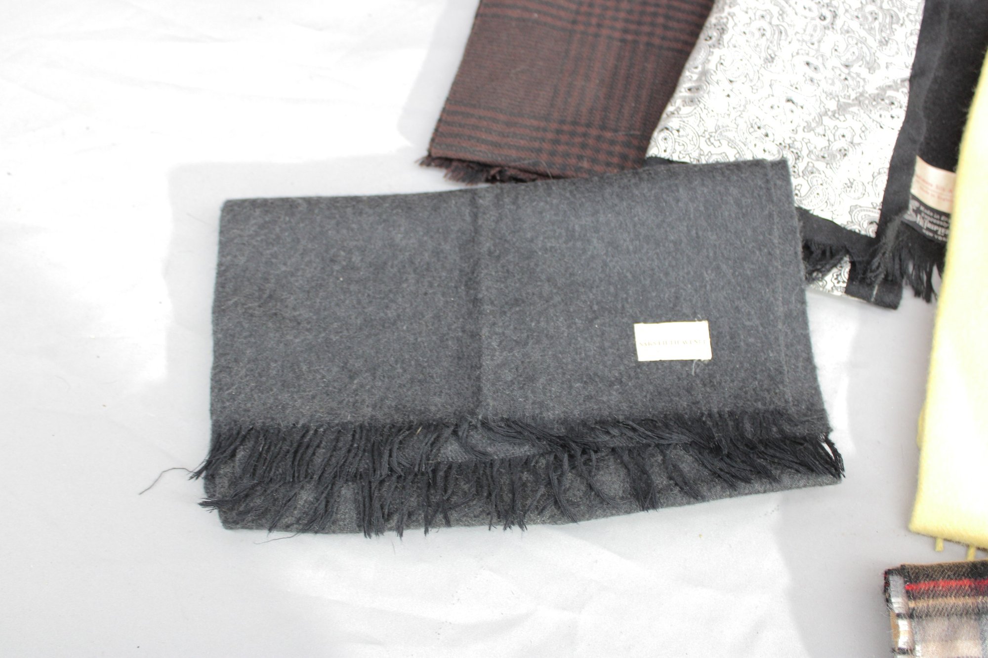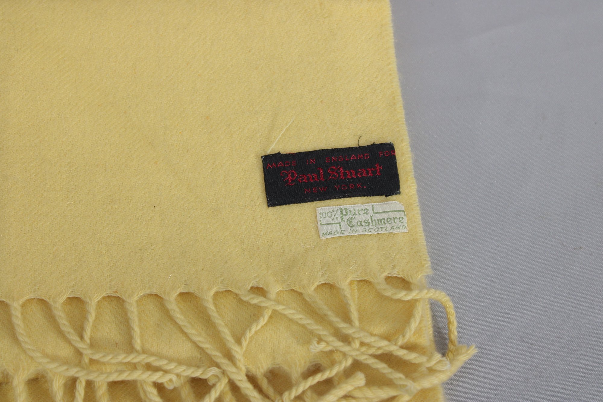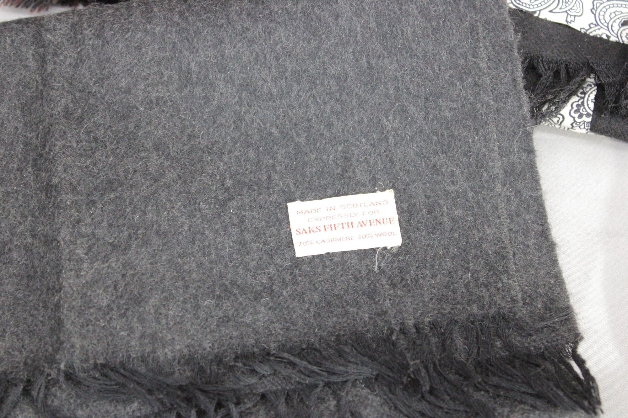 group lot of cashmere scarves in a variety of colors, patterns, and styles. The assortment includes solid colors, plaids, and classic woven designs in shades such as black, white, gray, blue, yellow, red, and neutral tones. Many feature traditional fringe ends and soft, lightweight warmth.
