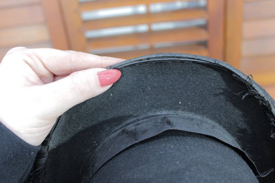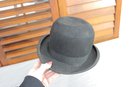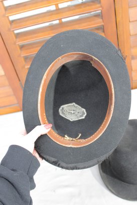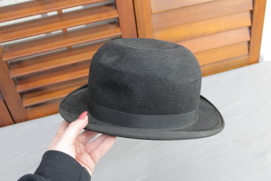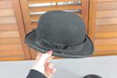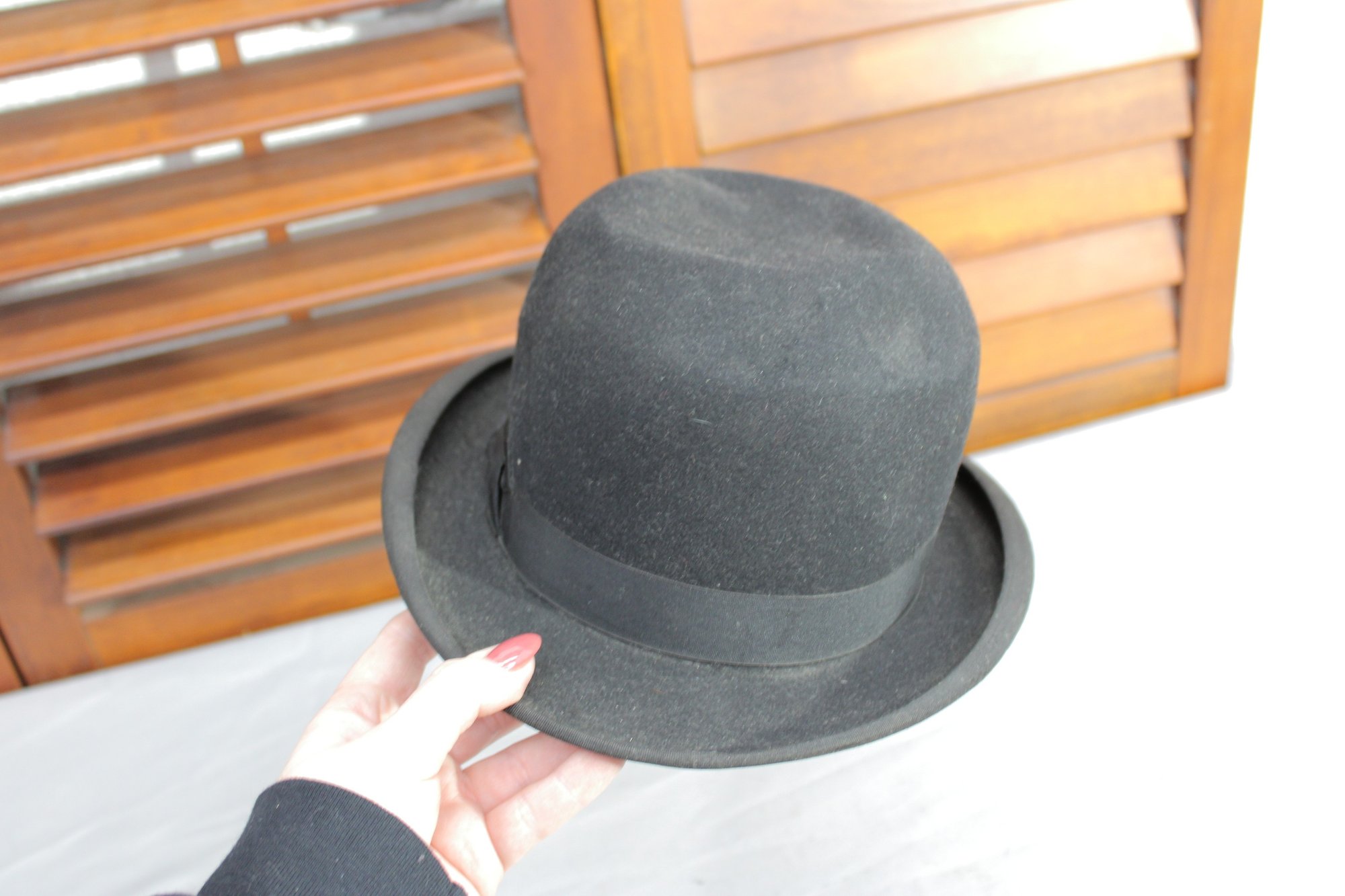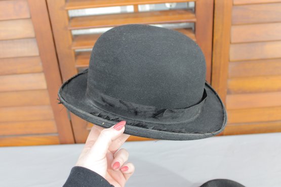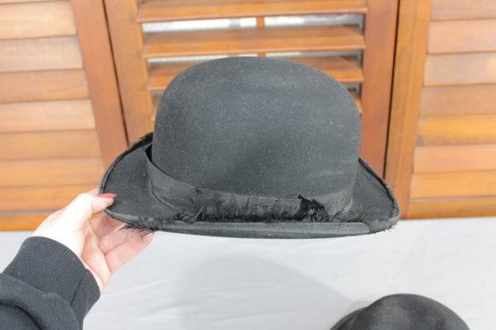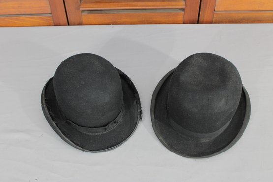 group lot of two vintage black bowler (derby) hats in classic timeless style. Both feature rounded crowns and narrow rolled brims, perfect for period fashion, costume use, display, or everyday vintage flair.