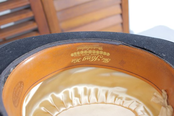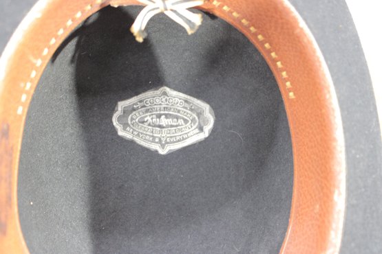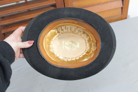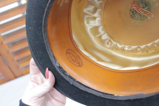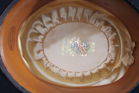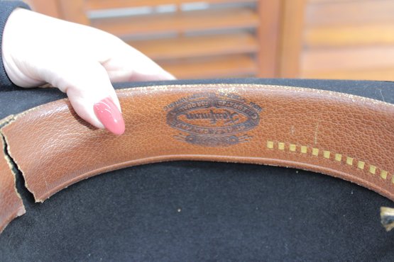 One hat shows a traditional ribbon band with subtle pleating, while the other has a clean, streamlined band. Interiors display vintage maker markings and natural wear consistent with age. These hats embody iconic early-to-mid 20th century style.