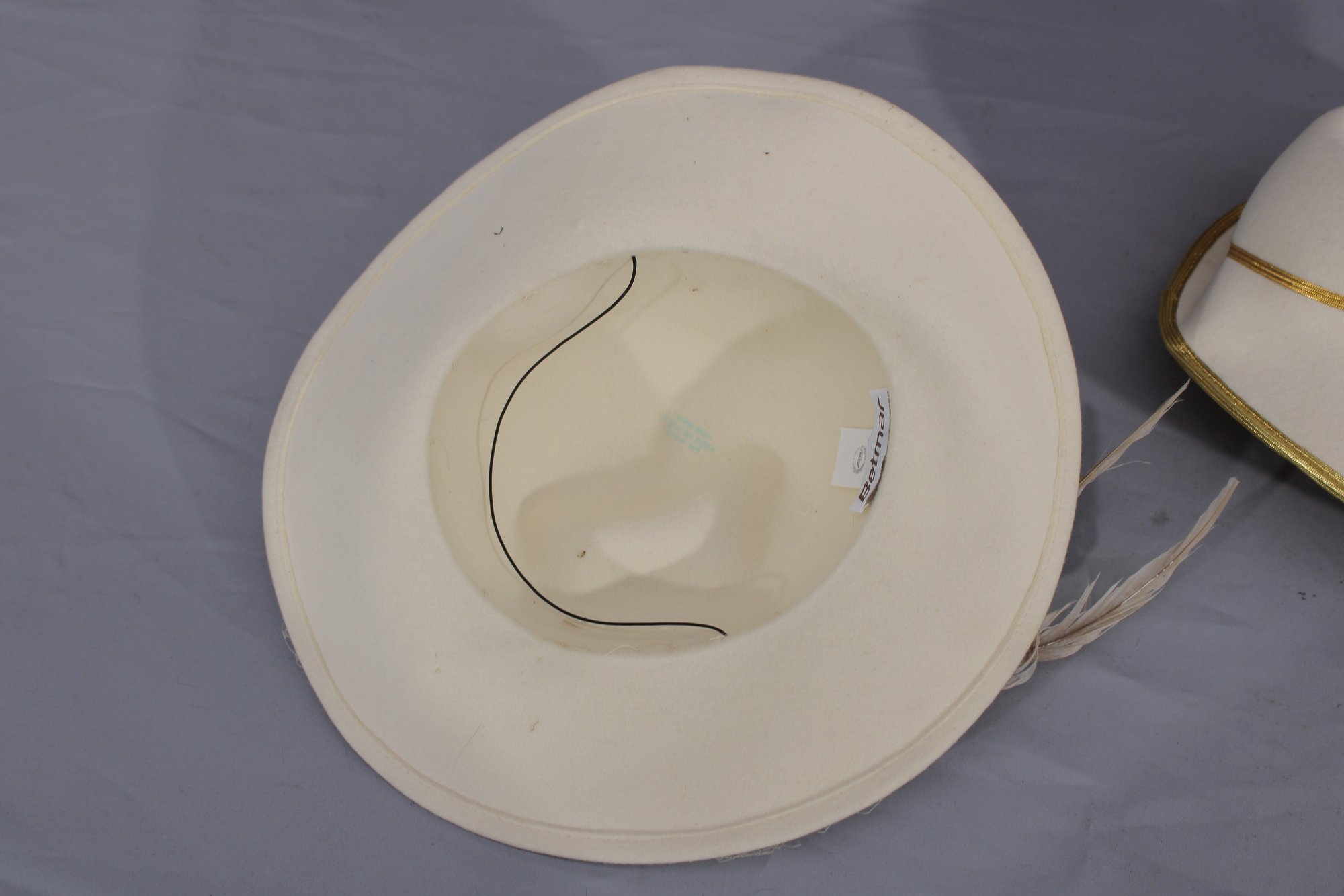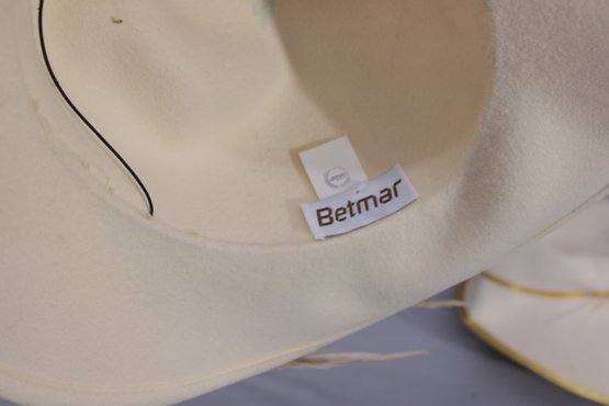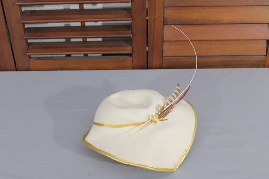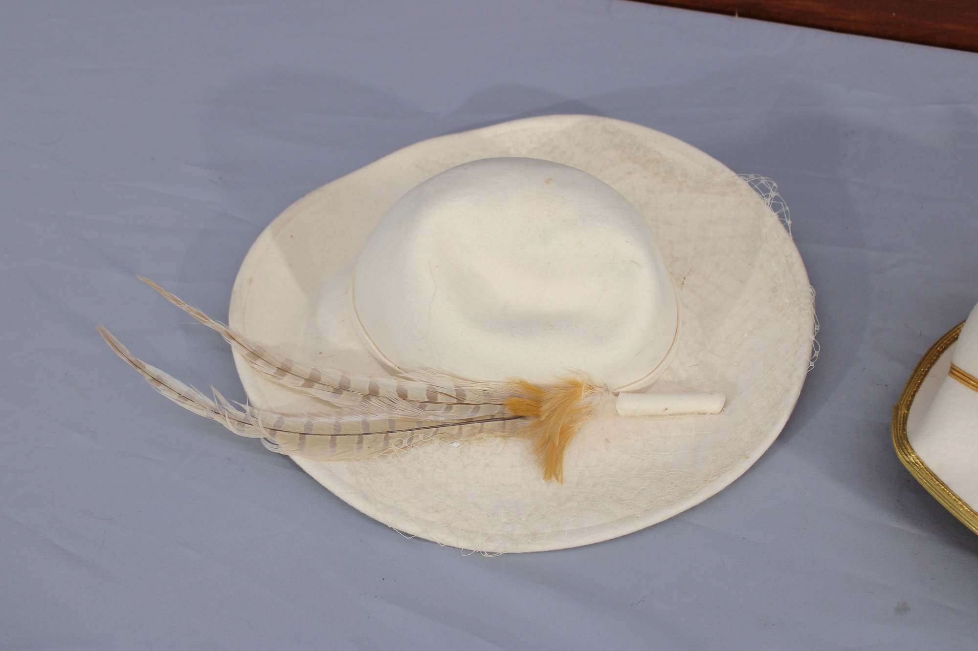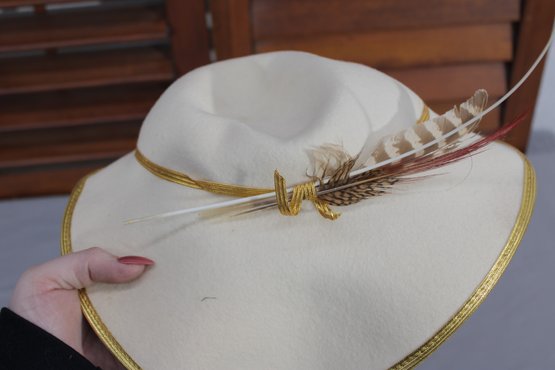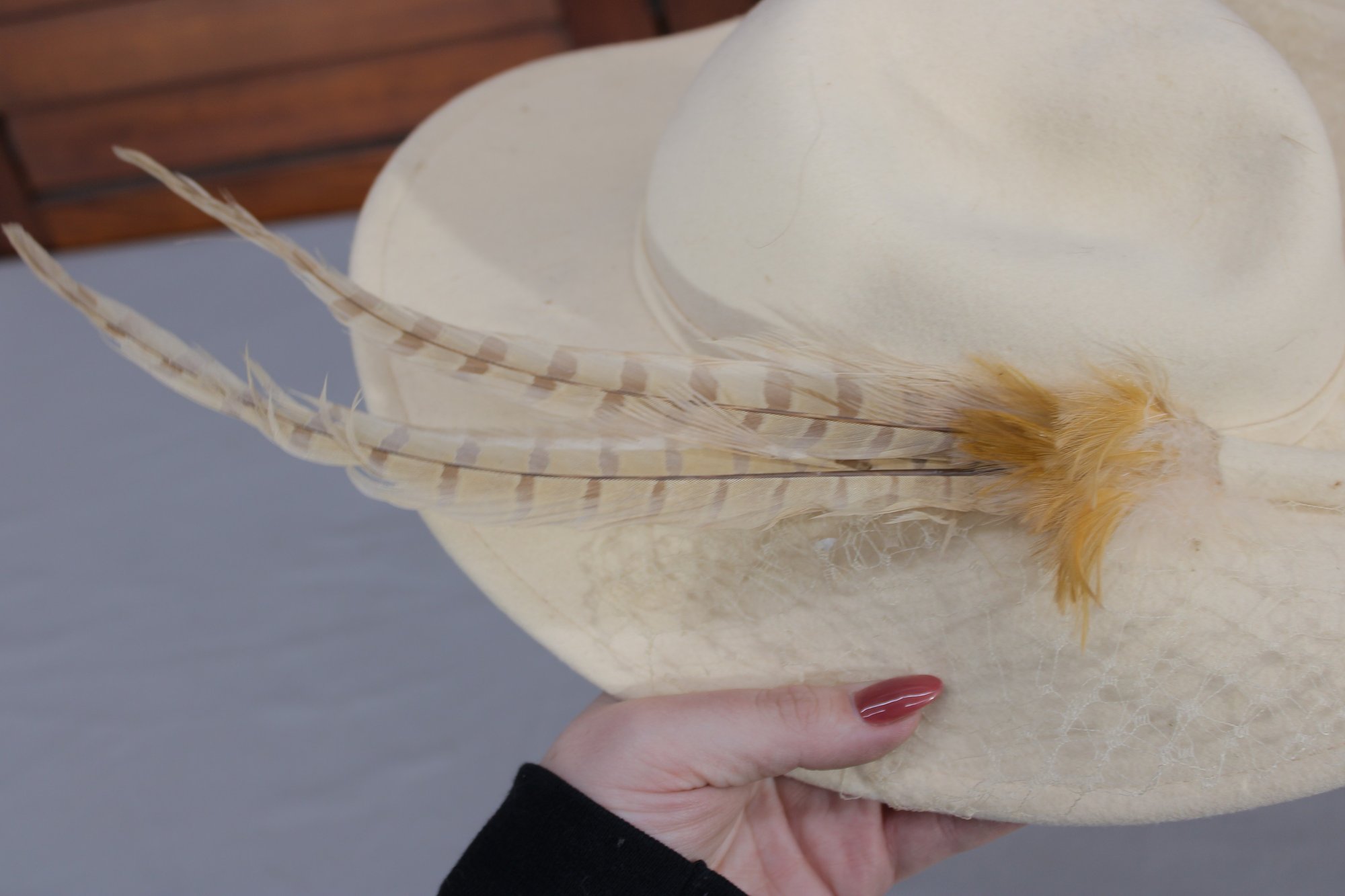 group lot of two vintage women’s felt hats in a classic ivory/cream color palette, each accented with beautiful feather details. These timeless hats are perfect for collectors, vintage fashion lovers, costume designers, or special occasion wear.