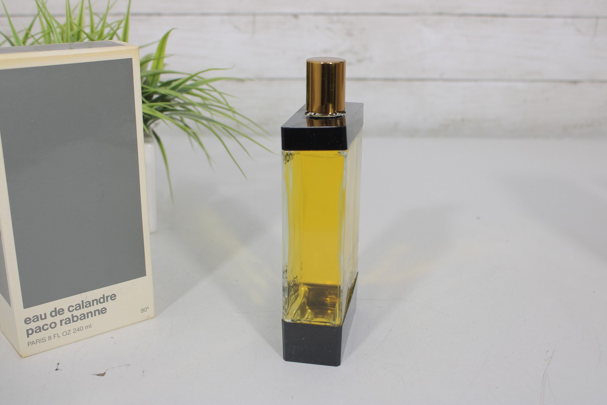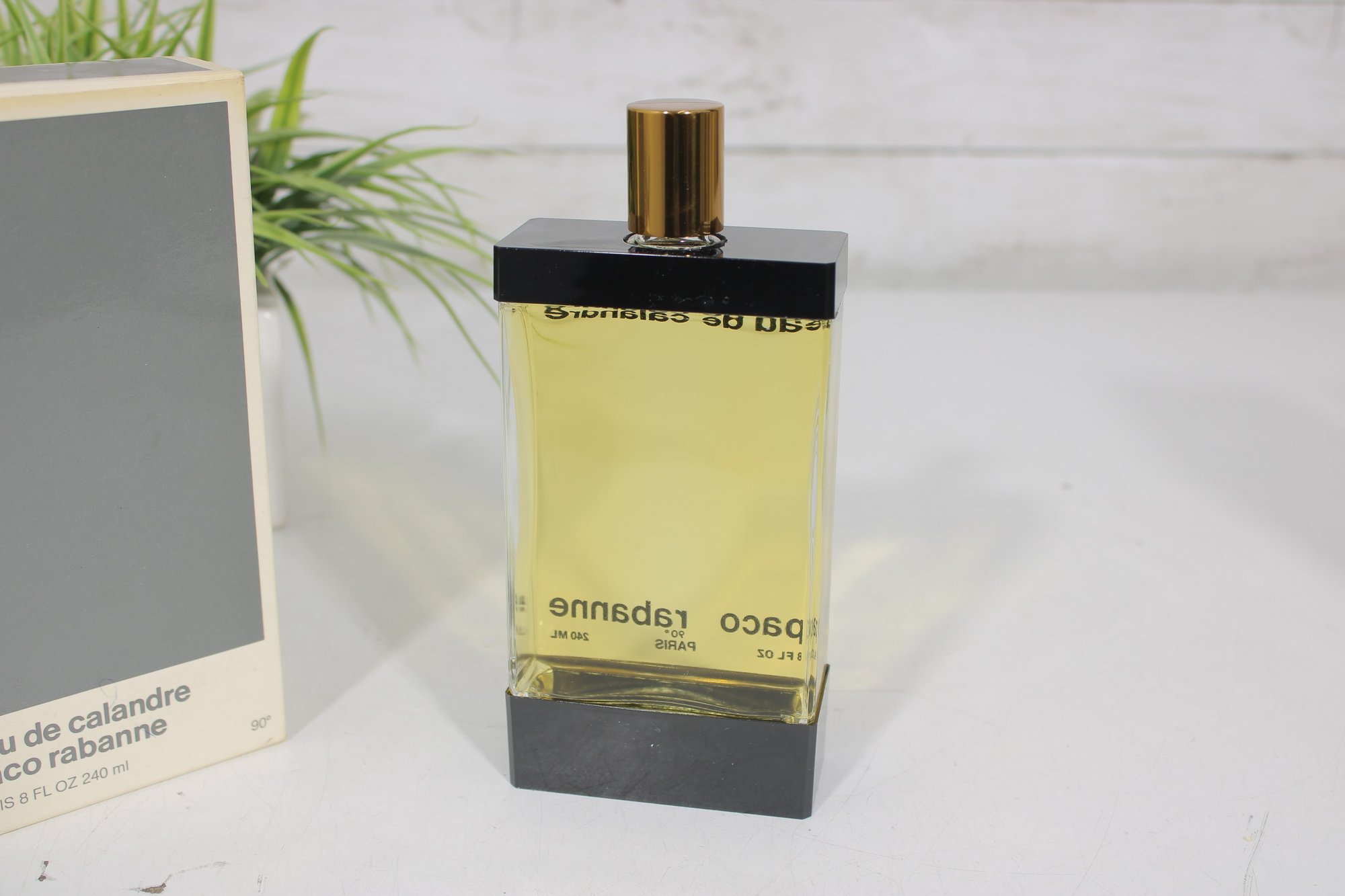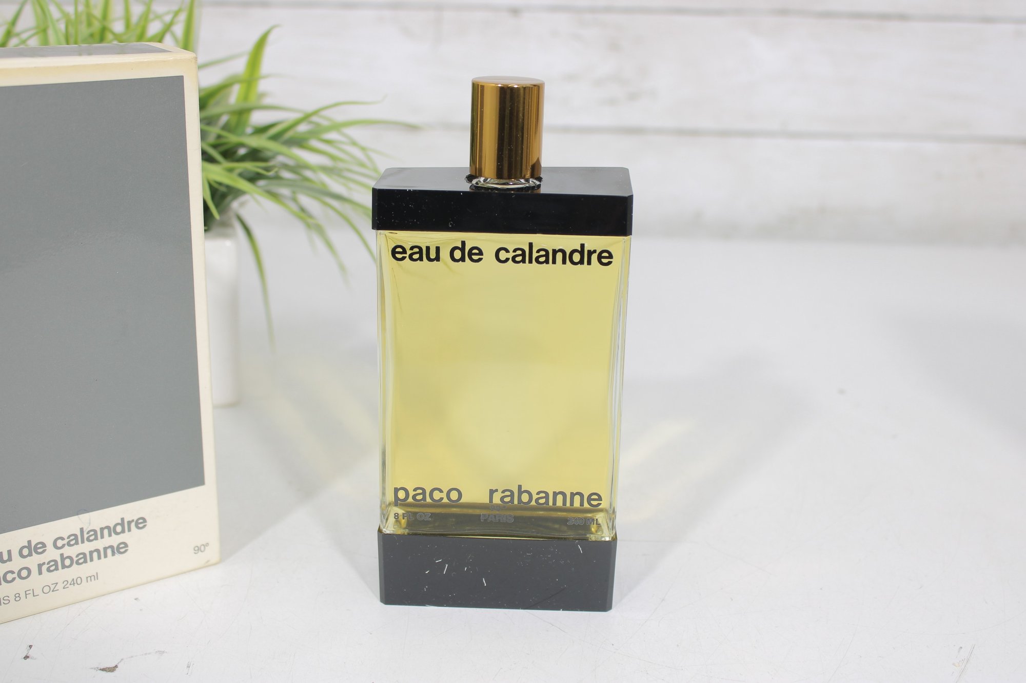 this impressive oversized format is highly desirable among collectors. Eau de Calandre is known for its crisp, elegant, and slightly metallic floral character — a bold and distinctive classic from Paco Rabanne.