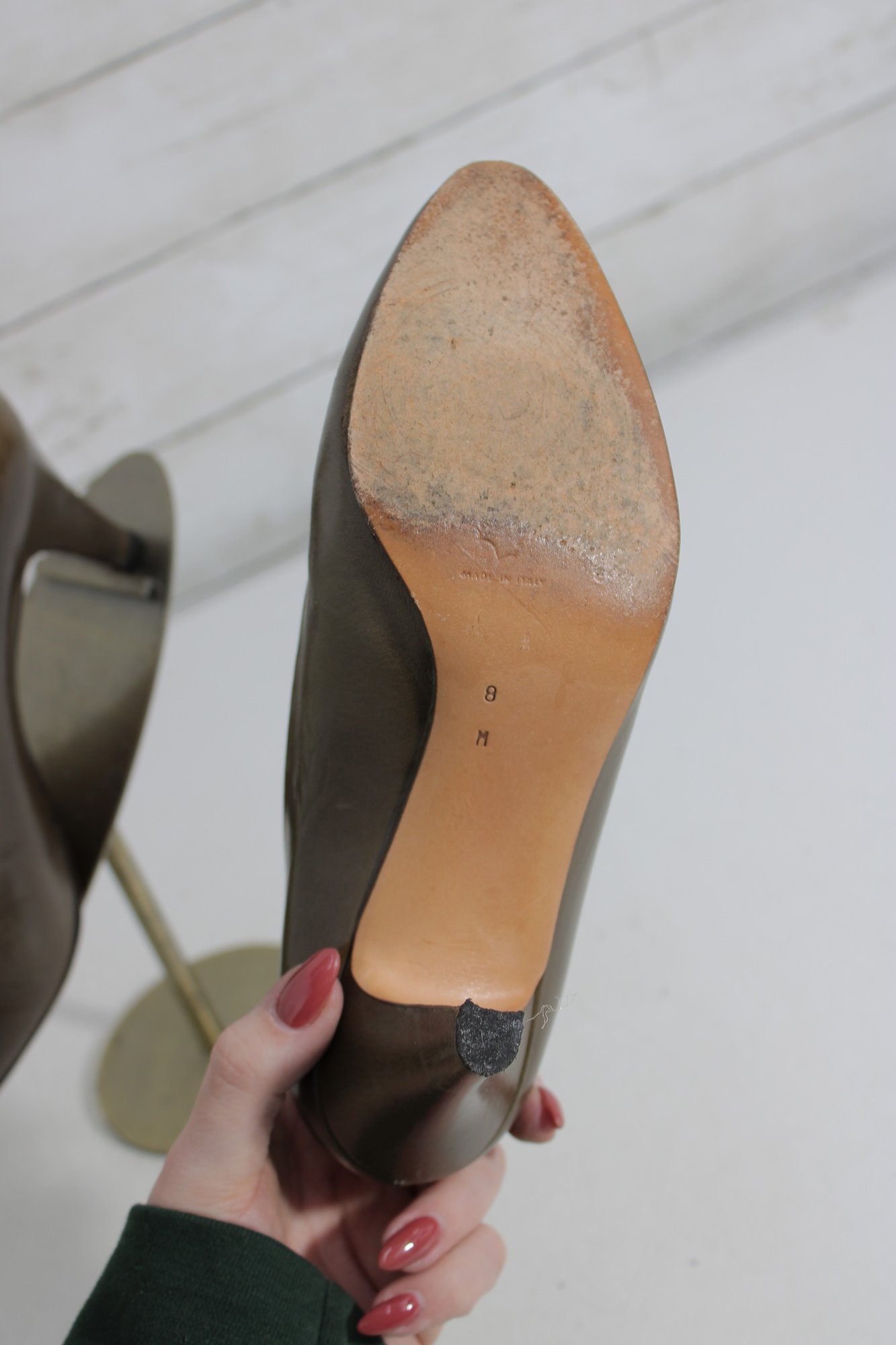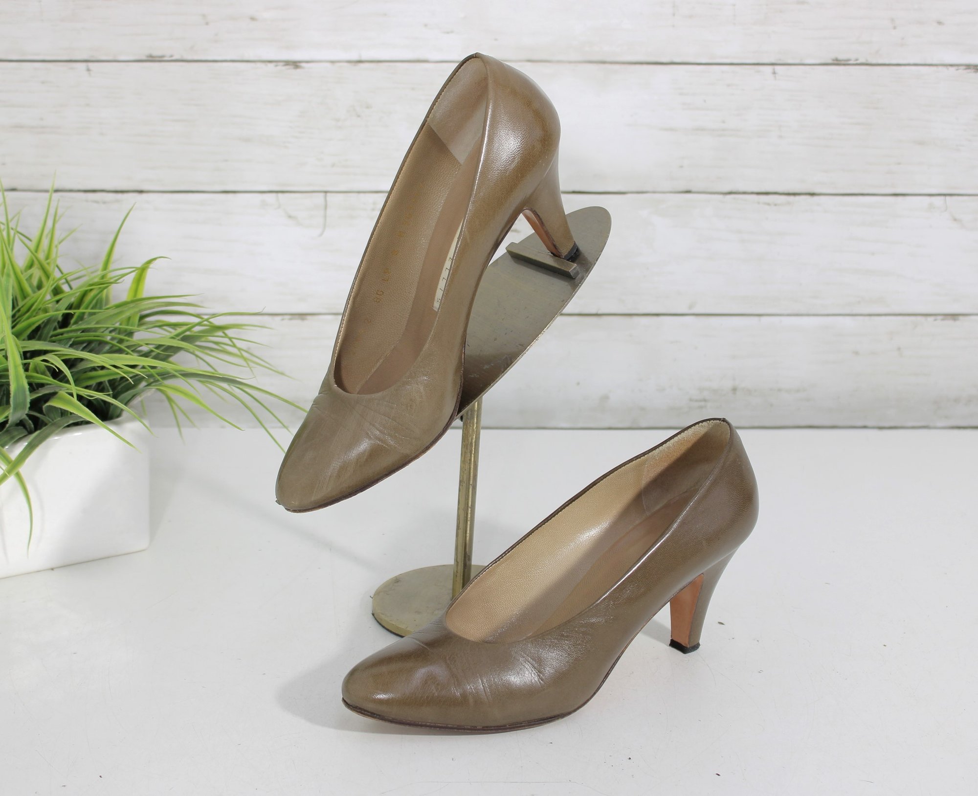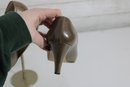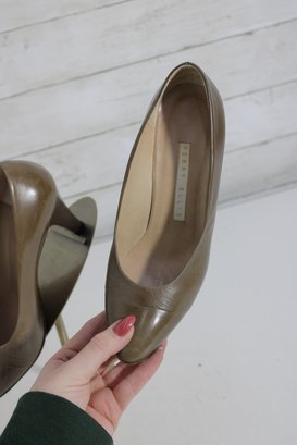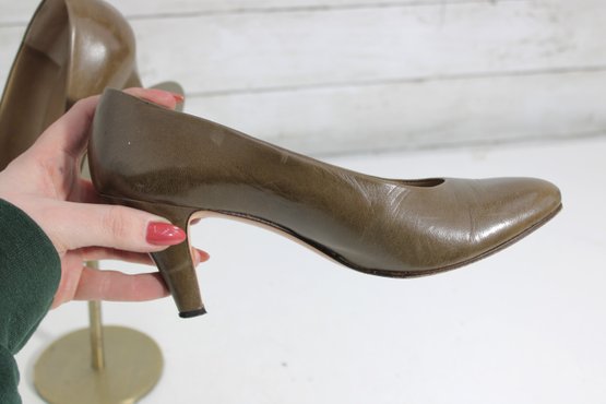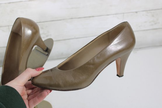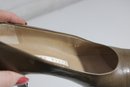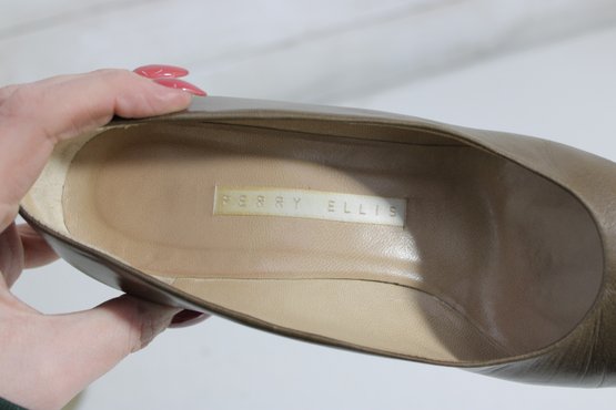 brown leather pumps by Perry Ellis, designed with a sleek pointed toe and elegant mid-height heel for a classic, versatile look.