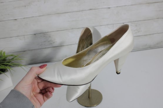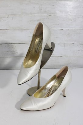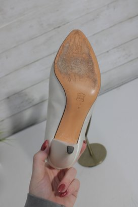 these Bruno Magli leather pumps showcase elegant Italian craftsmanship in a classic ivory/cream tone. The sleek pointed-toe design and graceful mid-height heel make them perfect for formal occasions, workwear, or bridal and evening styling.