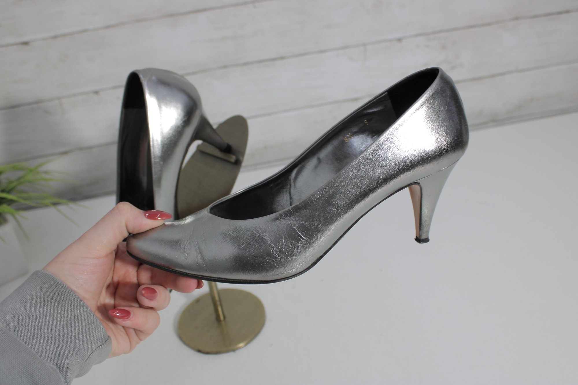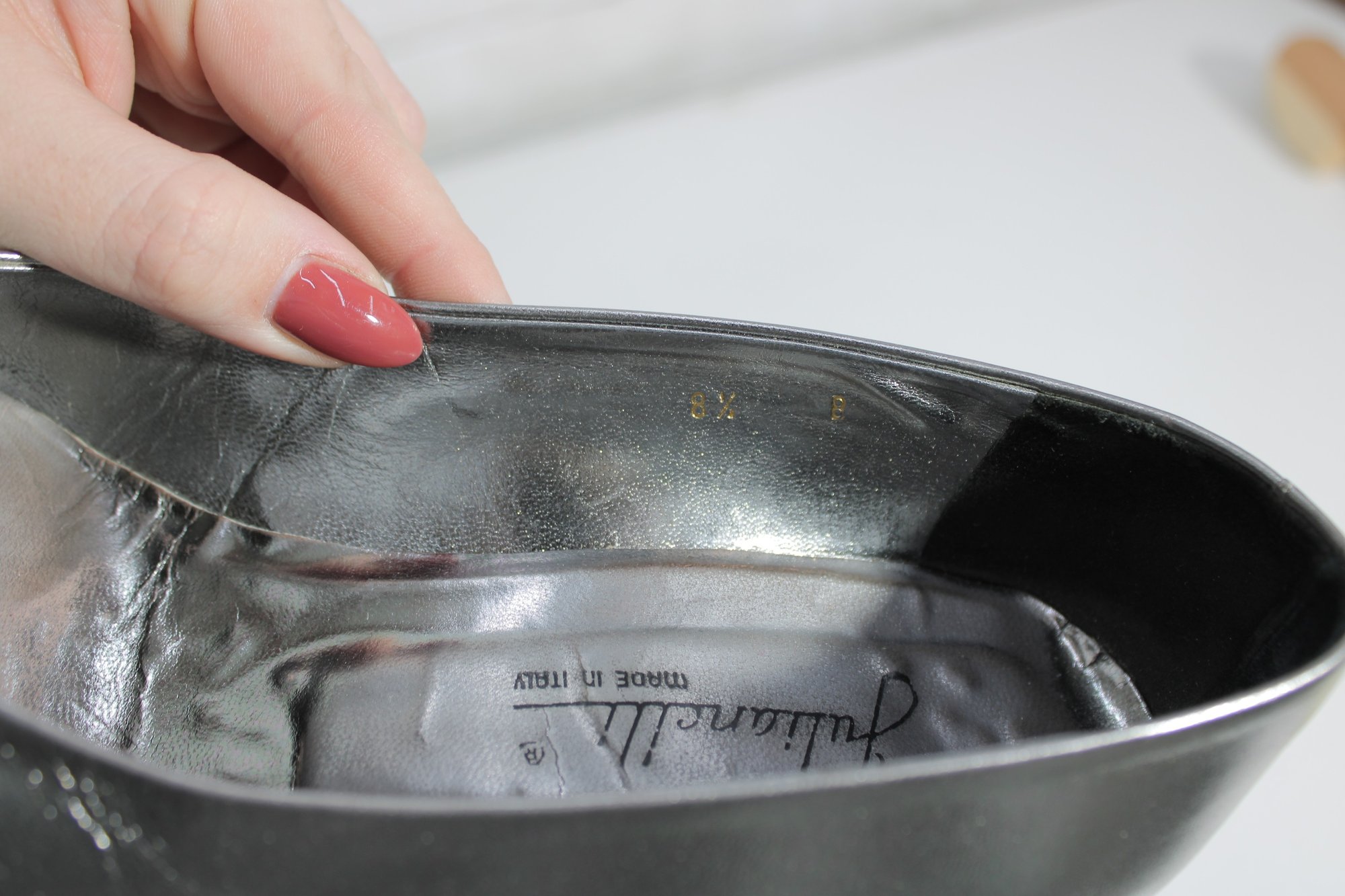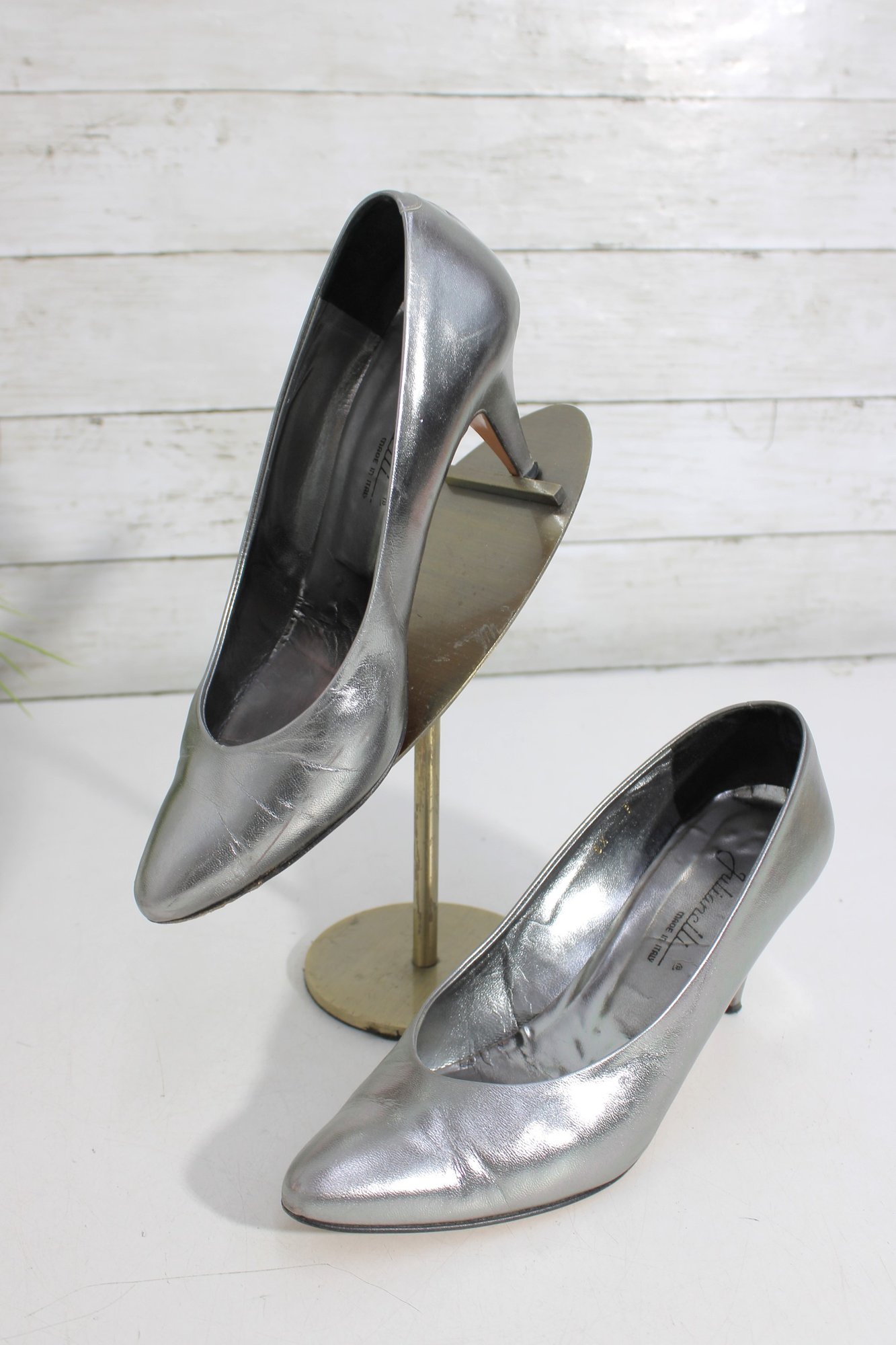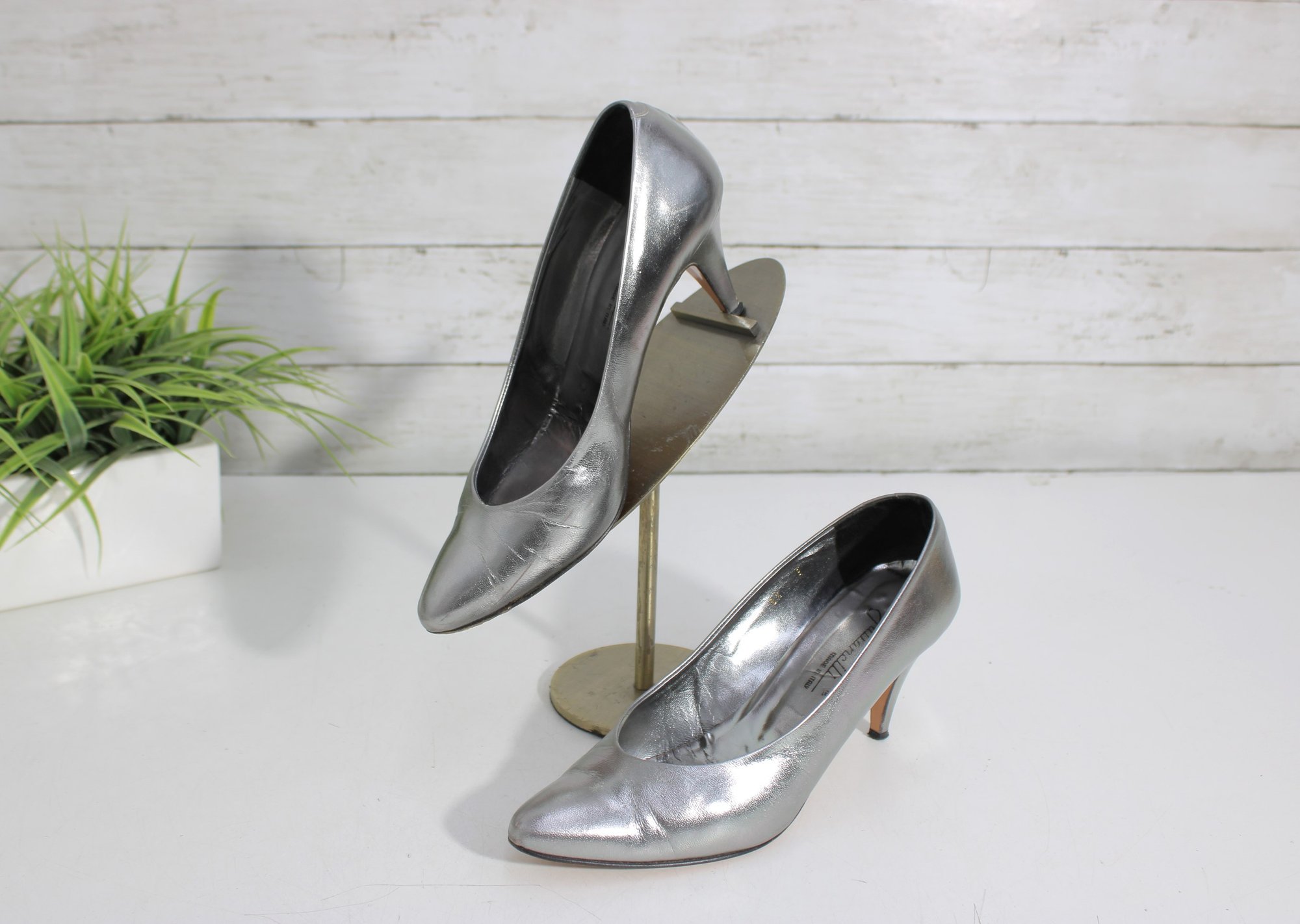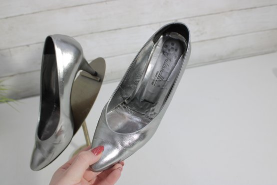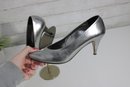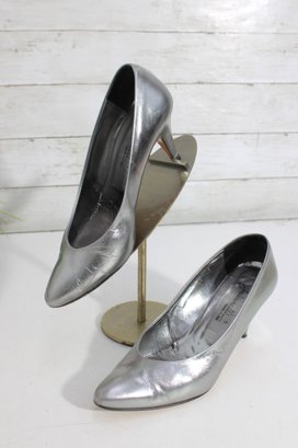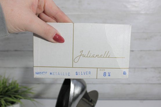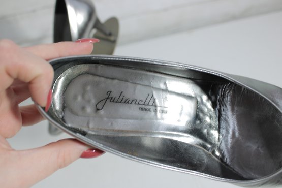 Striking and sophisticated, these Julianelli metallic silver pumps showcase timeless Italian craftsmanship with a modern, elegant finish. The smooth metallic leather adds a subtle shine, while the classic pump silhouette and slender heel create a refined, flattering look.