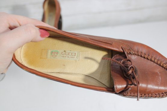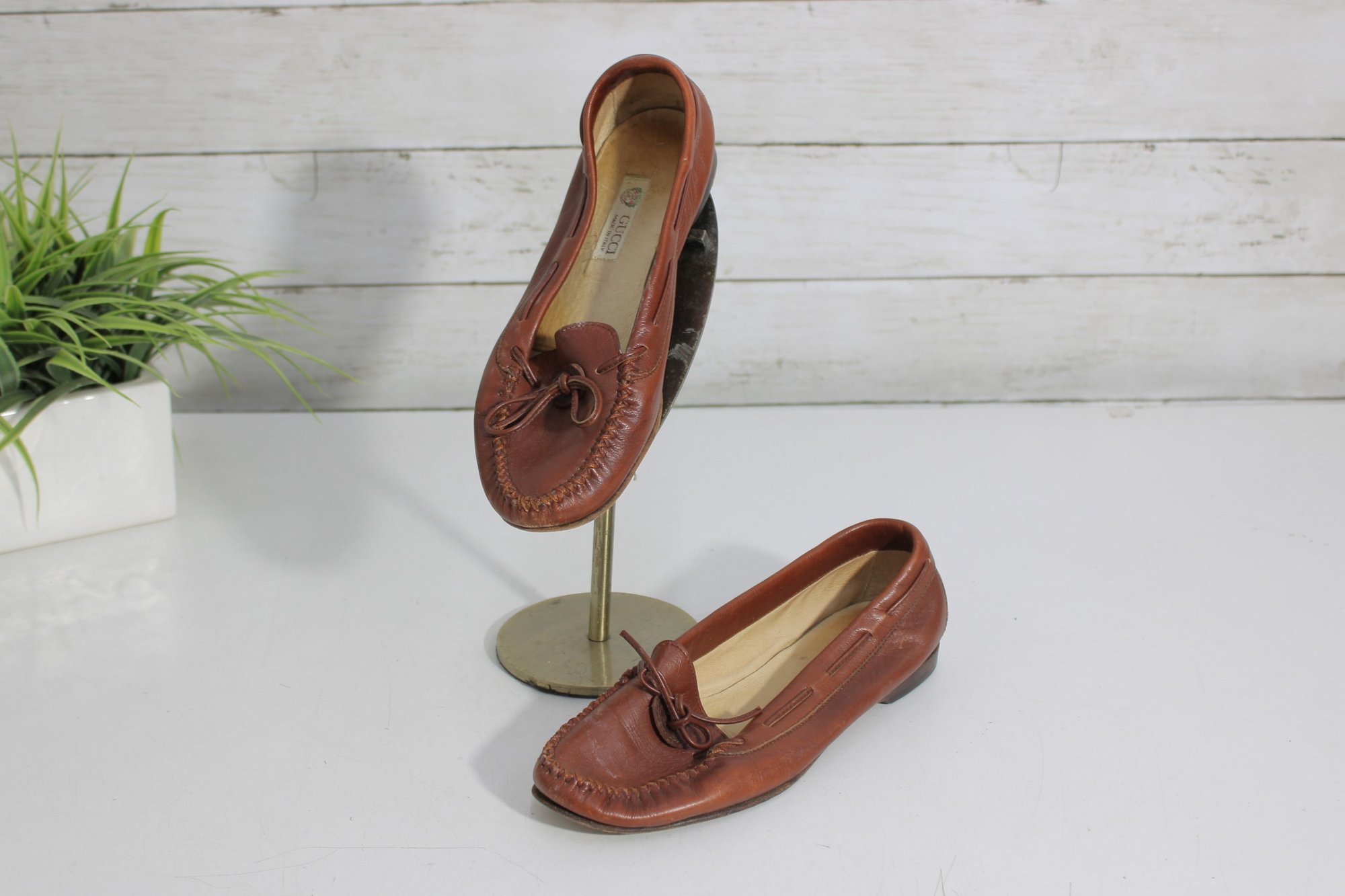 Timeless and effortlessly stylish, these Gucci leather driving loafers are a classic addition to any wardrobe. Crafted from rich brown leather, they feature traditional moccasin stitching, a soft rounded toe, and a low-profile sole for comfortable everyday wear.