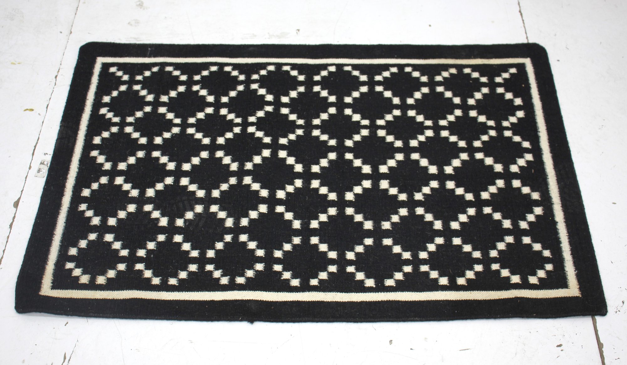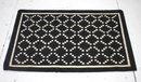 This elegant handcrafted rug measures 48.5 inches by 30 inches and features a striking black and white geometric pattern. The classic design is composed of interlocking circles and squares, adding a modern yet timeless touch to any room. Perfect for an entryway, living room, or bedroom, this rug brings a bold visual element with its high-contrast design.