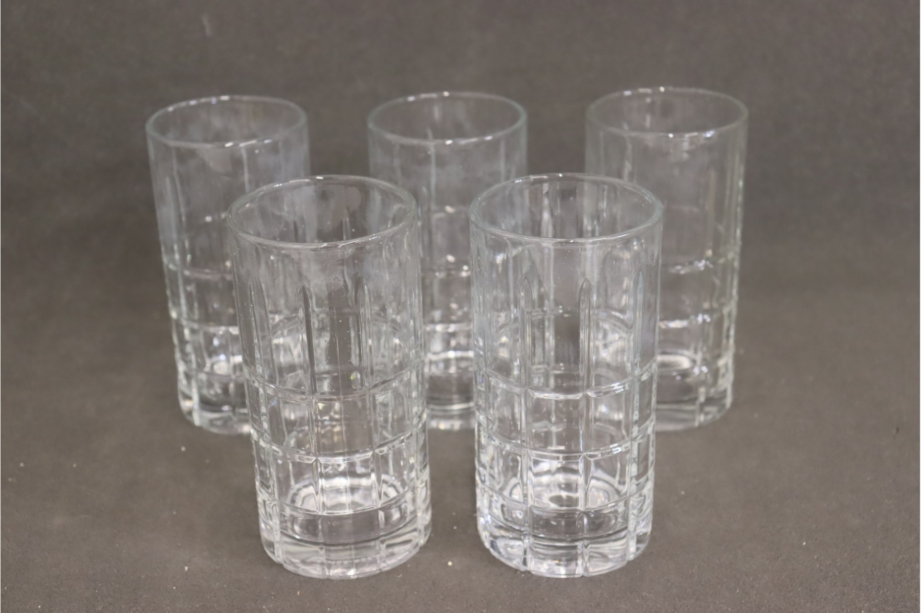 5 Anchor-Hocking High-Ball Glasses - Stacked Square & Spear Pattern