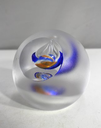 The piece features a beautifully frosted glass sphere with an internal swirling composition of vibrant blue and amber hues, reflecting light brilliantly. The cut-out section enhances its unique aesthetic, allowing for different perspectives of the stunning internal design.