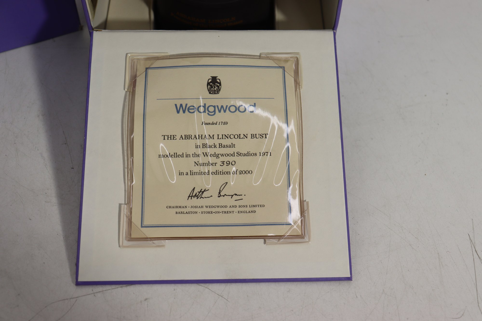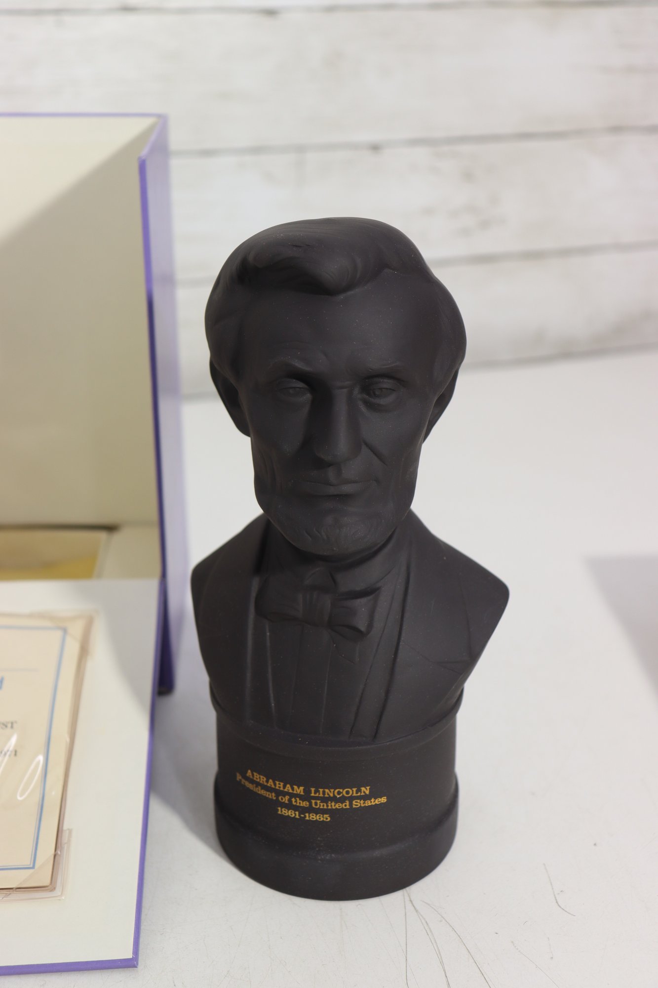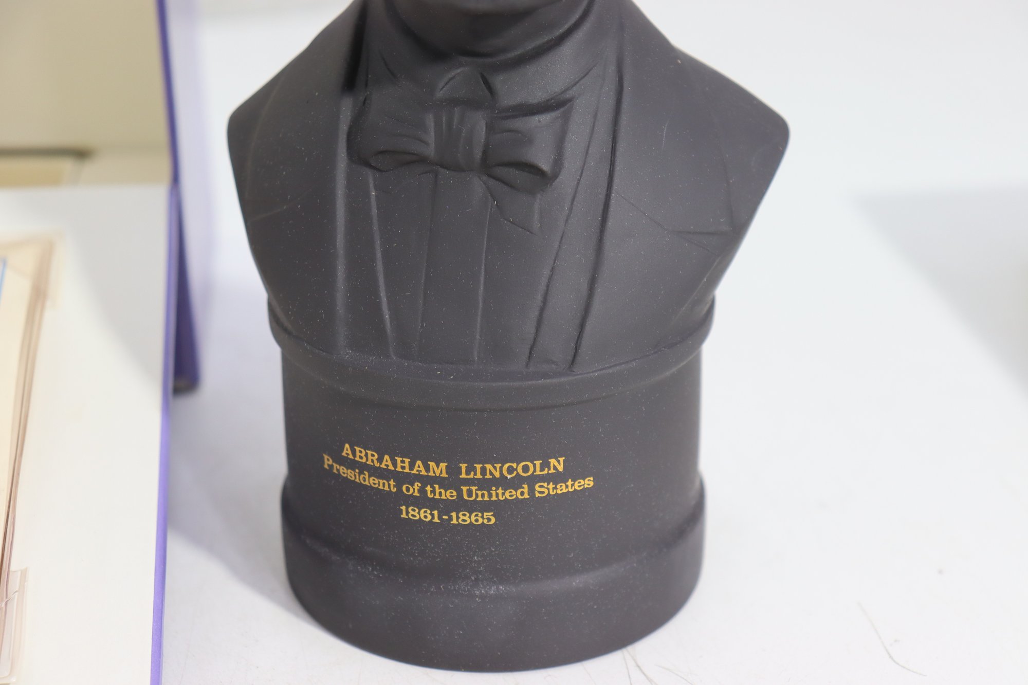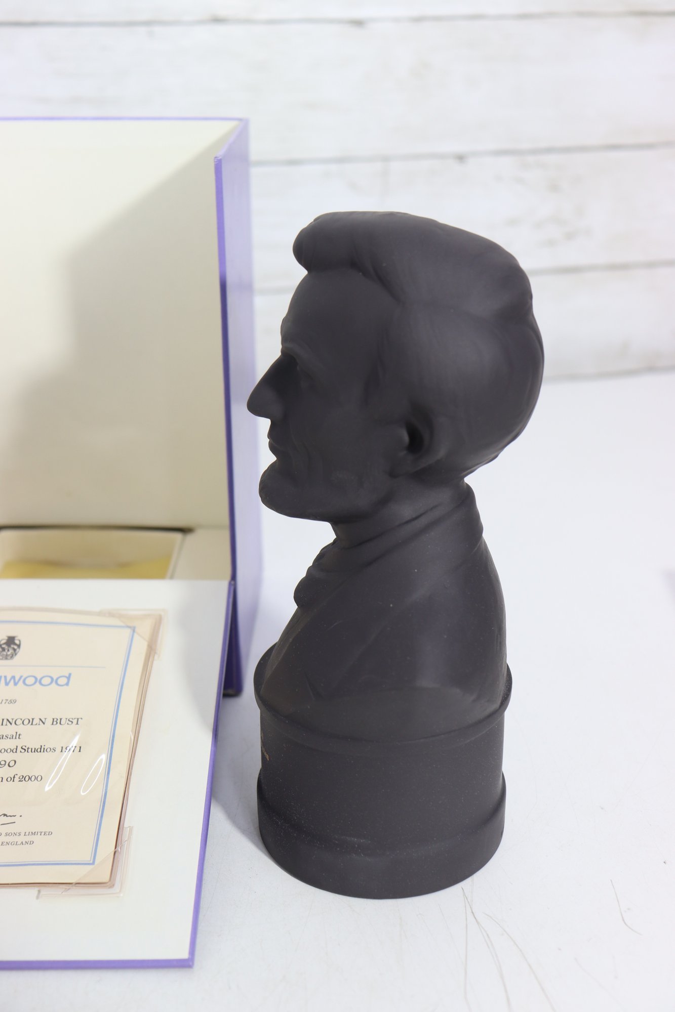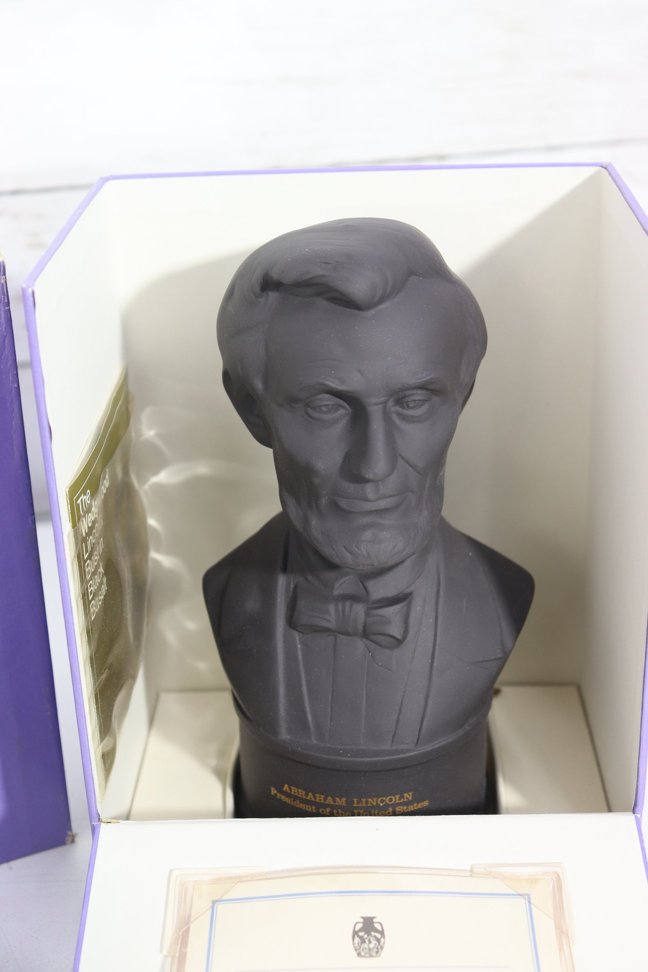 Wedgwood Black Basalt bust of Abraham Lincoln, finely modeled and produced as a limited edition commemorative piece. The bust depicts Lincoln with dignified expression and crisp period detail, mounted on an integral base with gilt lettering identifying him as “Abraham Lincoln – President of the United States, 1861–1865.”