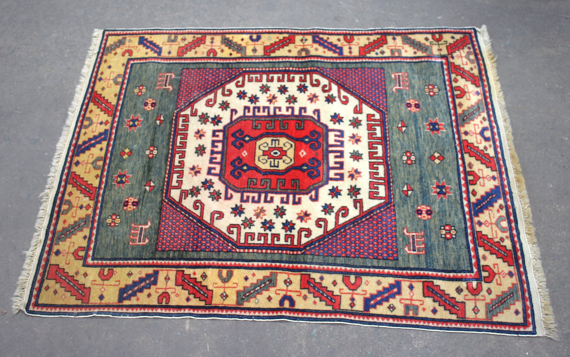 This beautiful 51" x 39.5" hand-woven wool rug features a striking tribal geometric design, rich in cultural motifs and bold colors. The central octagonal medallion is surrounded by intricate patterns in red, blue, ivory, and gold, creating a visually stunning piece.