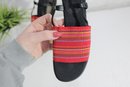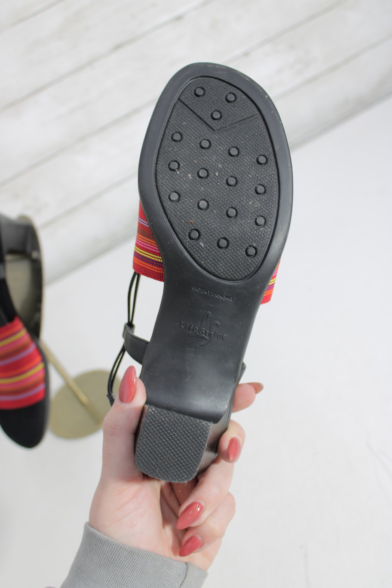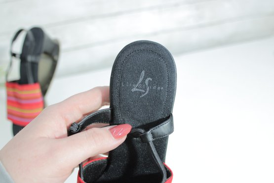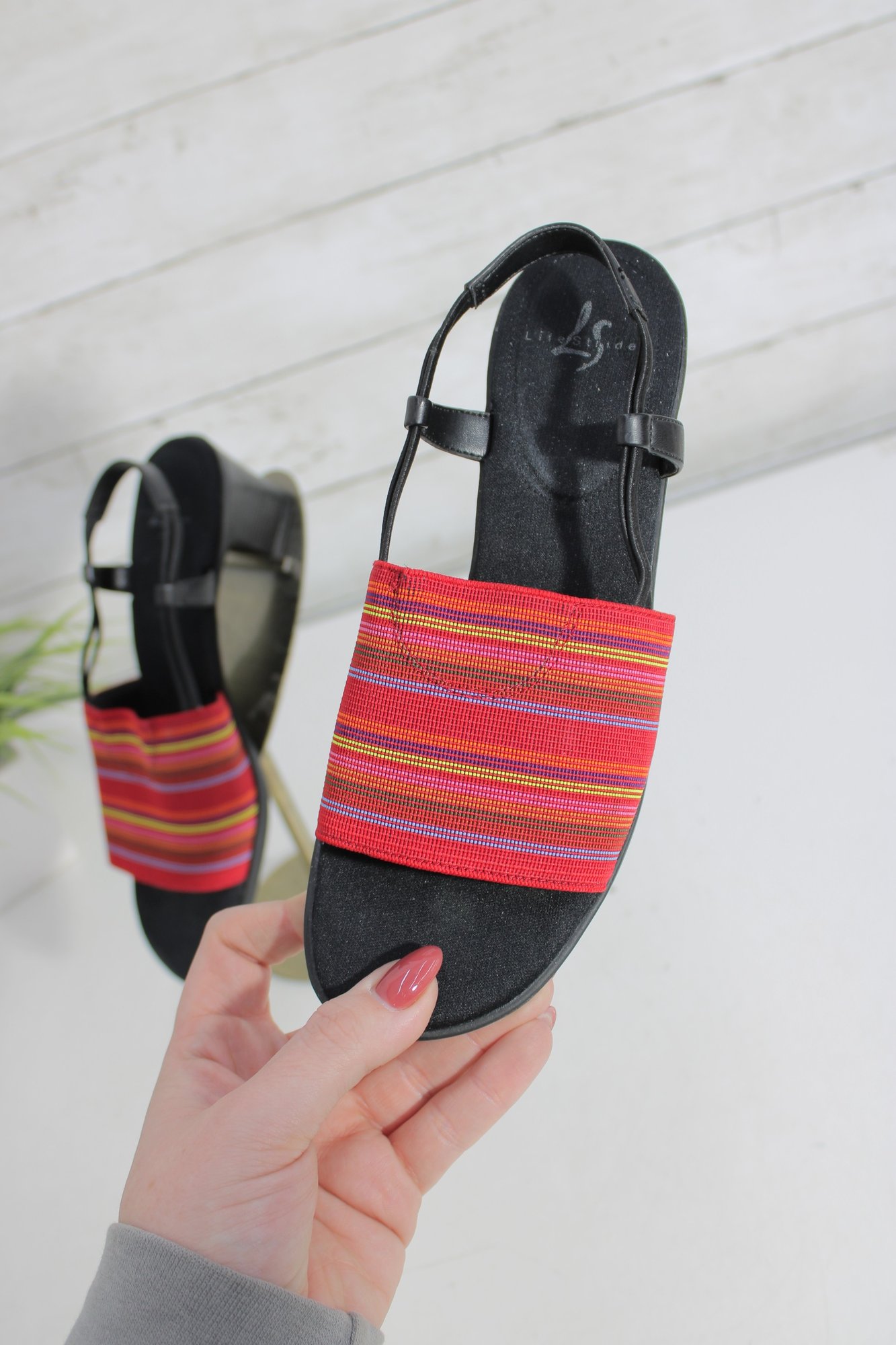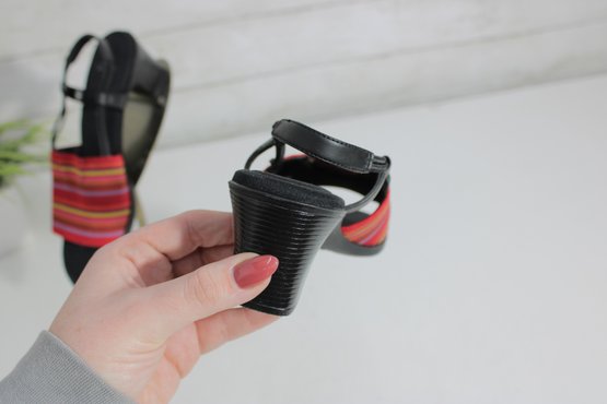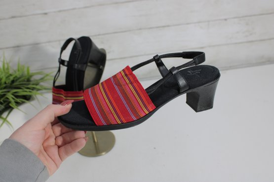Add a pop of color to your warm-weather wardrobe with these stylish life stride heeled sandals. Featuring a bold red and multicolor striped fabric strap set against a classic black base, these sandals strike the perfect balance between fun and versatile.