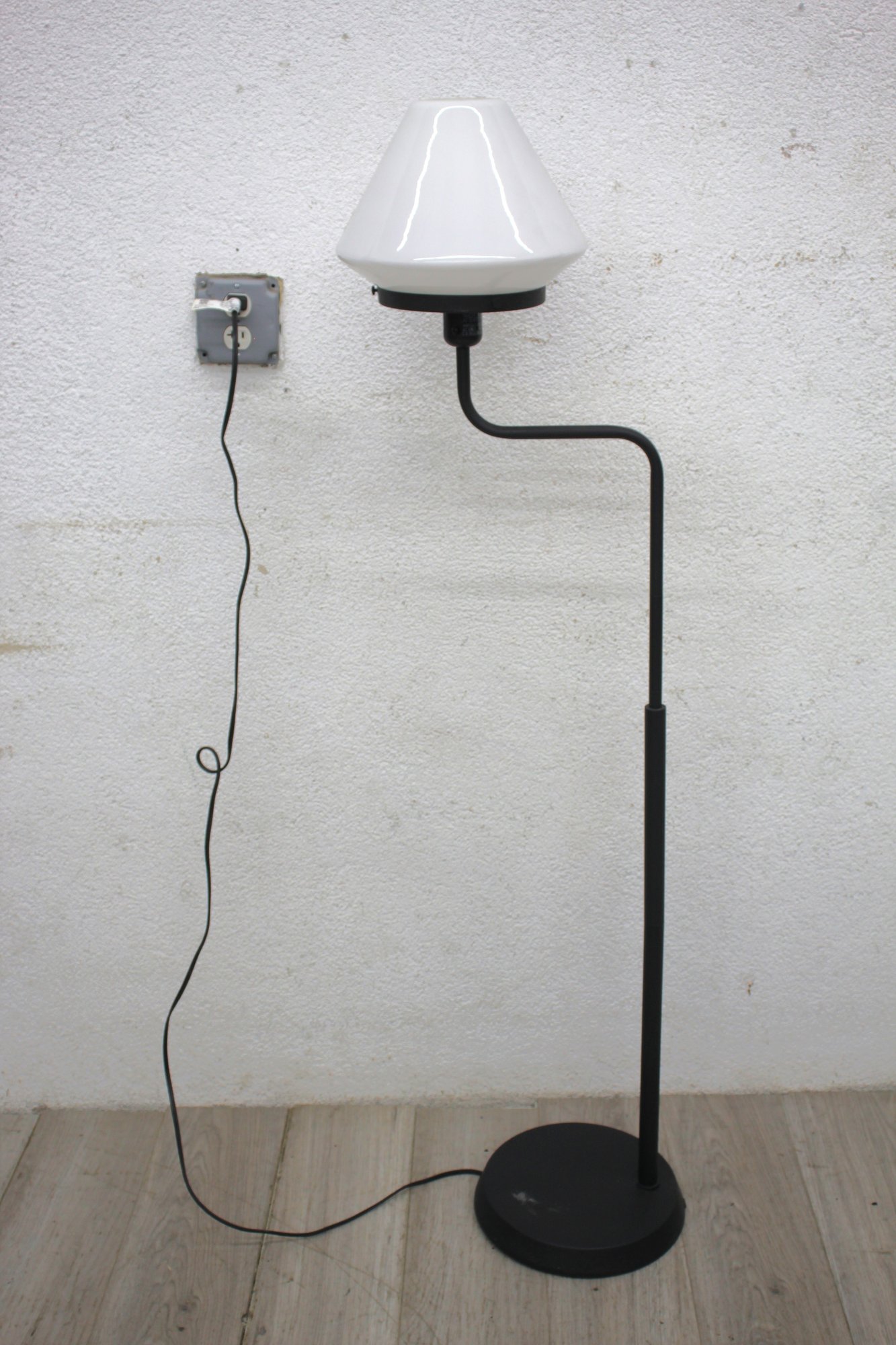 This stylish 55-inch tall floor lamp features a unique design with an adjustable arm and a white conical shade. The black metal base and frame give it a sleek, modern look, while the frosted shade provides a soft, warm glow, ideal for reading or ambient lighting. With its compact and versatile design, this lamp is perfect for a variety of spaces, including living rooms, bedrooms, or offices.