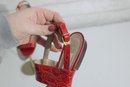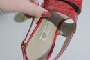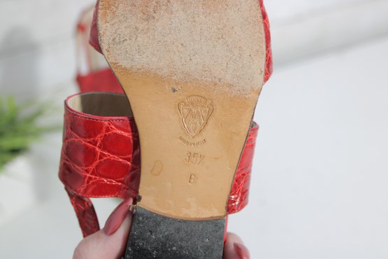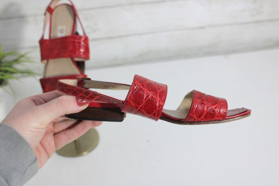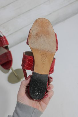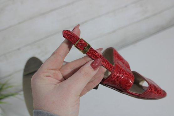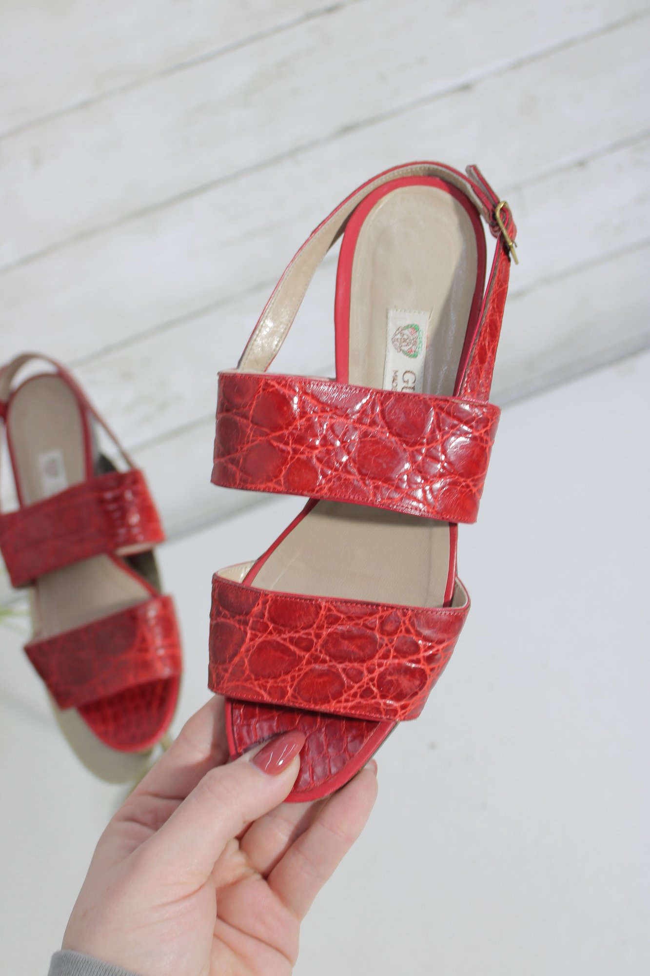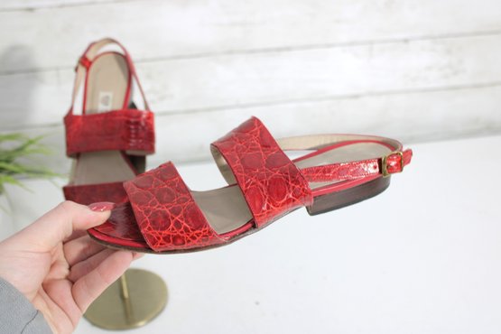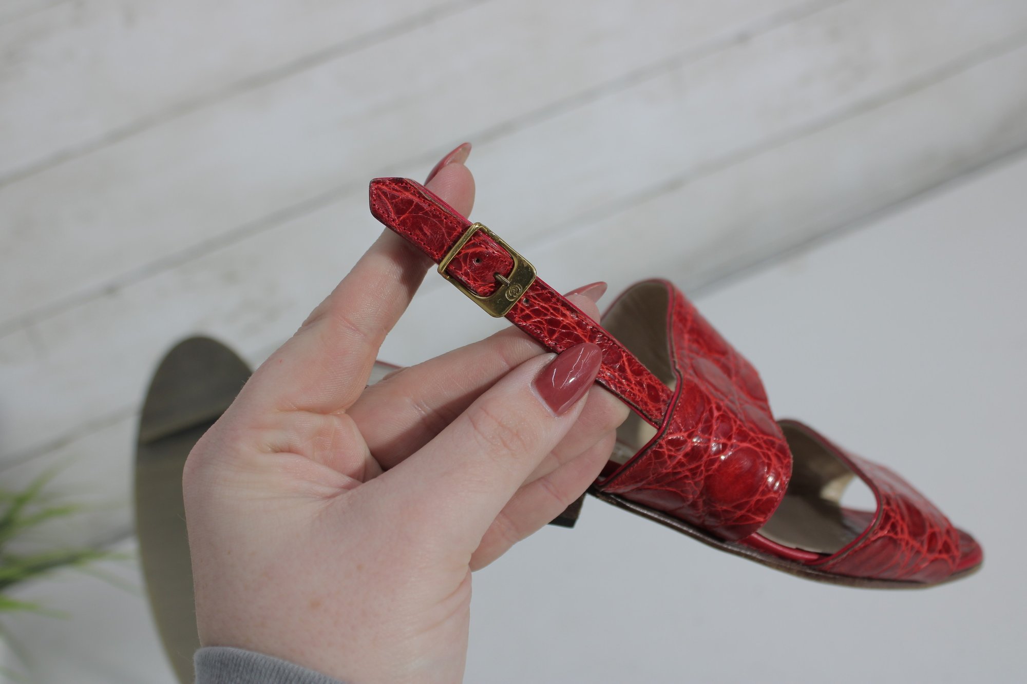 these Gucci leather sandals feature a striking red croc-embossed finish that adds instant sophistication to any outfit. Crafted in Italy, they showcase Gucci’s signature quality and timeless design.