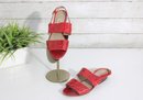 The sandals feature a comfortable flat/low profile with dual wide straps across the foot and an adjustable ankle strap for a secure, flattering fit. Perfect for warm-weather wear, travel, or elevating casual looks with a touch of designer style.