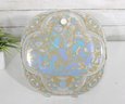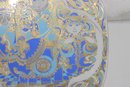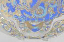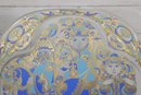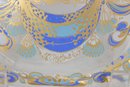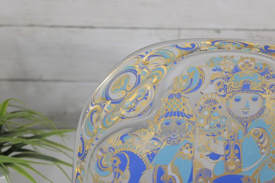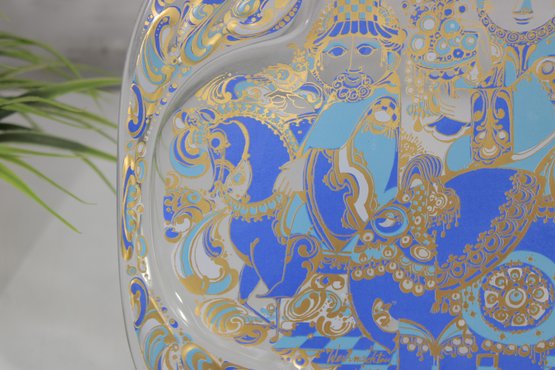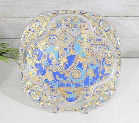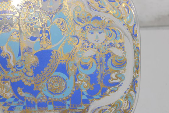 The design features richly detailed figures in brilliant gold and vivid blue tones, surrounded by intricate decorative scrollwork. The luminous crystal surface enhances the vibrant colors and fine linework, making this plate both a festive holiday piece and a striking work of art.